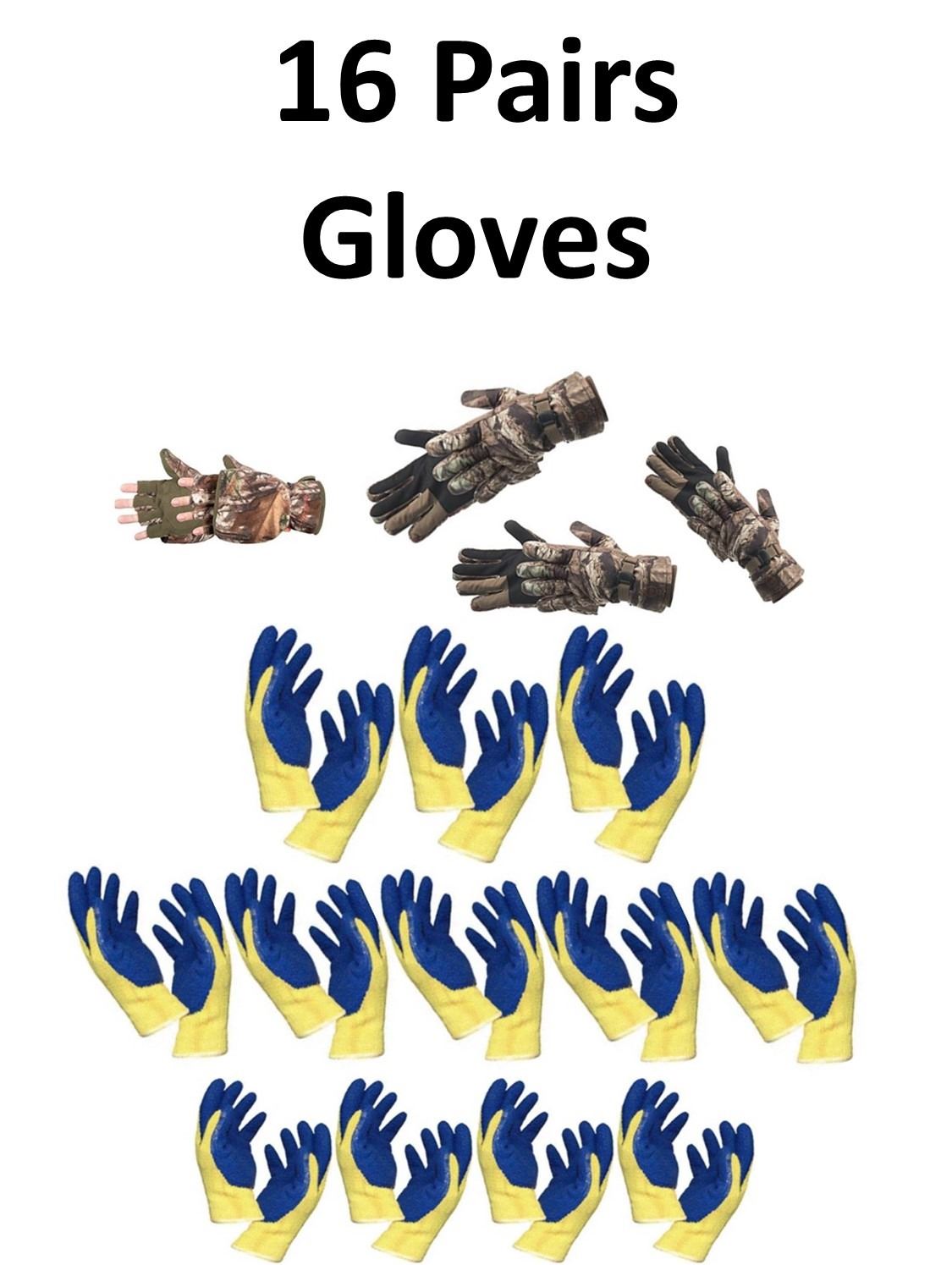 16 x Pair Gloves, 4 x Manzella, 1-Womens Bow Hunter Convertible S, 3 x Tracker, 1-L, 1-M, 1-S, 12 x Weston Products Kevlar, 3-XL, 5-M, 4-S