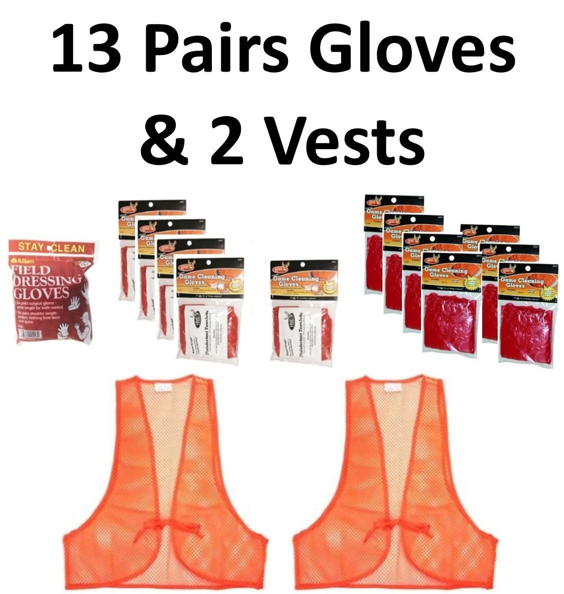 13 x Pair Gloves & 2 Vests, 1 x Allen Co. Latex 6pk, 14 x HME, 5-Game Cleaning w/towelette, 7-Single Game Cleaning, 2 x Allen Co. Mesh Blaze Orange Vests