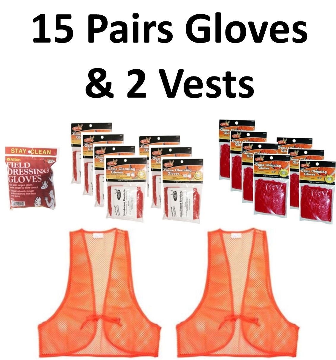 15 x Pair Gloves & 2 Vests, 1 x Allen Co. Latex 6pk, 14 x HME, 7-Game Cleaning w/towelette, 7-Single Game Cleaning, 2 x Allen Co. Mesh Blaze Orange Vests