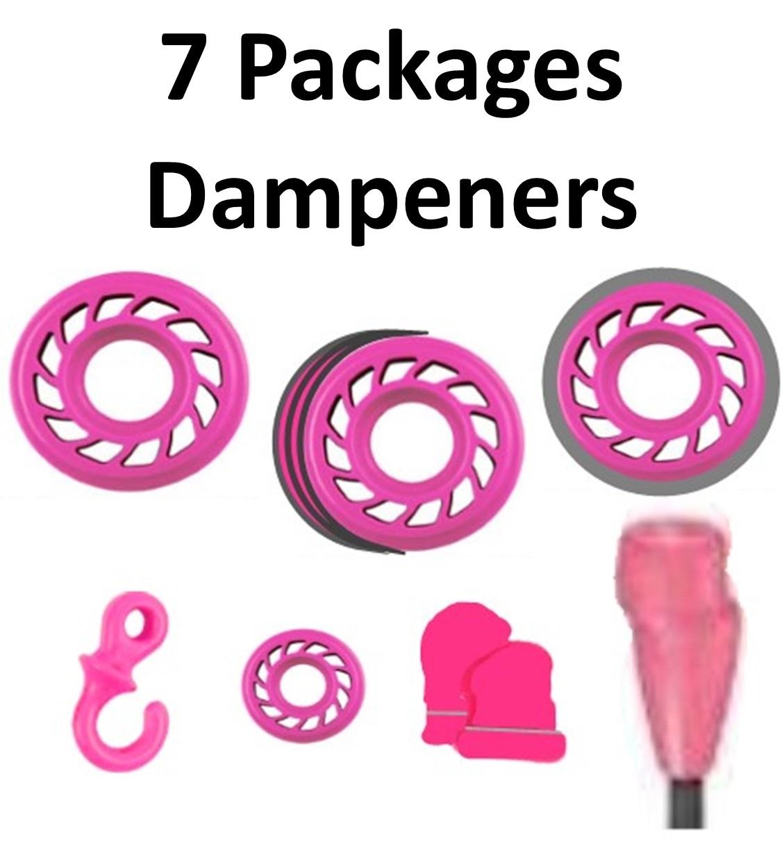 7 x Mathews Dampeners, 1-3/8" Harmonic Pink, 1-3/4" Harmonic Pink, 1-Rubber Pink/Grey Lite, 1-Monkey Tails Pink, 1-Mini Harmonic Pink, 1-String Suppressor Orange, 1-String Stop (round) Pink