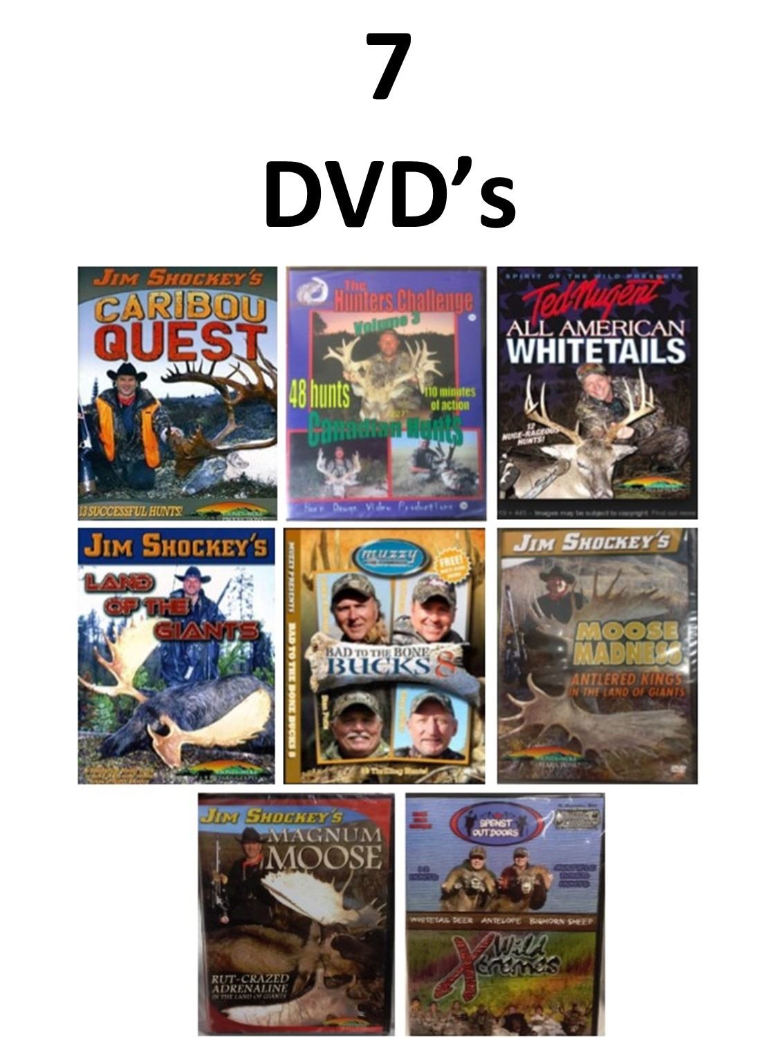 8 DVD's, Caribou Quest, The Hunters Challenge 3, All American Whitetails, Jim Shockey's Land of The Giants, Bad to the Bone BUCKS 8, Moose Madness, Magnum Moose, Xtreme Wild