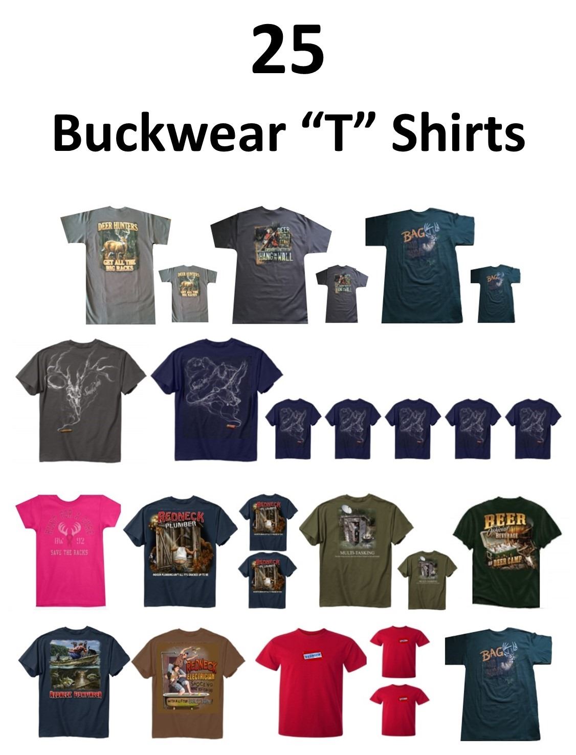 26 x Buck Wear T-Shirts, 2-Deer Hunters Get All The Big Racks M, Deer Come To My Tree Stand M, Deer Come To My Tree Stand XXL, 2-Xtreme Bucks M, Smoke Skull M, 6 x Smoke Duck 1-XXL, 2-L, 3-M, Hunt for a Cure M, Redneck Plumber M, L, Redneck Multi Tasking S, Beer the Offical Bevrage M, Redneck Fishfinder S, Redneck Electrician XXXL, Redneck Tape M, L, Xtreme Bucks XL