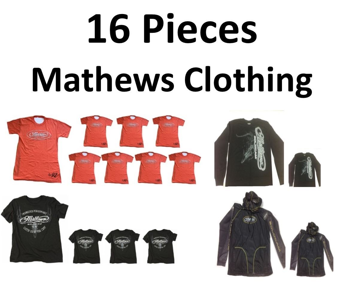 16 x Mathews Clothing, 8 x Blaze Orange 1-2XL, 4-XL, 3-L, 2 x LS Black/Grey, 1-L, 1-XL, 4 x Outfitter, 1-M, 1-L, 1-XL, 1-2XL, 2 x Performance Hoodie, 1-L, 1-XL