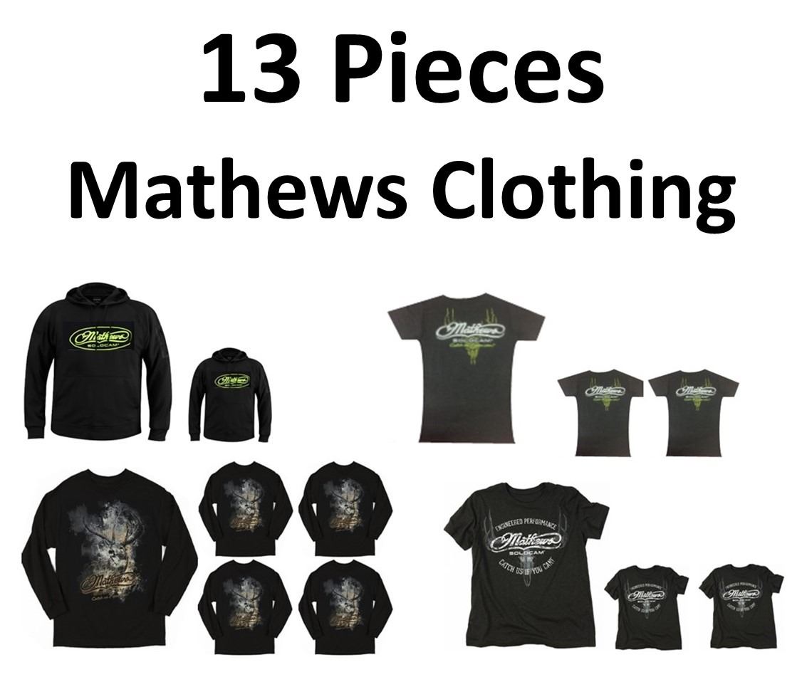13 x Mathews Clothing, 2 x Hoodie Green Logo, 1-2XL, 1-M, 11 x Shirts, 2-Charcoal Neon Green XL, 1-Charcoal Neon Green L, 2-Elusive L, 3-Elusive XL, 1-Outfitter M, 2-Outfitter L