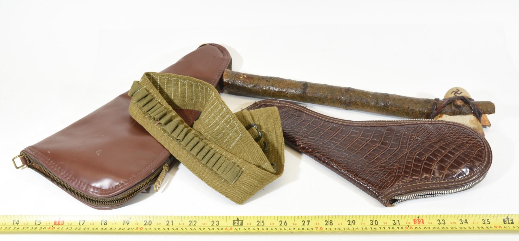 1) Faux leather pistol case 14" long, 6" tall. 2) Faux crocodile pistol case 13" long, 7" tall. 3) OD green rifle cartridge bandolier. 4) Reproduction tomahawk.