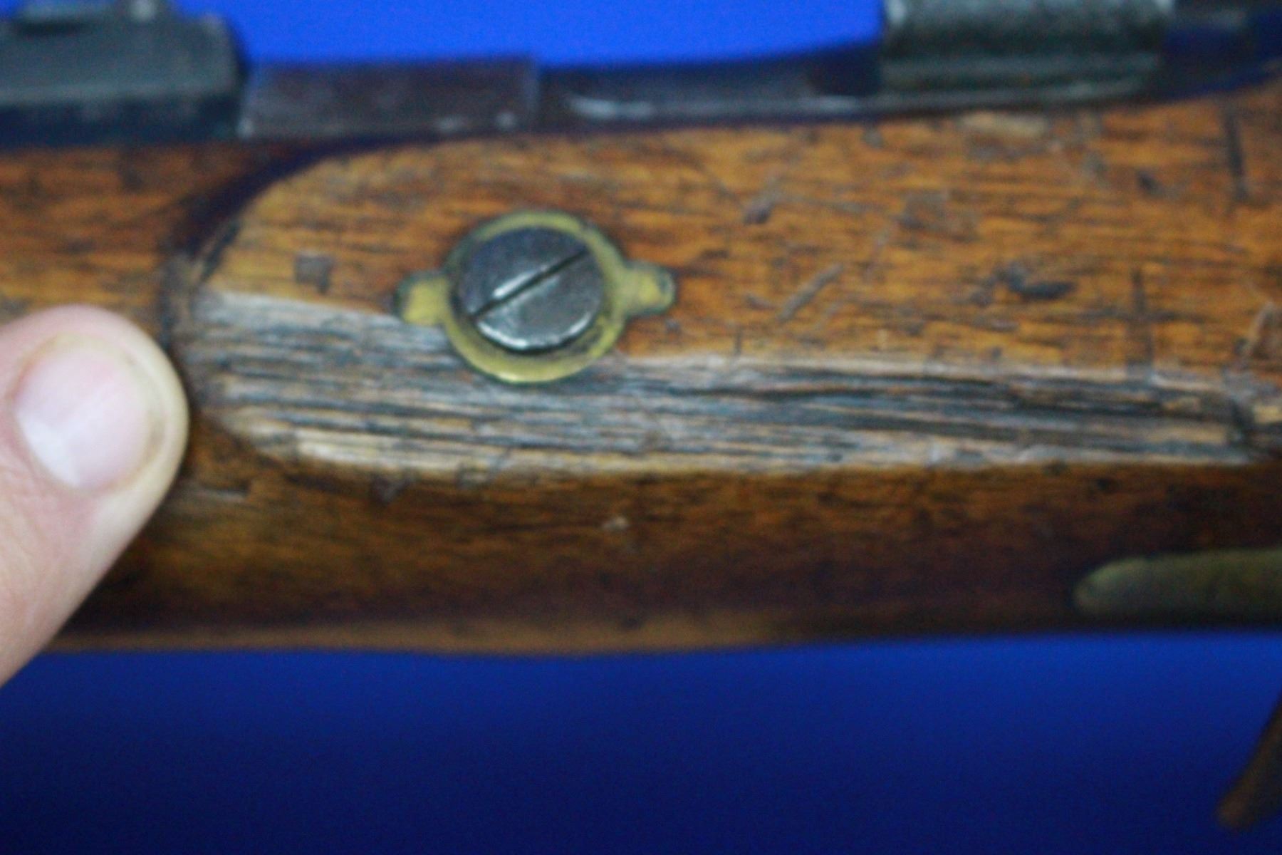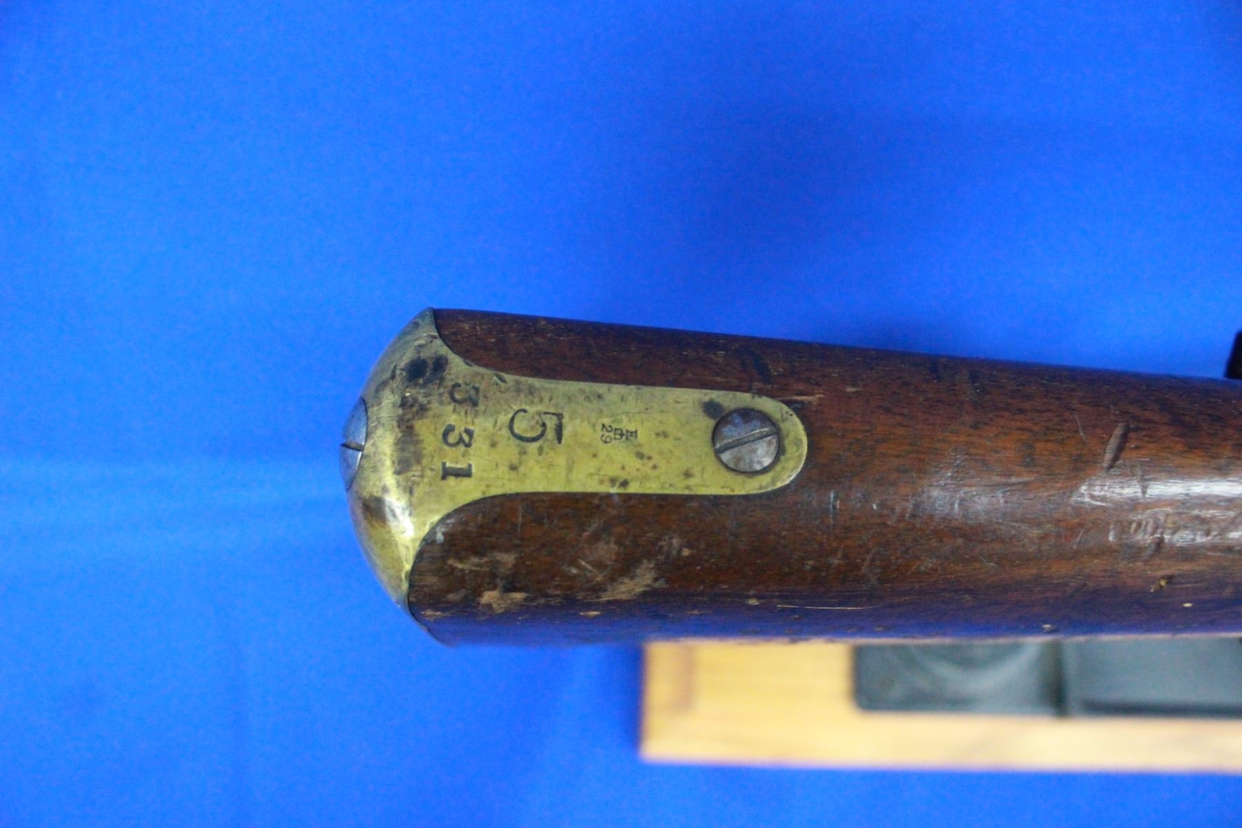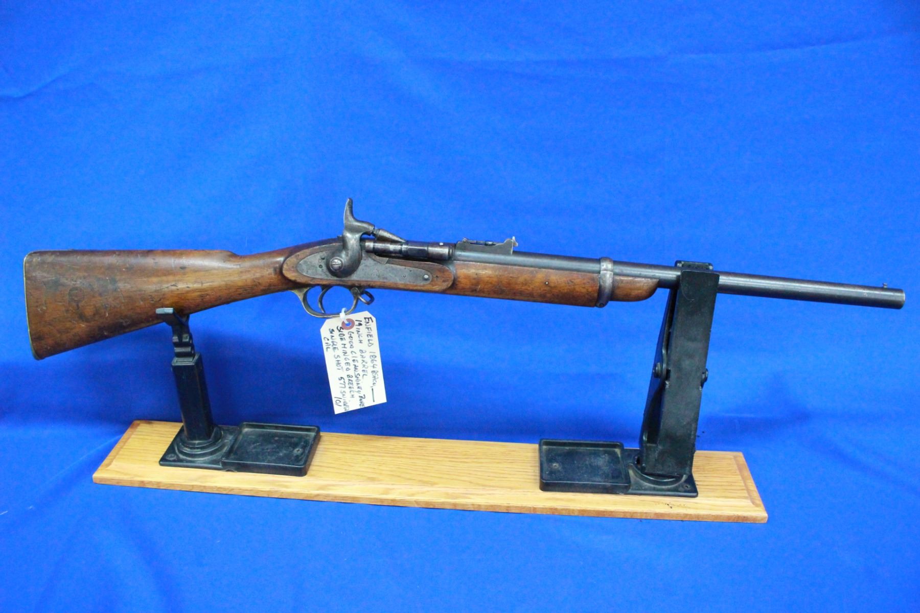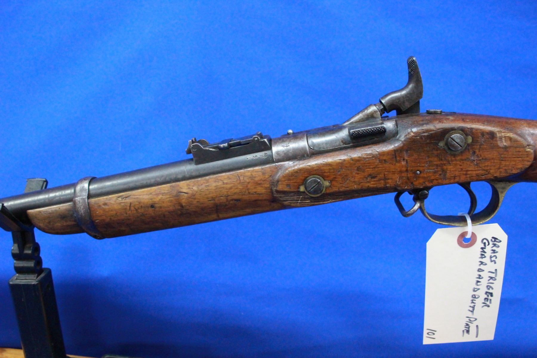 577 Snider cal.; Side Hinged Breech Single Shot; Percussion Center Fire; 19" Barrel; Bore is Good, Clean & Shiny; Brass Trigger Guard & Butt Plate; 5 Over 31 Stamped on the Butt Plate; Piece out of the Stock ahead of the Trigger Guard