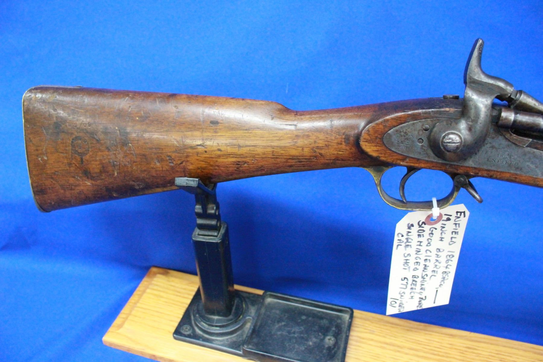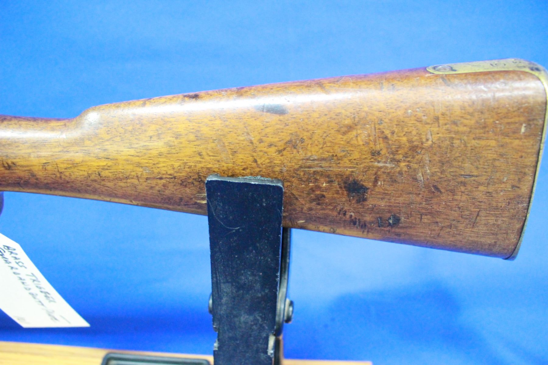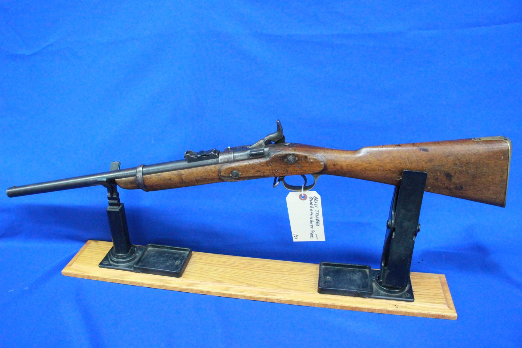 577 Snider cal.; Side Hinged Breech Single Shot; Percussion Center Fire; 19" Barrel; Bore is Good, Clean & Shiny; Brass Trigger Guard & Butt Plate; 5 Over 31 Stamped on the Butt Plate; Piece out of the Stock ahead of the Trigger Guard