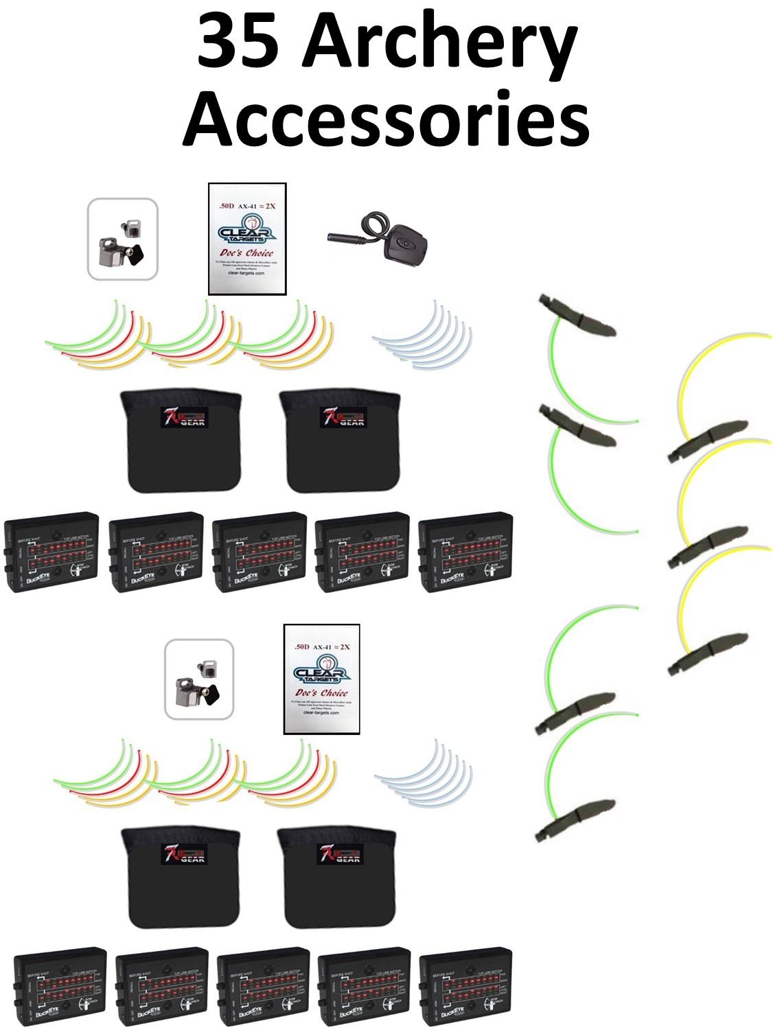 34 x Archery Accessories, Sight Accessory, Sight Tape Magnifier, 2-Axcel Lens AX41 1 3/4" CT DC 2X, 1-Hunter's Light Blue, 6 x Replacement Fibers .029, 2 x Replacement Fibers .010 Blue, 7 x Axion Sight Pins, 3-Amber Front Row .009, 2-Green Back Row .009, 2-Green Front Row .009, 4 x Remedy 7 3D Sight Cover Black, 10 x Bow Coachs