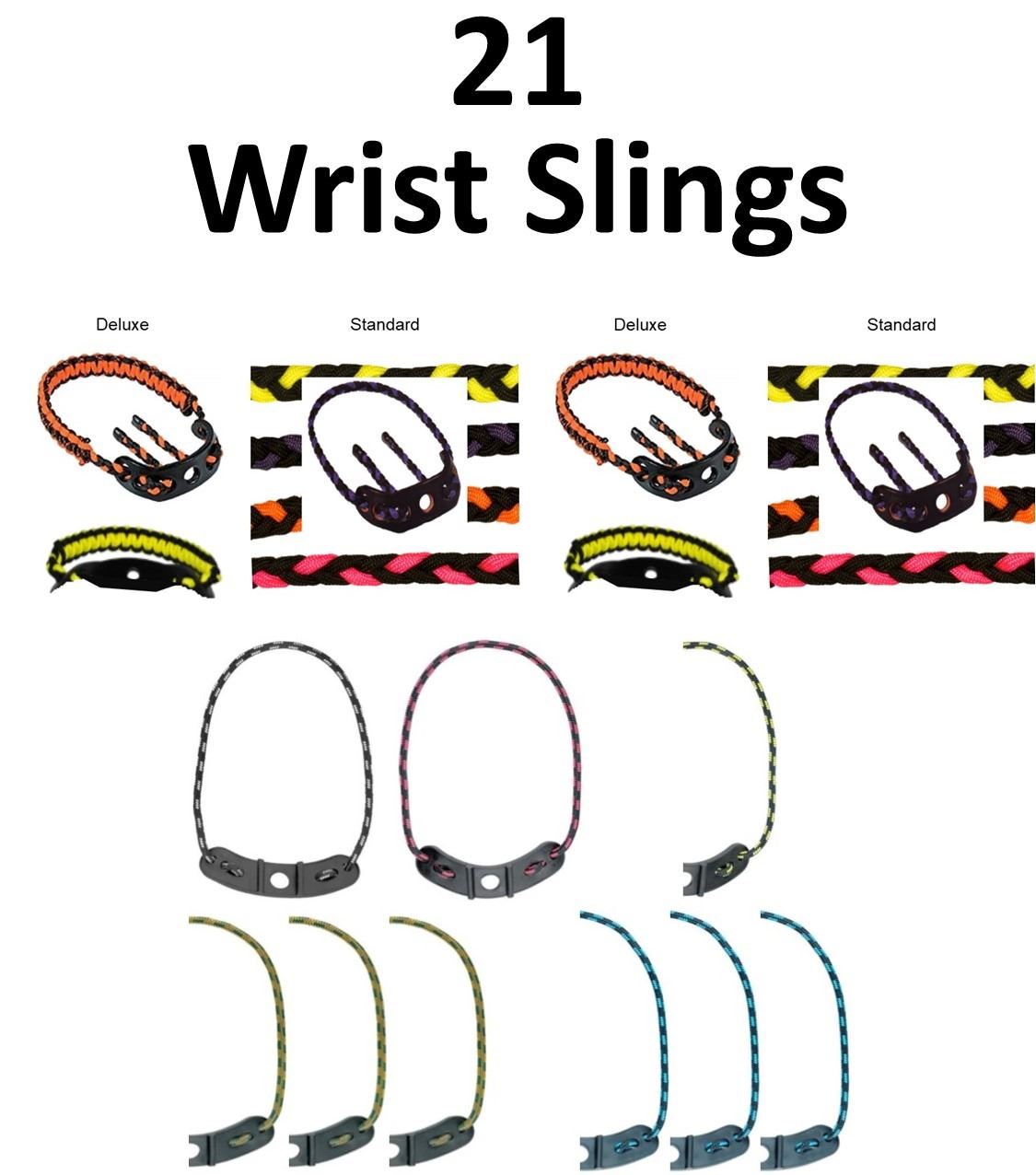 21 x Wrist Slings, 12 x Blacks Creek Wrist Slings, 4 x Deluxe, 2-Orange/Black, 2-Yellow/Black, 8 x Standard, 2-Yellow/Black, 2-Purple/Black, 2-Orange/Black, 2-Pink/Black, 9 x Pine Ridge Kwik Slings, 1-Silver/Black, 1-Pink/Black, 1-Yellow/Black, 3-Camo, 3-Turquoise/Black