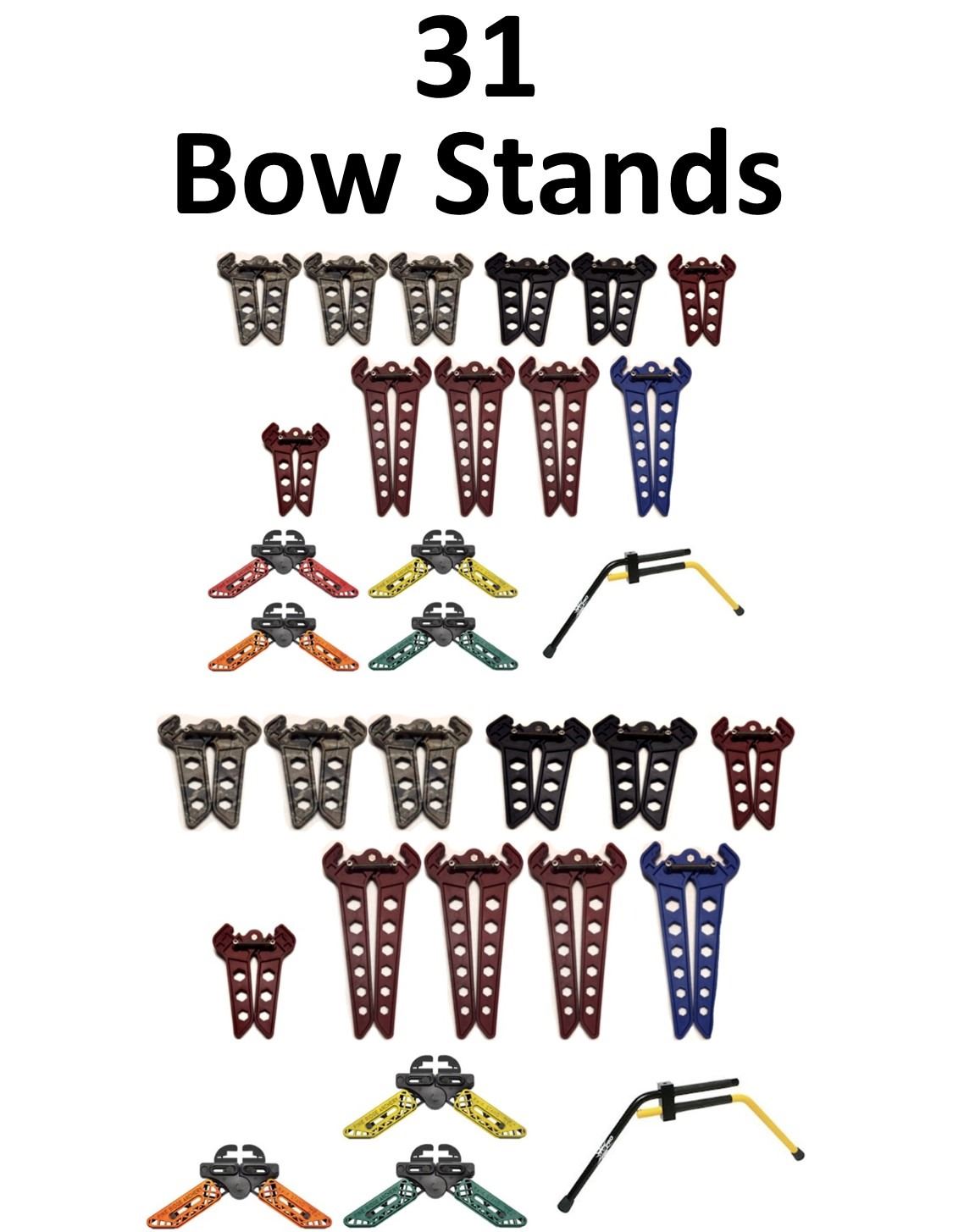 31 x Bow Stands, 22 x OMP, 6-Parallel AP, 4-Single Black, 2-Parallel Red, 2-Mathews Red, 6-Red, 2-Long Blue, 7 x Pine Ridge, 2-Orange, 2-Yellow, 2-Forest Green, 1-Red, 2 x Gas Pro Black/Yellow