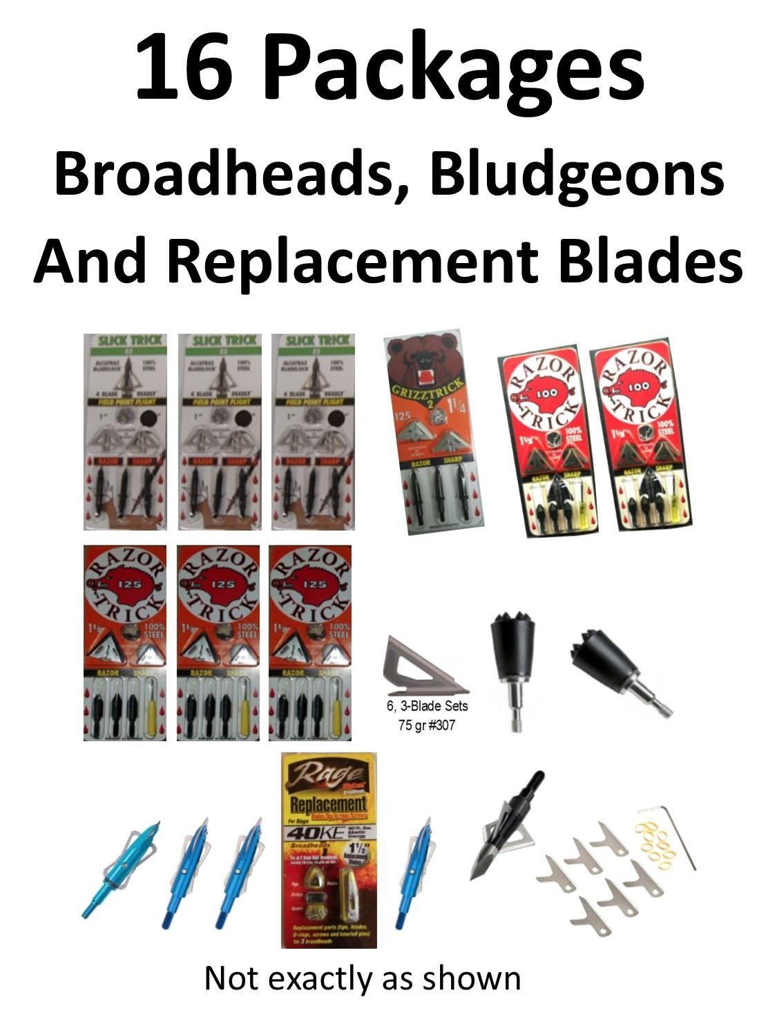 16 x Broadheads & 2 Bludgeons, 1-Grizz Trick, 2-Razor Trick 100Gr, 4-Razor Trick 125Gr, 1 x Muzzy 75Gr, 1 x Hammer SST 85Gr, 4 x Rage Practice Blades, 1-3 Blade 100Gr, 2-2 Blade 125Gr, 1-Chisel 100Gr, 1 x Rage 40KE Repl, 1 x Swhacker 100Gr Repl, 1 x Thunderhead XP 100Gr Repl, 2 x Bludgeons, 1-125Gr, 1-85Gr,