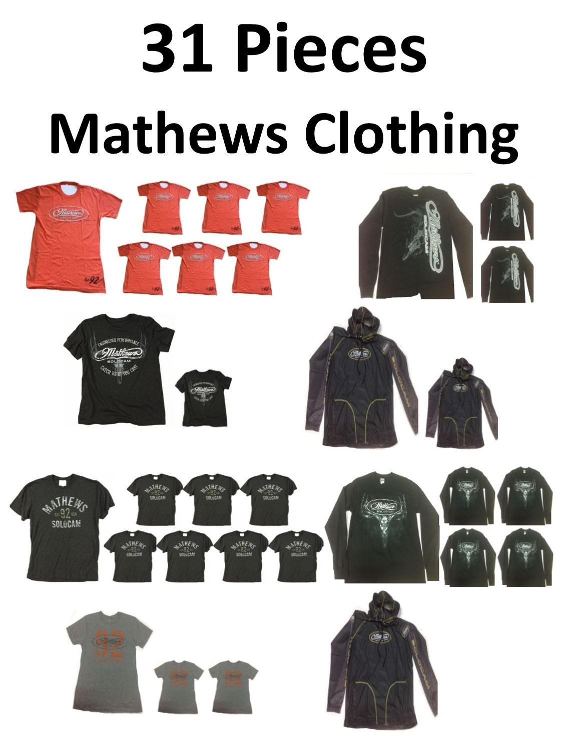 31 x Mathews Clothing, 7 x Blaze Orange Shirts, 1-2XL, 4-XL, 2-L, 3 x LS Black/Grey L, 2 x Outfitter Shirts, 1-XL, 1-2XL, 11 x Scout T-Shirts, 2-M, 3-L, 2-XL, 1-2XL, 3 x Grey w/Orange 92, 1-M, 1- L, 1-XL, 5 x Long Sleeve Black/White Skull, 1- M, 4-L, 2 x Performance Hoodie, 1-L, 2-XL