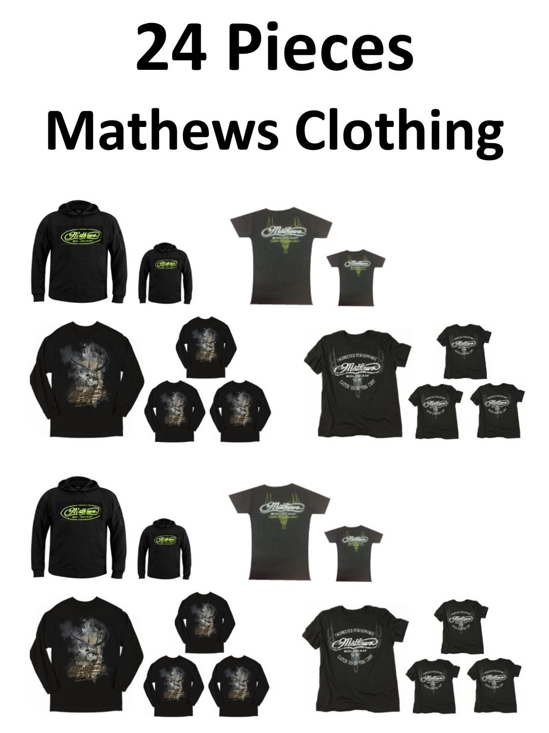 24 x Mathews Clothing, 4 x Hoodie Green Logo, 2-XL, 2-L, 20 x Shirts, 4-Charcoal Neon Green XL, 4-Elusive L, 4-Elusive XL, 4-Outfitter M, 4-Outfitter L