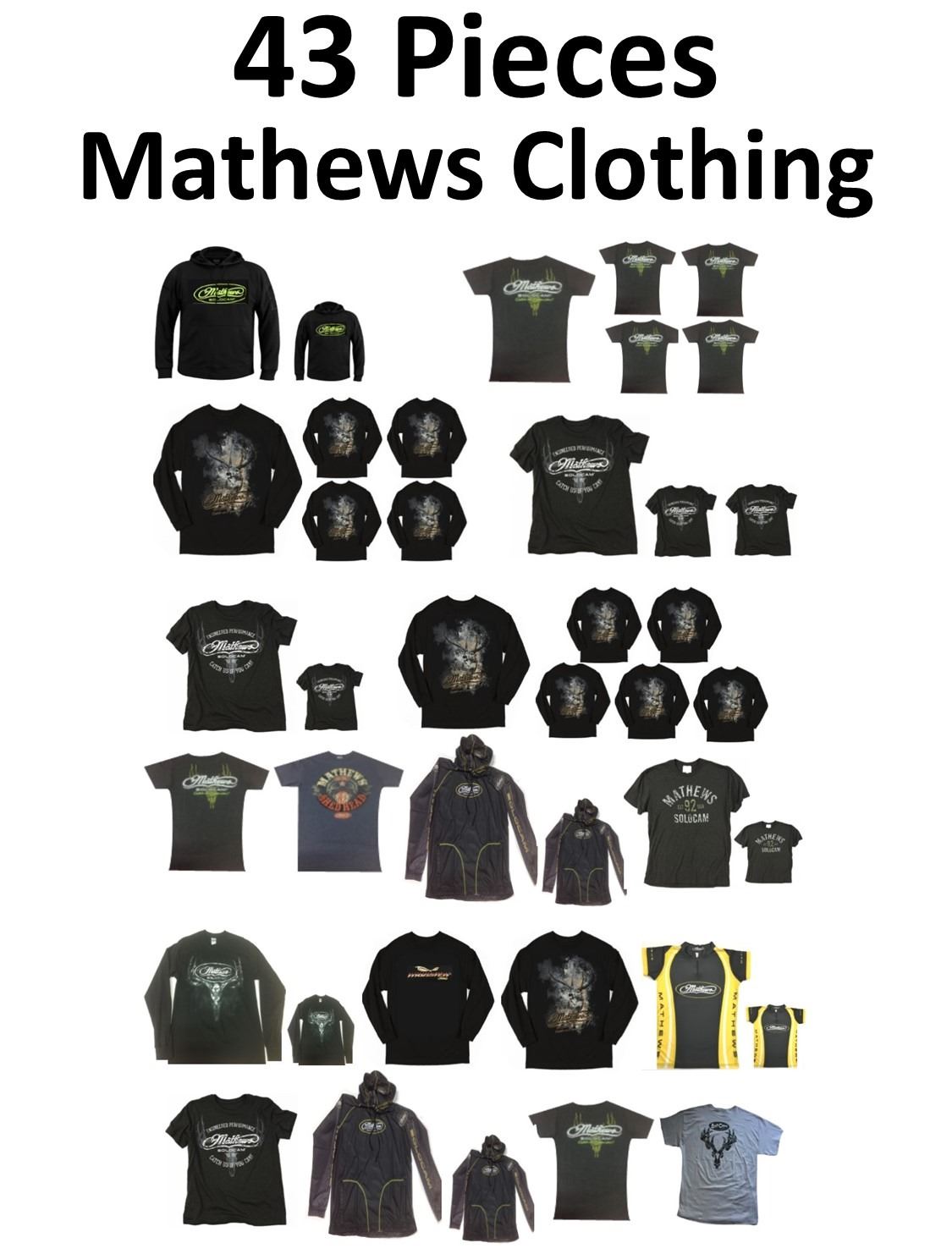 43 x Mathews Clothing, 2 x Hoodie Green Logo, 1-2XL, 1-M, 13 x Shirts, 10-Charcoal Neon Green, 2-XL, 5-L, 3-M, 1-Charcoal Neon Green L, 2-Black w/white Logo Neon Green L, 2-Elusive L, 3-Elusive XL, 1-Outfitter M, 2-Outfitter L, 6 x Outfitter, 2-XL, 4-2XL, 12 x Shirts, 2-Elusive L, 2-ElusiveXL, 3-Scout 2XL, 5-Short Shed Hunter Blue, 3-XL, 1-L, 1-M, 2-Black w/Yellow Logo XL, 6 x Performance Hoodie, 3-L, 3-XL