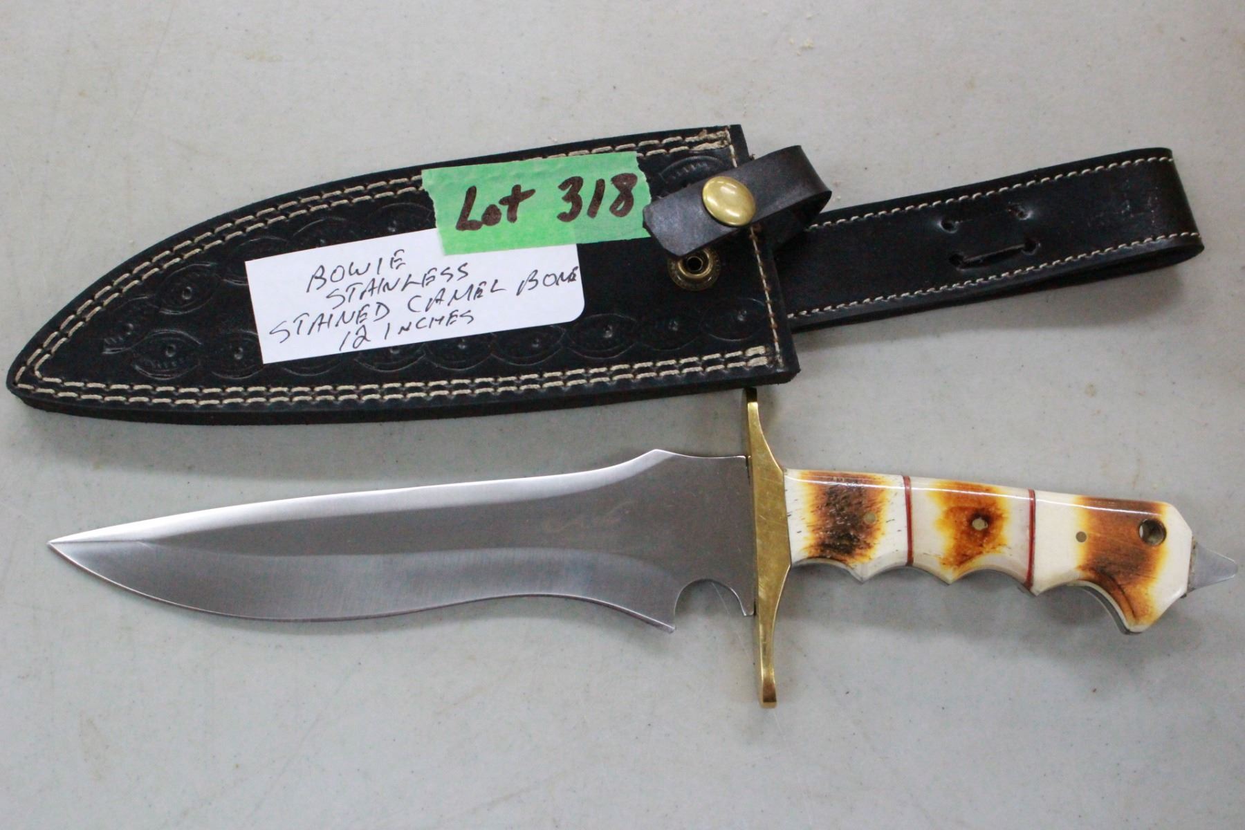 Lot 318 Bowie, Stainless Steel, 12" Blade, Camel Bone Handle & Leather Sheath