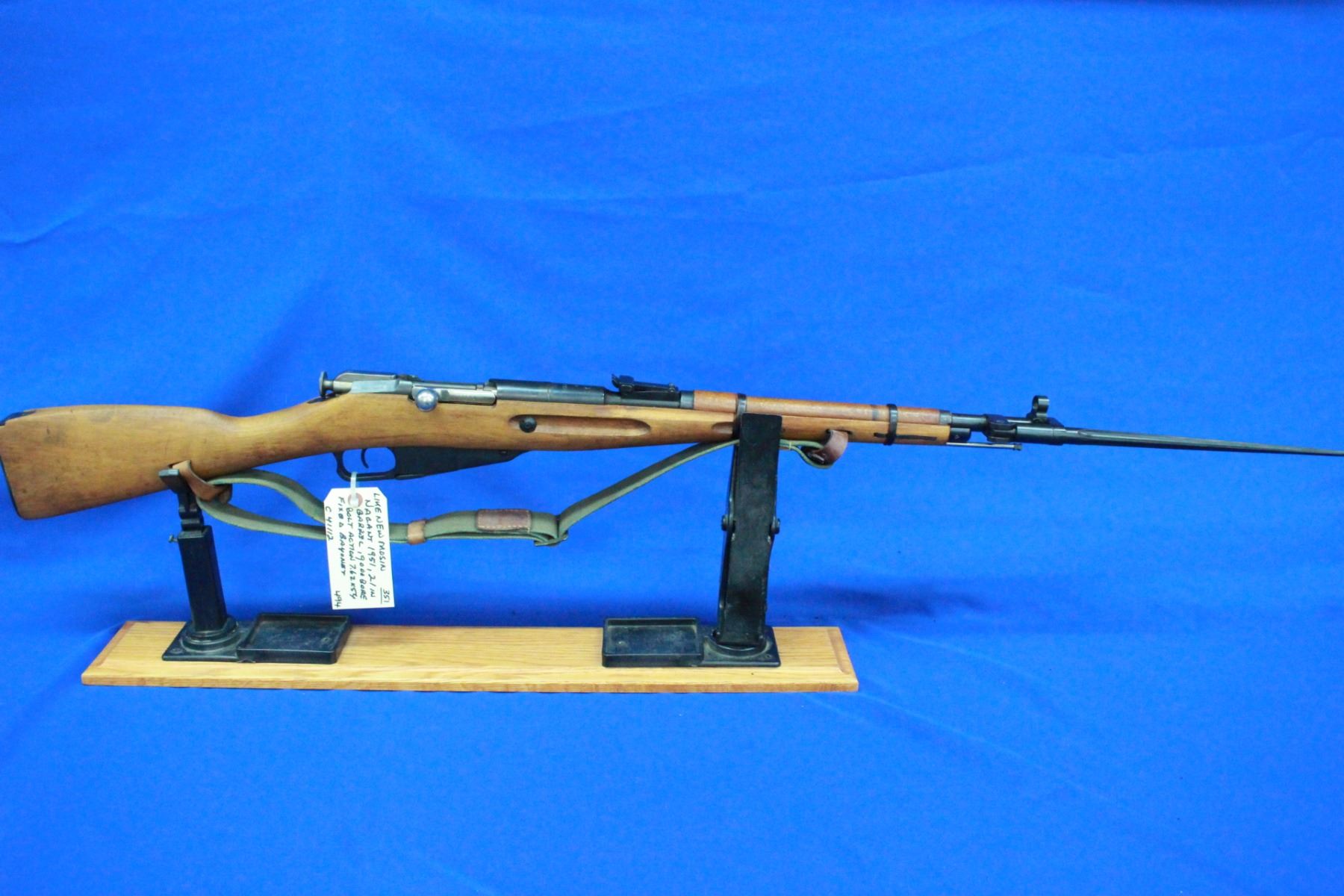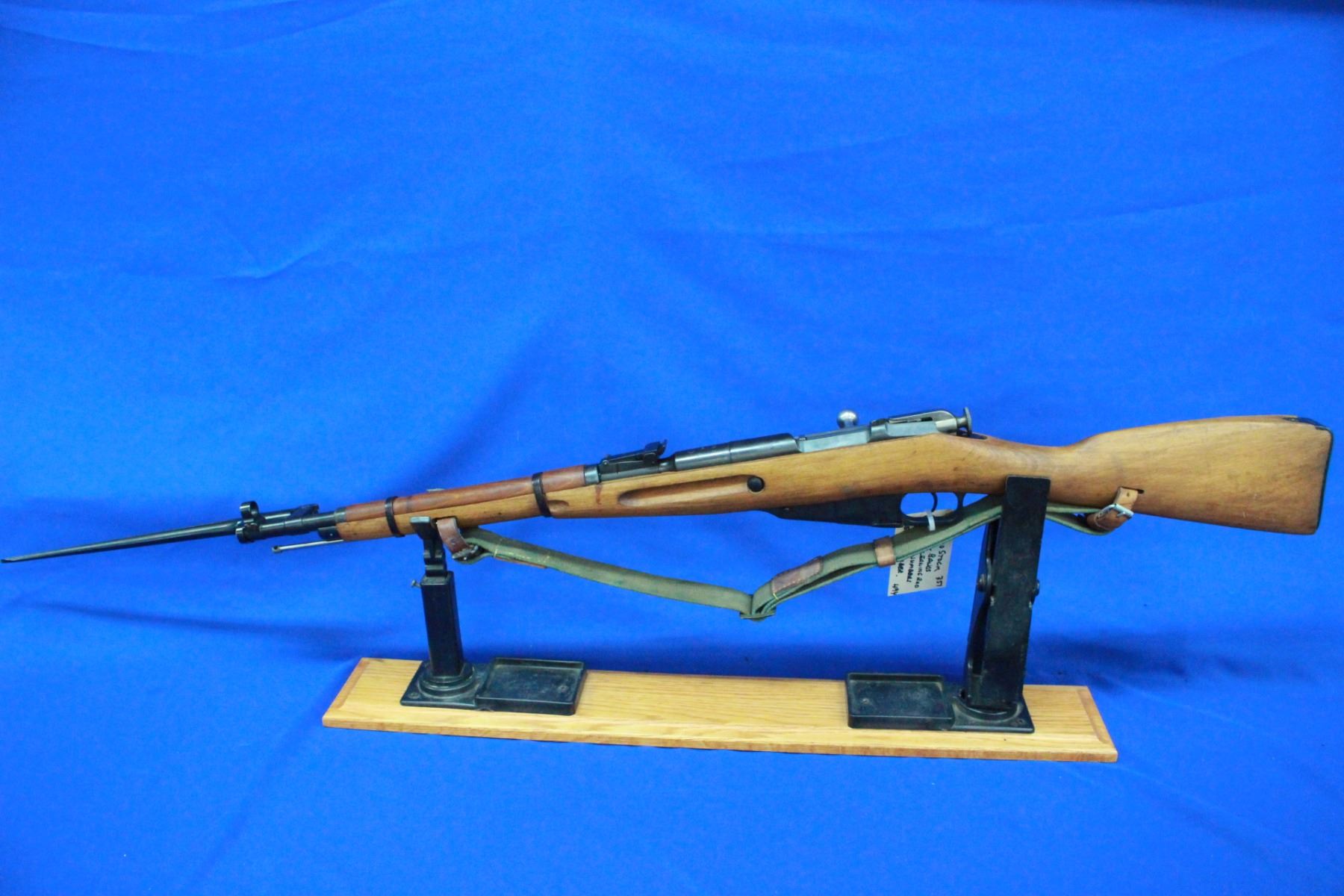 7.62 x 54 caliber; Bolt Action; 21" Barrel; Good Bore; Full Wood Stock; Fixed Bayonet; with Sling and Cleaning Rod; S/N C41112 (Matching serial numbers)