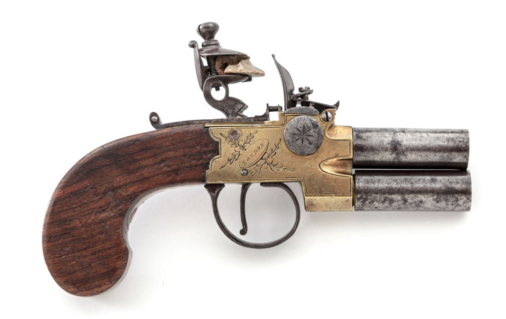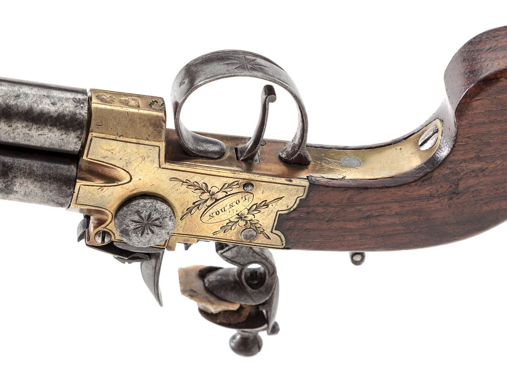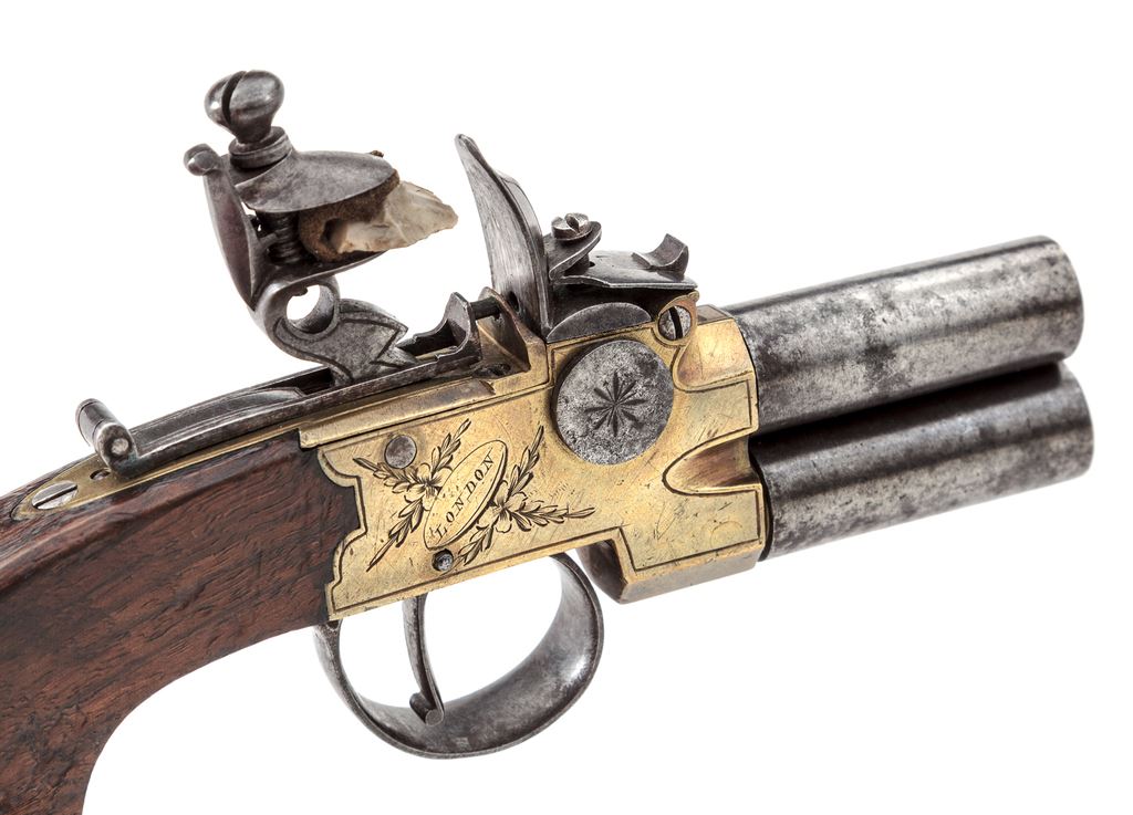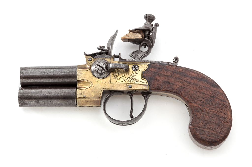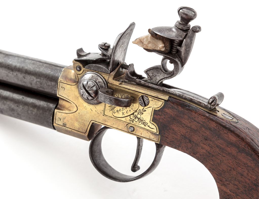 Antique English Over/Under Screw-Barrel Flintlock Pocket Pistol, NVSN, approx. .40 cal., 1.625'' iron barrels are marked ''2'' and ''3'' at breeches; brass boxlock frame has corresponding numbers at breeches, a left-side barrel selector switch, a gracefully-shaped hammer, sliding rear safety, two proof marks ahead of trigger guard, and is floral engraved with ''Goodwin/& Co.'' within an oval on left side, and ''London'' on right; plain varnished walnut bag-style grips. Mfg'd ca. 1830s-50s. Condition is very good. Barrels retain no original finish but are smooth gunmetal gray overall; frame has light toning with clear engraving and markings. Grips are sound with light marks and later varnish. Action is crisp; smoothbores are clean with deep cuts inside muzzles for engaging a barrel wrench. Est.: $700-$900. (Antique)