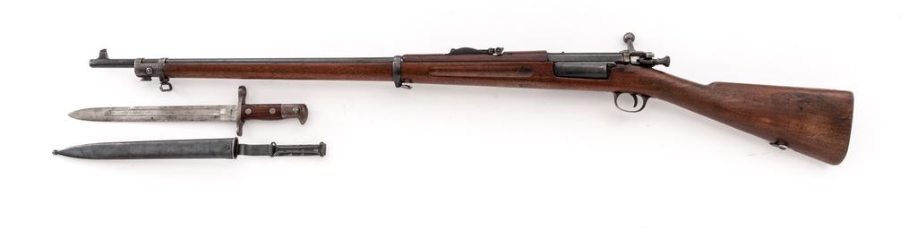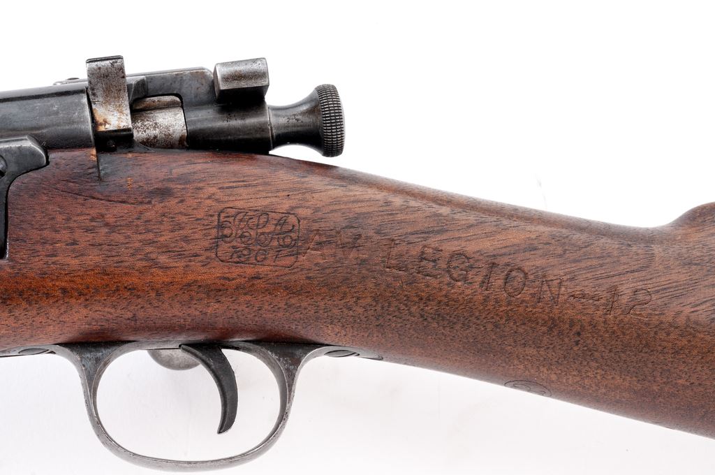 Springfield Model 1898 Krag Bolt Action Rifle, with bayonet and scabbard, #306642, .30-40 Krag cal., 30'' barrel, blue finish, 1901 cartouched walnut stock, additionally marked ''AM LEGION-12'', with sling swivels. Condition is near fine retaining approx. 85% thinning original finish. Crisp clear 1901 cartouche, with light scuffs and scratches overall to stock. Upper handguard with split just forward the rear sight. American Legion 12 is based in Selma, CA, and this rifle was most lightly carried in parades and fired with blanks at funerals. Action remains crisp, bore is fine. Est.: $500- $750. (C&R) BAYONET?