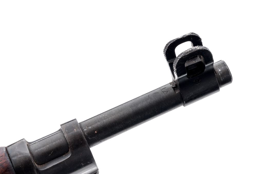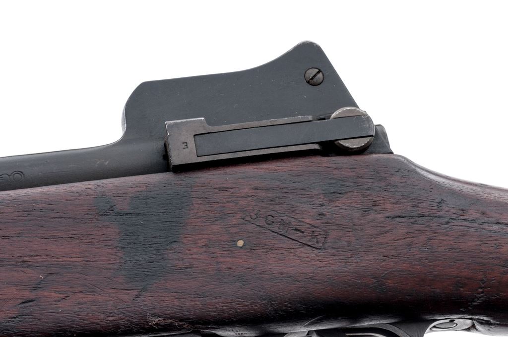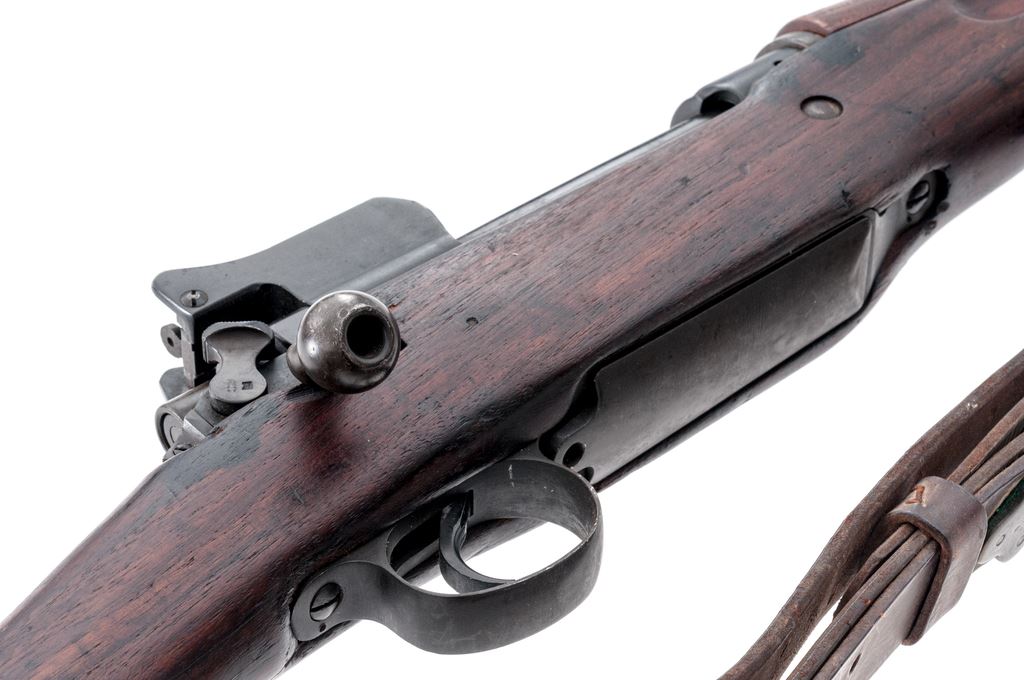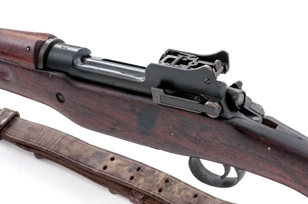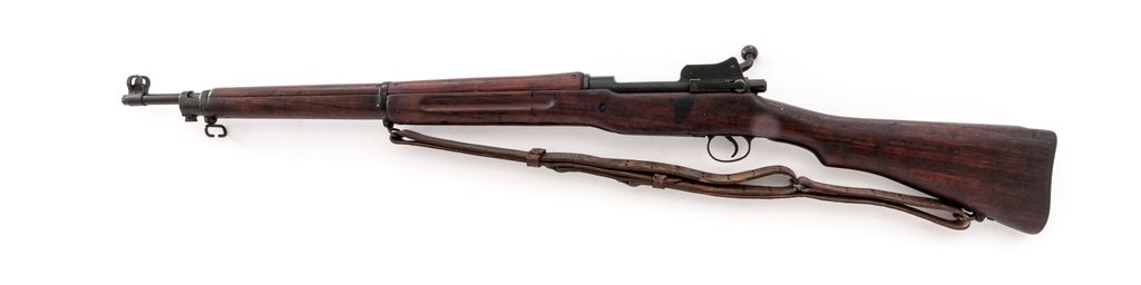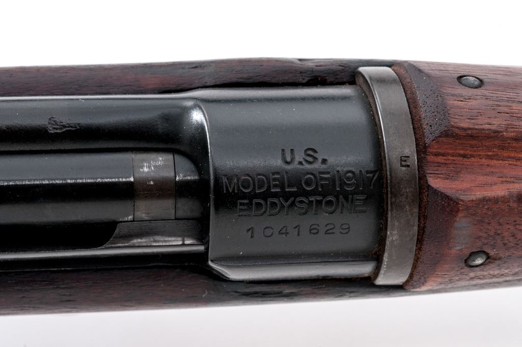 Eddystone Model 1917 Bolt Action Rifle, #1041629, .30-06 cal., 26'' barrel, blued finish, walnut stock, blade front sight with protecting ears and adjustable folding leaf rear sight, and U.S. M1907 leather sling. Marked on receiver ring ''U.S. MODEL OF 1917 EDDYSTONE'', and on the replacement barrel behind the front sight ''J.A(flaming bomb)''. The tip of the forend is stamped with a ''W'', and the underside of the bolt handle is stamped with an ''E''. There is a boxed ''3GM-K'' cartouche stamped on the left side of the stock forward of the wrist. Condition overall is very good with the metal retaining close to 95% finish. There is a significant stock chip behind the tang and a saw cut to the left forend, otherwise the wood is very good with light handling marks. There is some darkness forward of the chamber that may clean better, otherwise the bore is very good with very good rifling. Action is smooth. No visible import marks. Est.: $600-$750. (C&R)