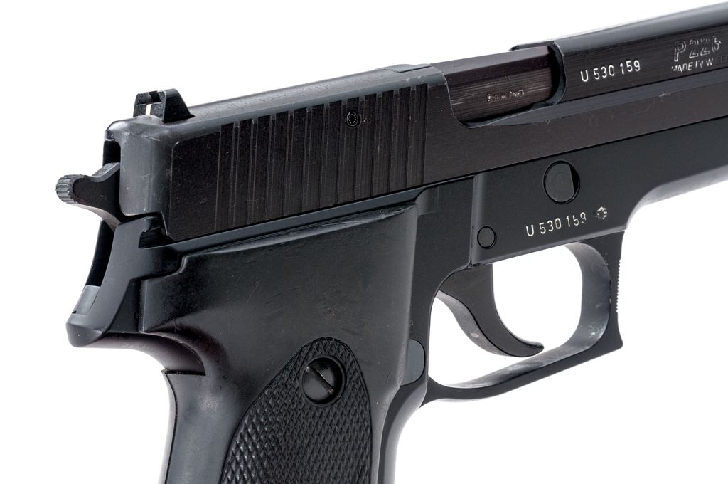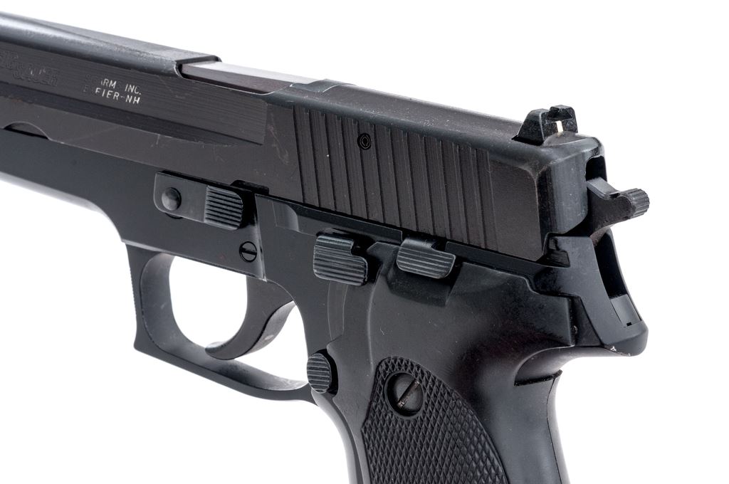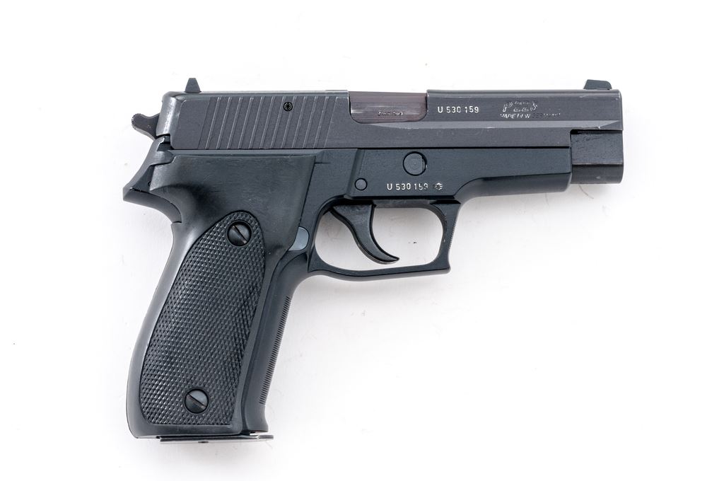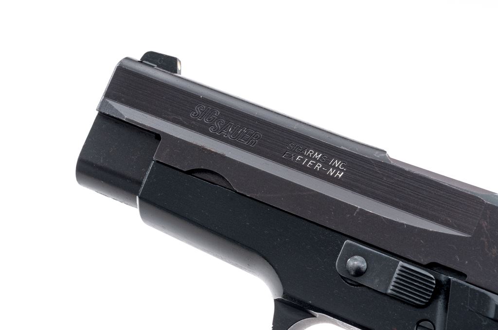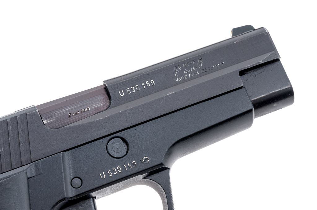 Sig Sauer Model P226 Semi-Automatic Pistol, #U530159, double/single action, 9mm, 4.4'' barrel, matte black slide, black alloy frame, replacement checkered black rubber grips, white dot front sight and square-notched rear sight with white post insert, and one 15-rd. Sig Sauer magazine. Condition is very good, retaining approx. 97% original finish; slide with scattered surface scuffs and spots of light edgewear. Grip checkering is unmarred, smooth borders show signs of moderate handling wear. Smooth action, bright bore with excellent rifling. Est.: $450-$650. (Modern/PPT) (High-cap mag not available to Calif. residents.)