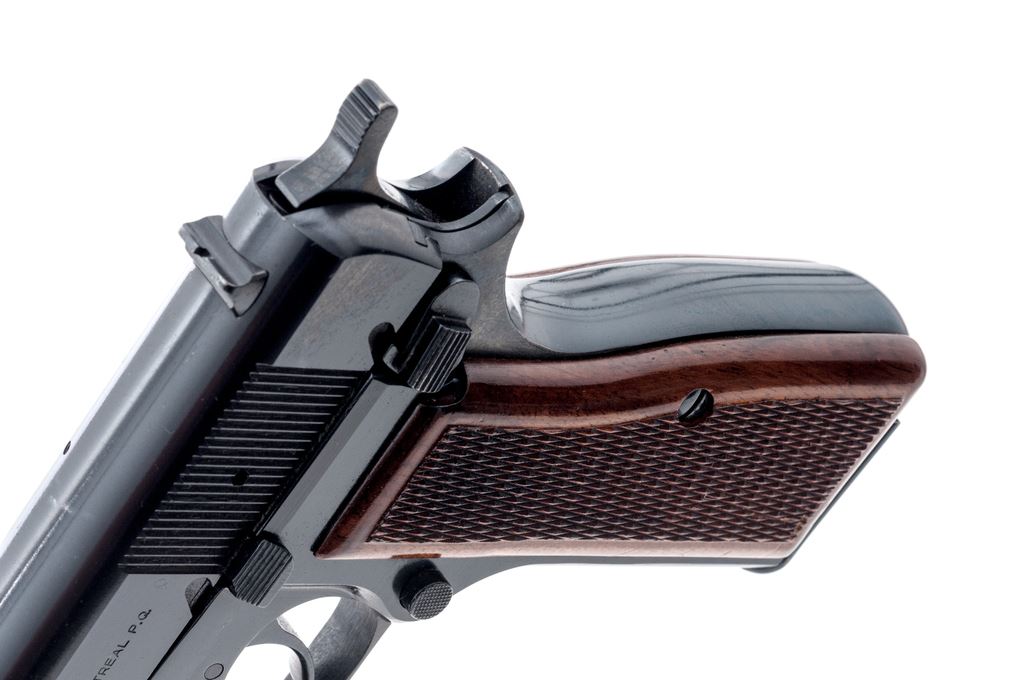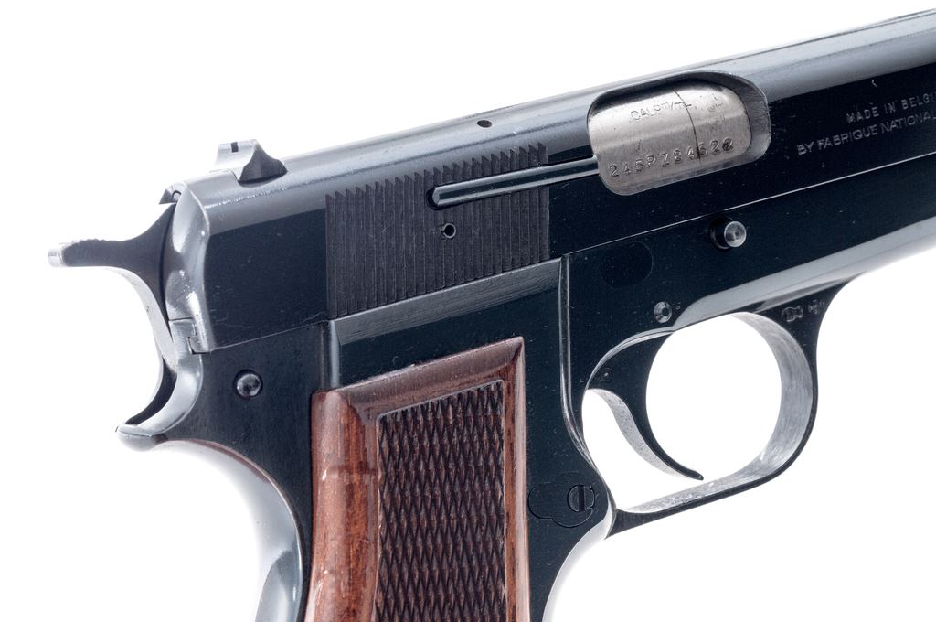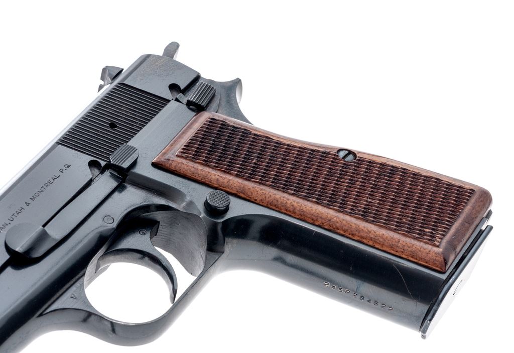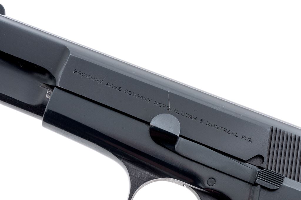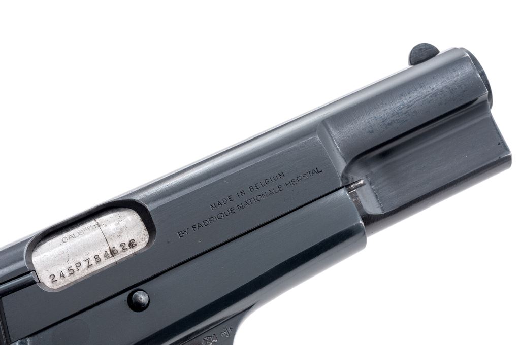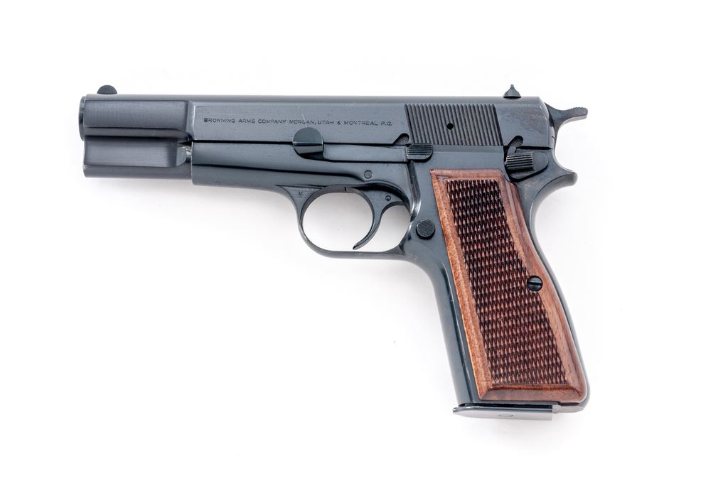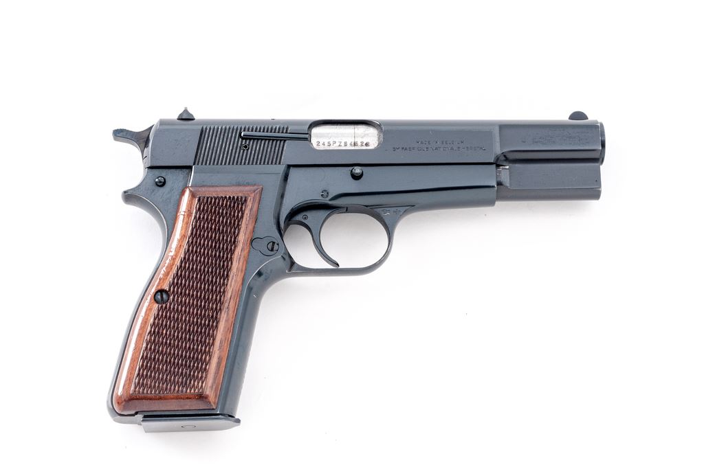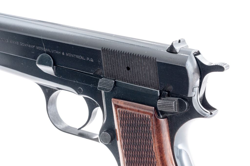 Browning Hi-Power Semi-Automatic Pistol, #245PZ84622, 9mm cal., 4-5/8'' barrel, blue finish, spur hammer, factory checkered walnut grips, blade front sight, square-notched rear sight, and one 13-round magazine; magazine body with a phosphate finish and blued steel base. Left side of slide is marked ''BROWNING ARMS COMPANY MORGAN, UTAH & MONTREAL P.Q.''; right side ''MADE IN BELGIUM/BY FABRIQUE NATIONALE HERSTAL''. Mfg'd 1981. In fine used condition retaining approx. 97% factory blue, with finish loss and handling marks to the front and backstrap; left side of slide with a quarter-inch arched thin scratch thru ''G'' in Morgan. Grips show moderate handling marks. Action is smooth; bore is bright with strong rifling. Est.: $700-$900. (Modern/PPT)(High-cap mags not available to Calif. residents.)