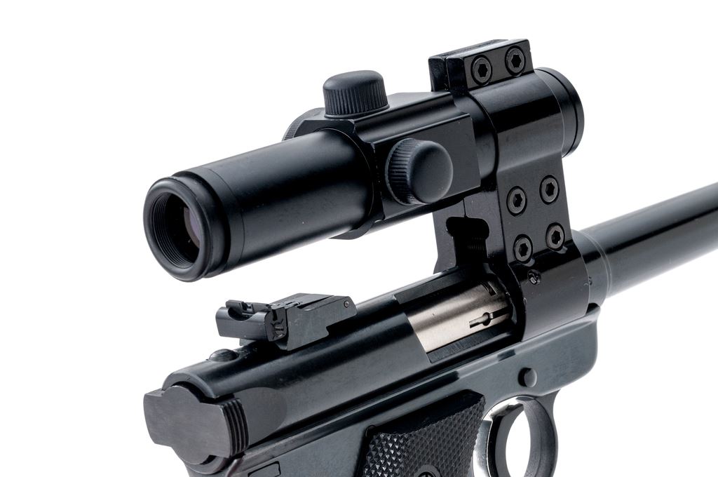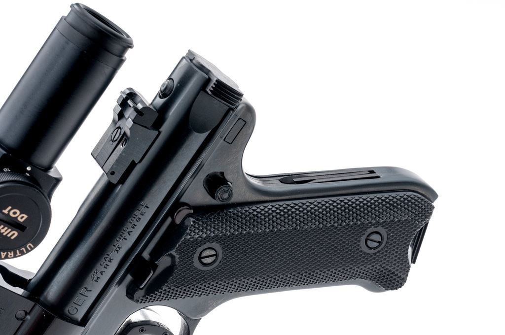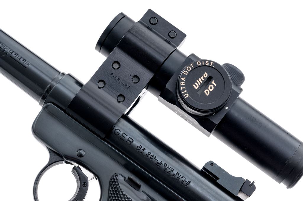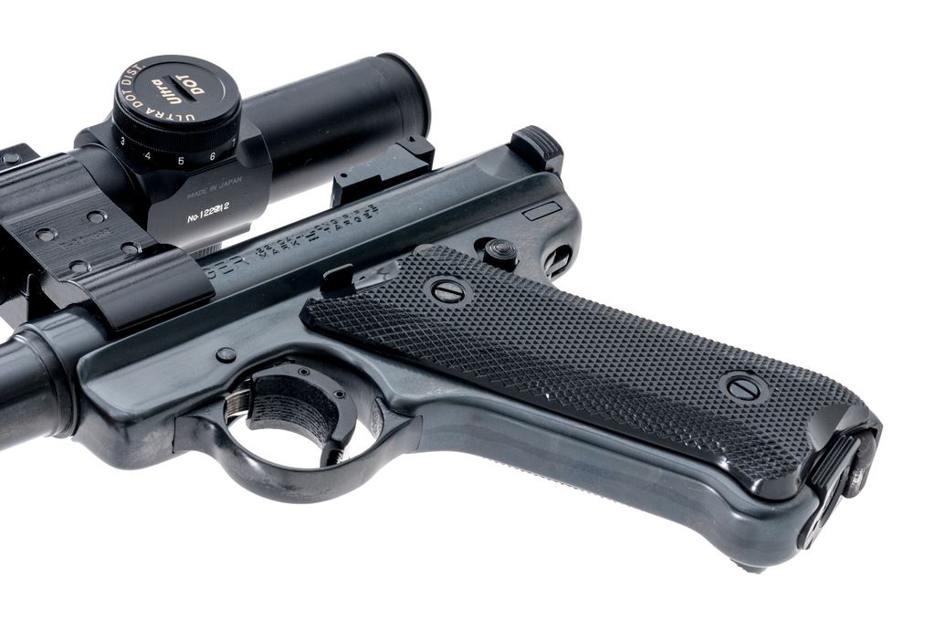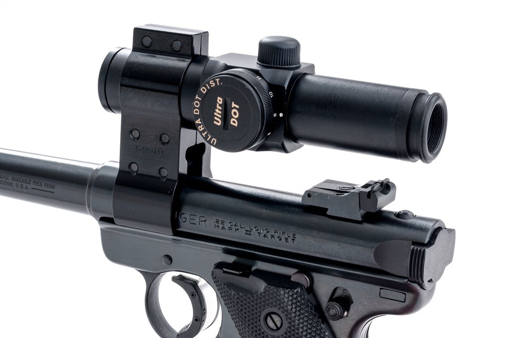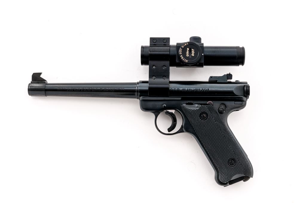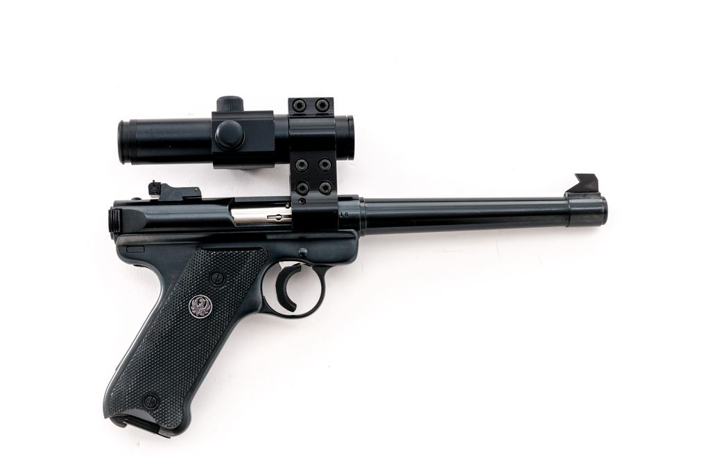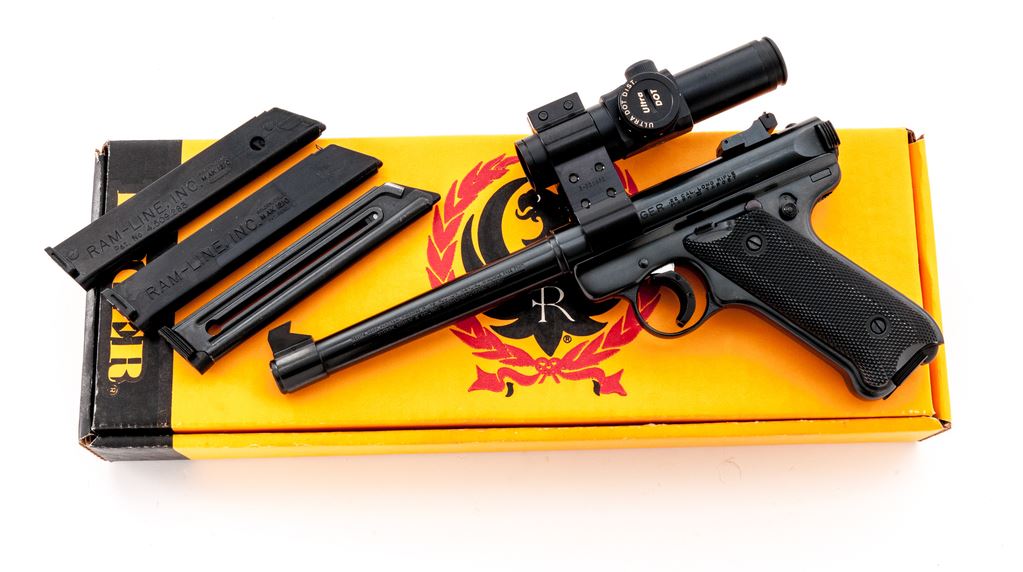 Ruger Mark II Target Semi-Automatic Pistol, #18-66316, .22 LR cal., 6-7/8'' tapered barrel, blue finish, original checkered black plastic grips, added trigger shoe, Patridge front sight and square-notched fully adjustable rear sight. With an added sight base that clamps to the front of the frame, no extra holes were necessary for mounting; topped with a Ultra Dot red dot sight. Included are two (2) 10-rd. Ruger magazines, one NOS that is still sealed in the original packaging; two (2) 12-rd. Ramline magazines; original unnumbered box with correct end label; brown cardboard outer box with firearms information stamped on the end, hand numbered to the gun. Pistol is in excellent overall condition and retains approx. 99%+ factory blue with crisp markings. Grips appear as new with clean, sharp checkering. Action is smooth; bore is mirror bright with excellent rifling. Red dot sight was tested and functions properly. Est.: $400-$600. (Modern/PPT) (High-cap mags not available to Calif. residents.)