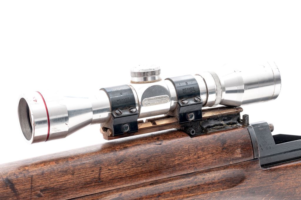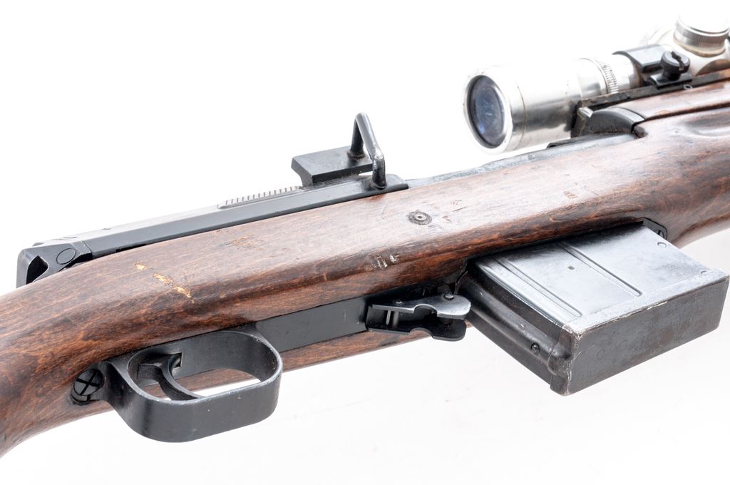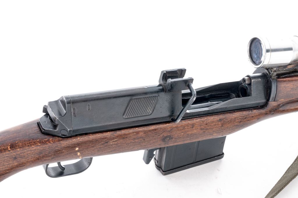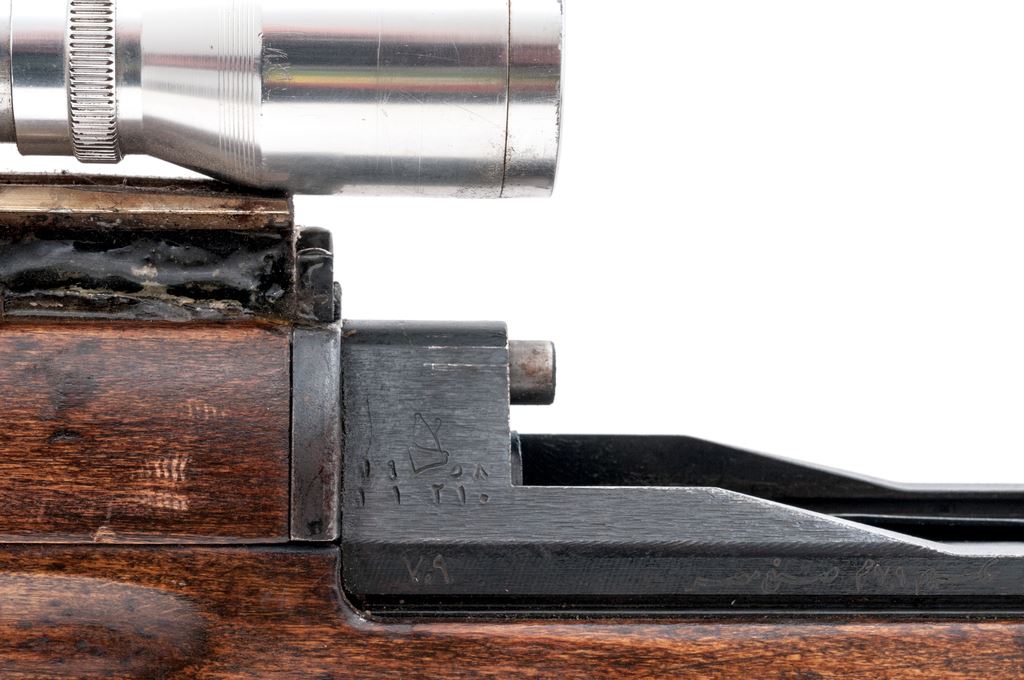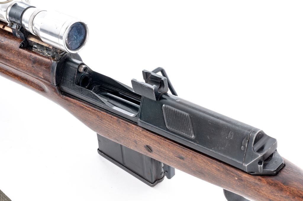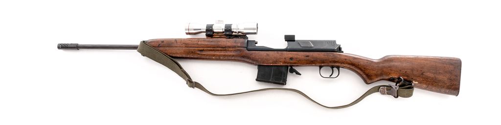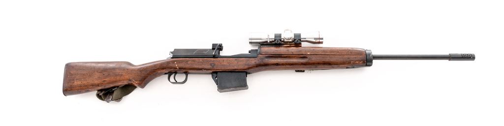 Modified Egyptian Hakim Semi-Automatic Rifle, with scope, NVSN, 8x57mm cal., 23.7'' barrel, blued finish, hardwood stock, with USGI sling. Fixed sights removed. Arabic markings on left side of receiver. Right side marked ''HAKIM 7.9 mm MADE IN EGYPT''. Rifle has been modified by cutting away front of stock and handguard and removing sights. A sight rail has been attached to the rear sight bed and glued in place. Condition overall is good as modified with over 85% finish remaining on the metal, showing patina on the magazine and buttplate. Wood has been sanded with added varnish applied and is very good with old and new handling marks. Action is smooth, bore is dark with rust but may clean better with good to very good rifling. Import stamped on right side of receiver and barrel. Scope is marked ''4X'' with 1'' Weaver rings and is in fair condition with dents and scratches across the tube. Both knobs turn freely; lenses are hazy and may clean better. Est.: $600-$900. (C&R)