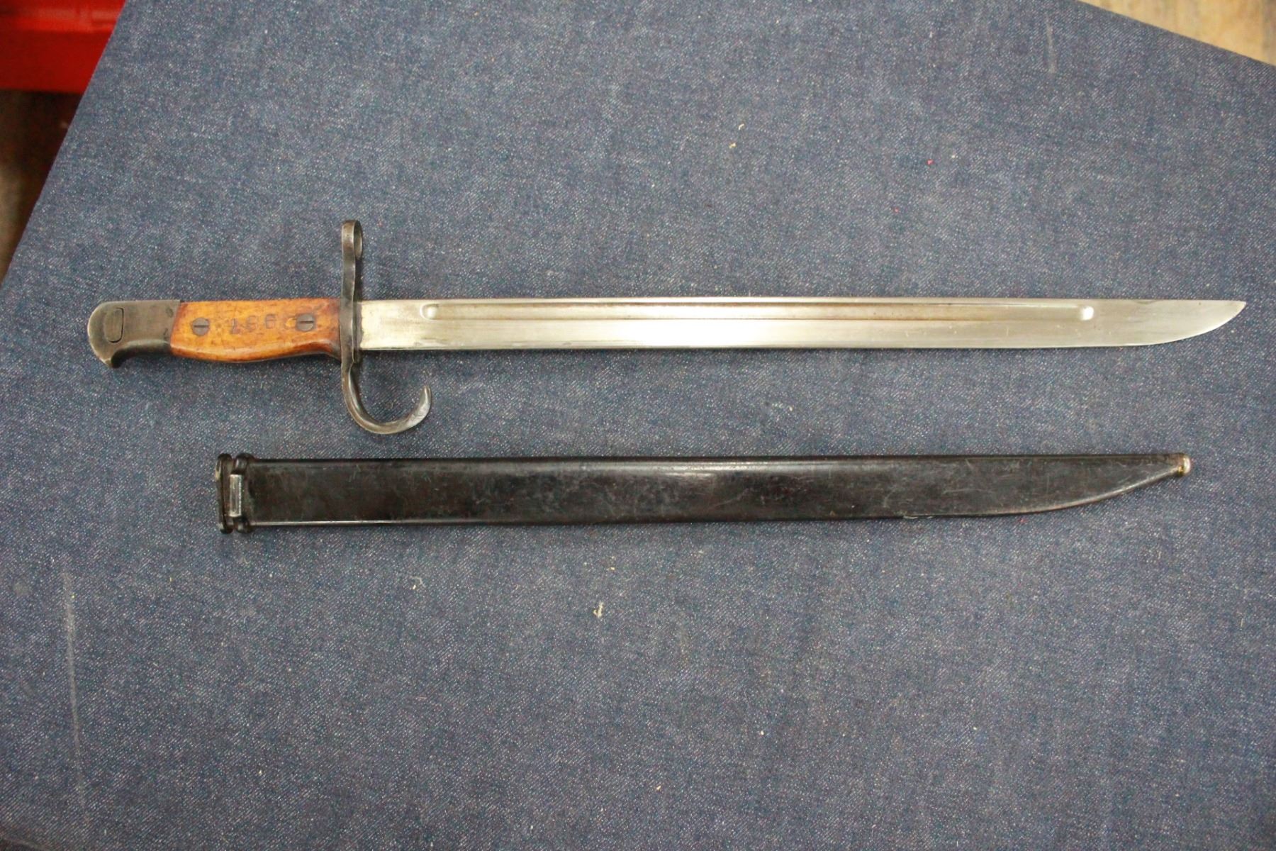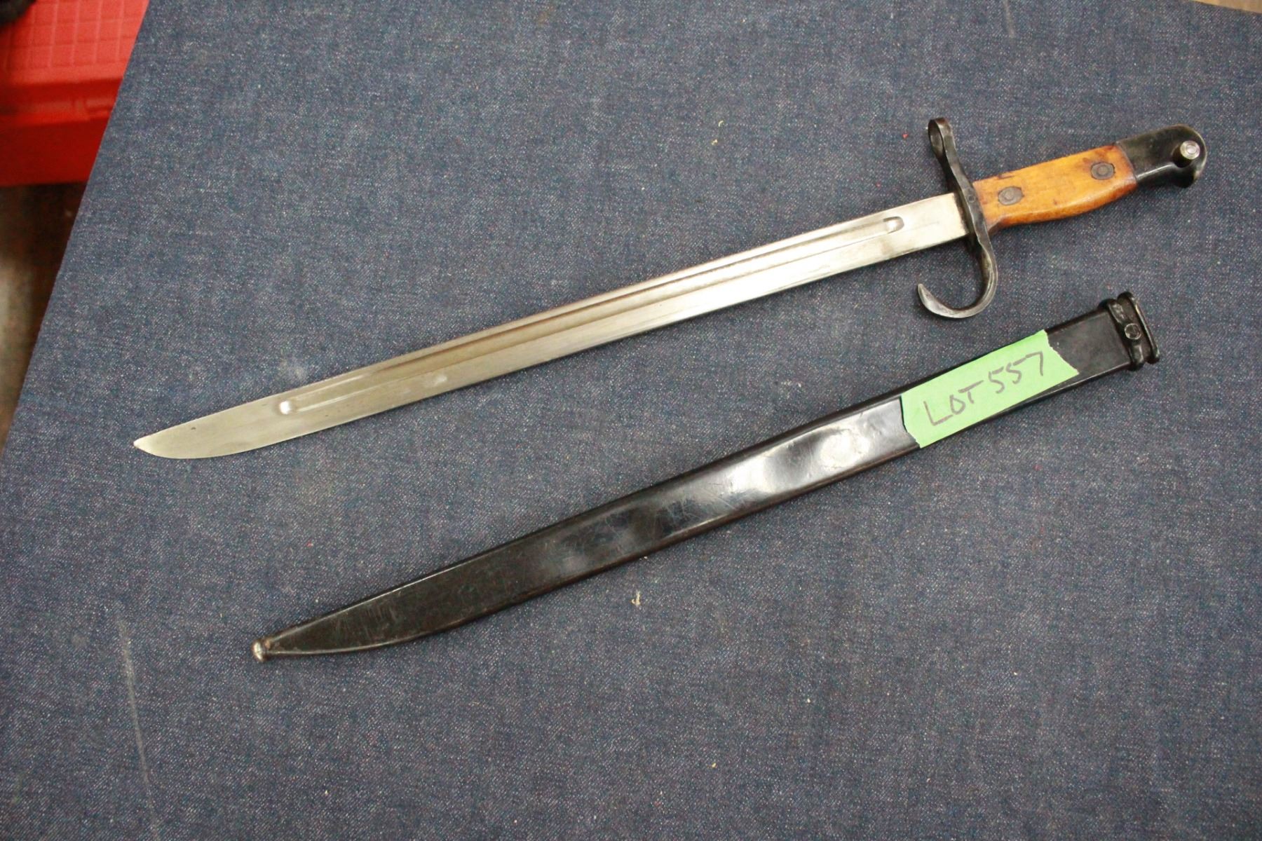 Lot 557 Bayonet & Scabbard - #967 stamped in the Wood Handle