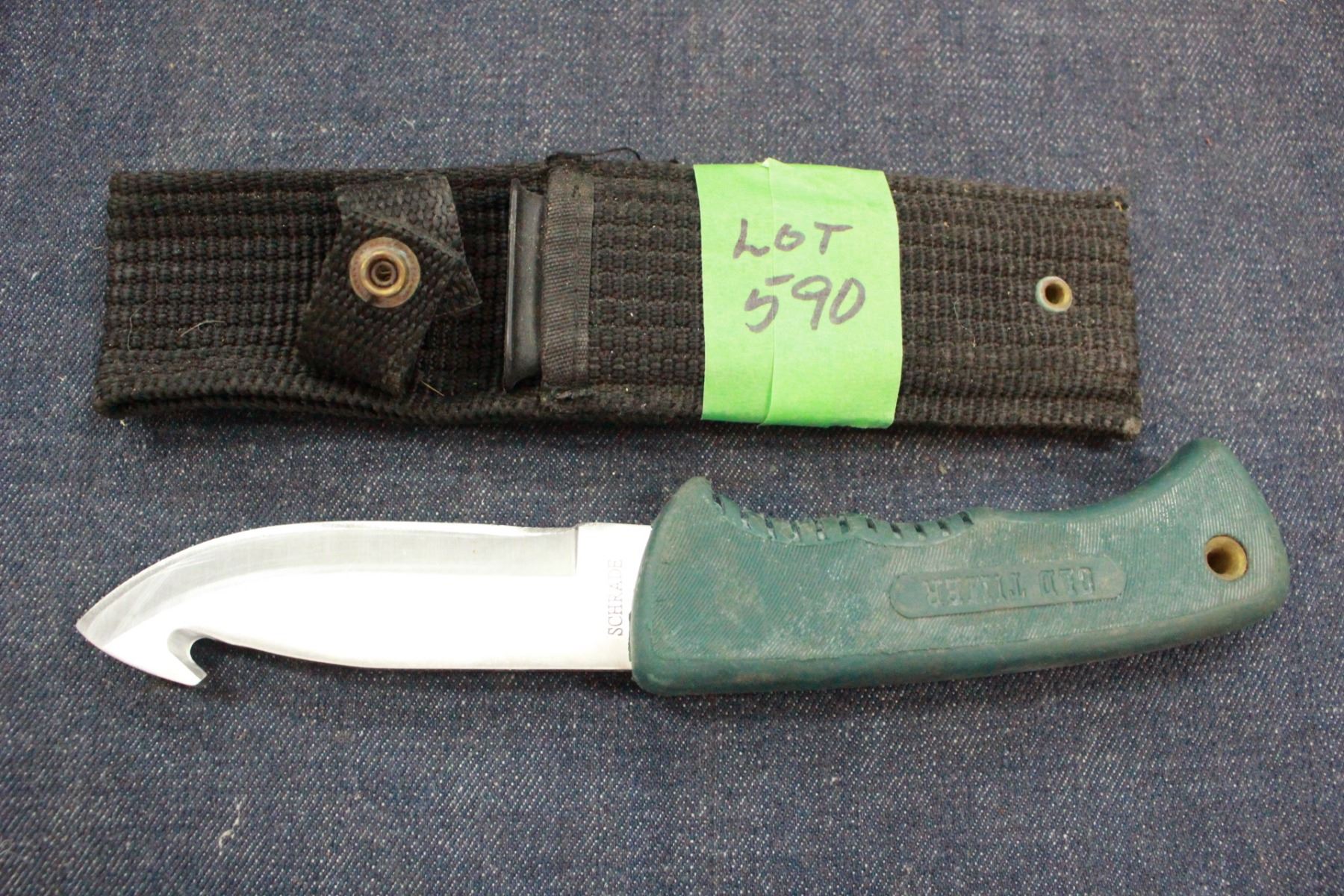 Lot 590 Schrade Old Timer Skinner with Gut Hook, 4" Blade, Rubber Handle & Sheath