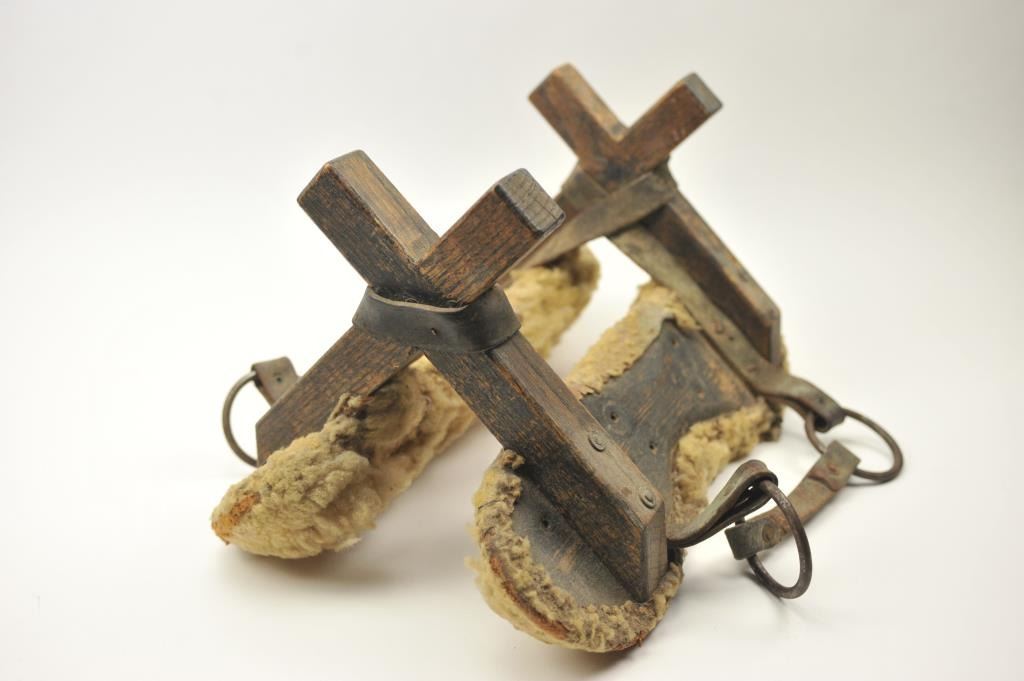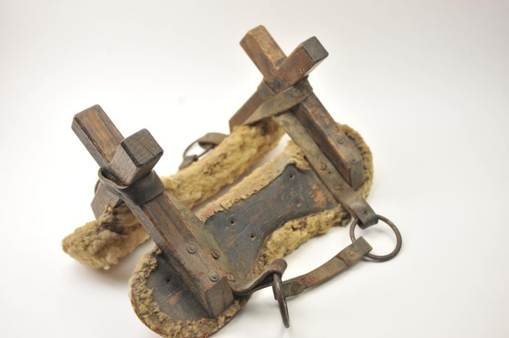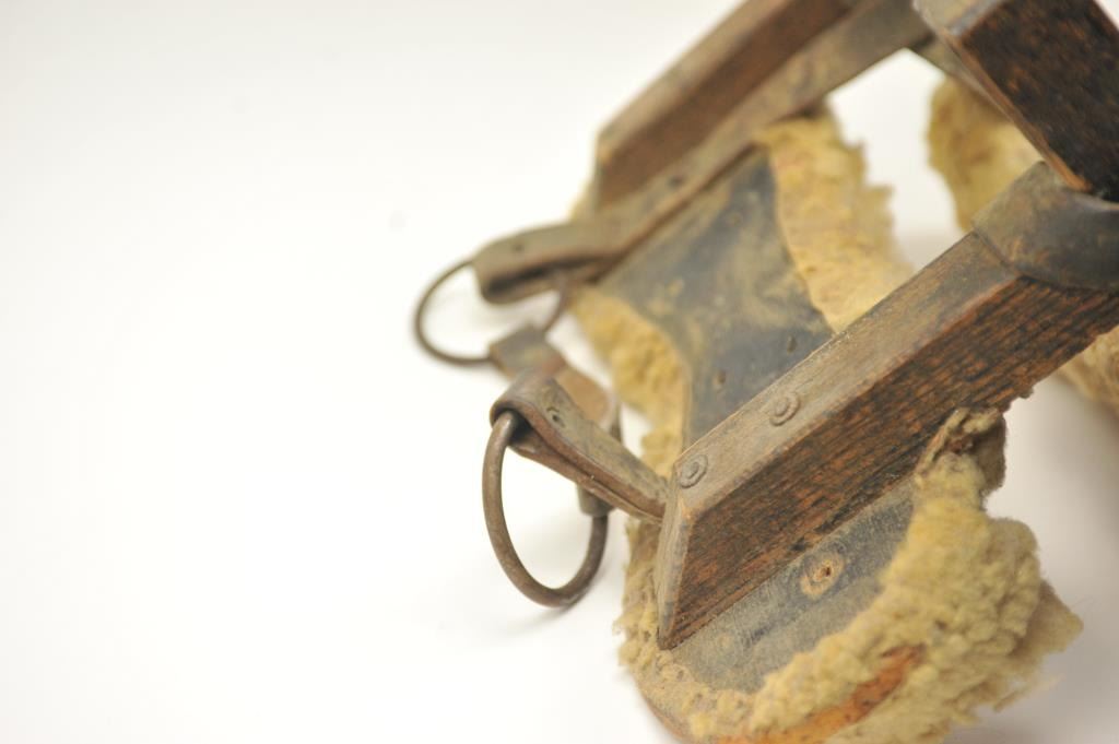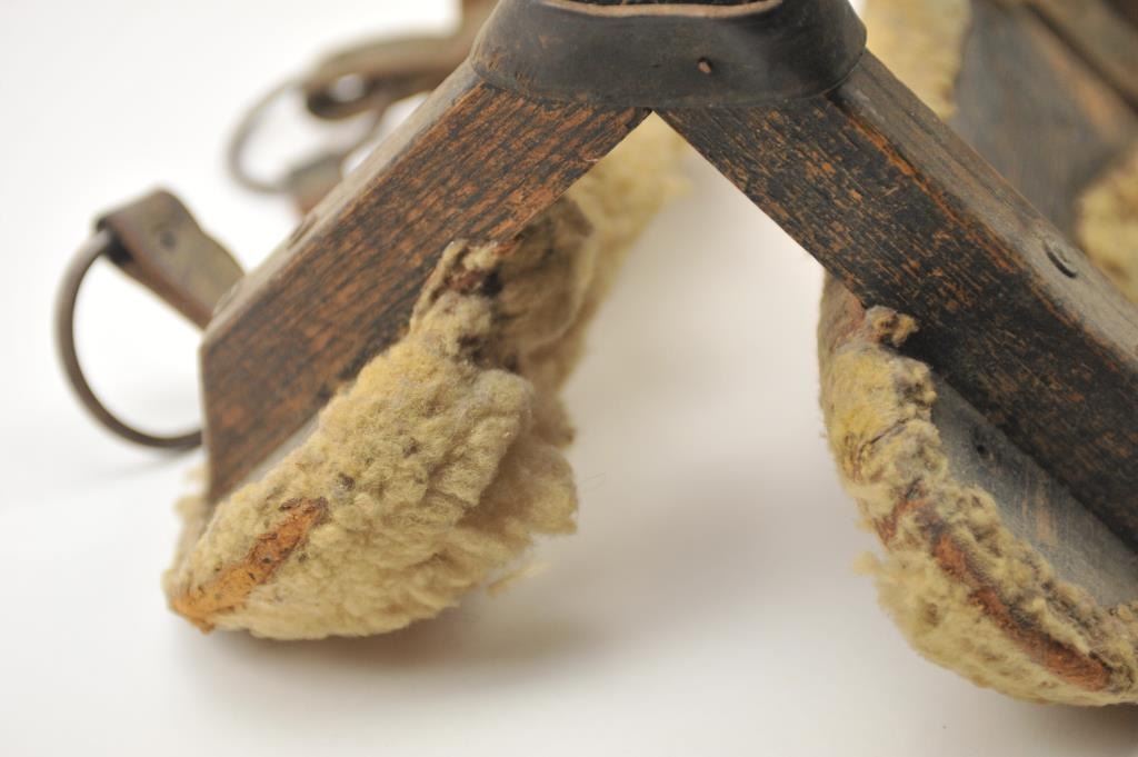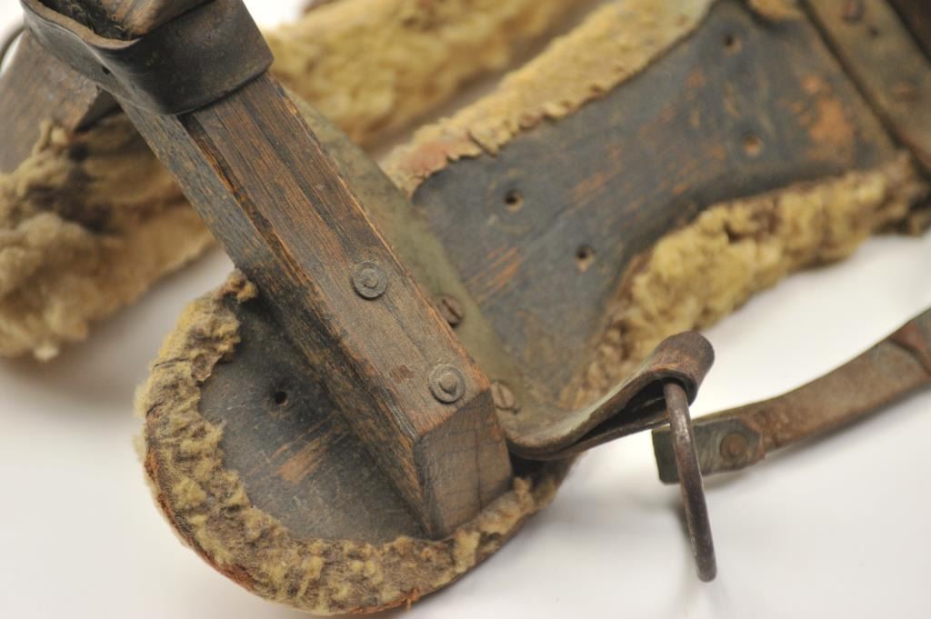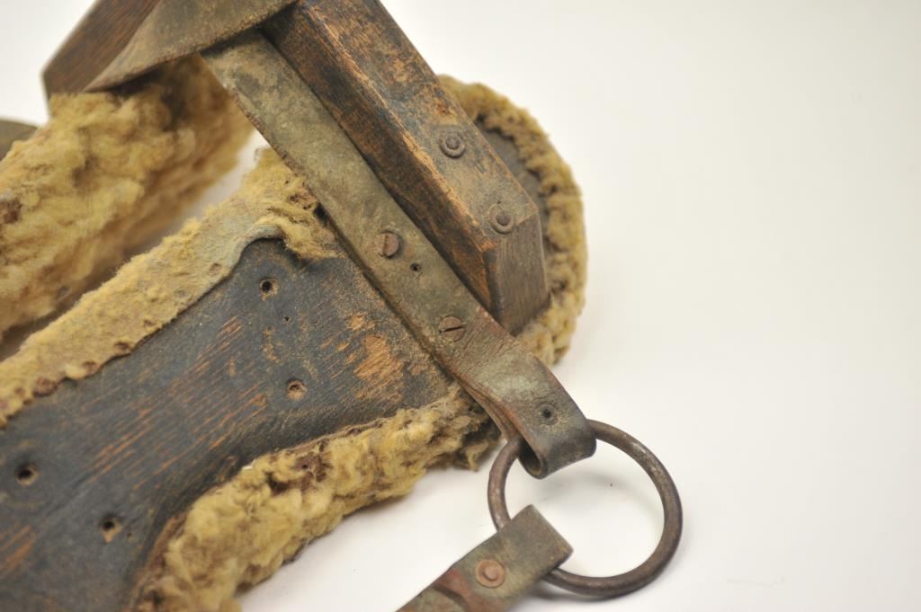 Lot 1 Antique wood and leather pack saddle with sheepskin liner in good overall condition. The pack sad