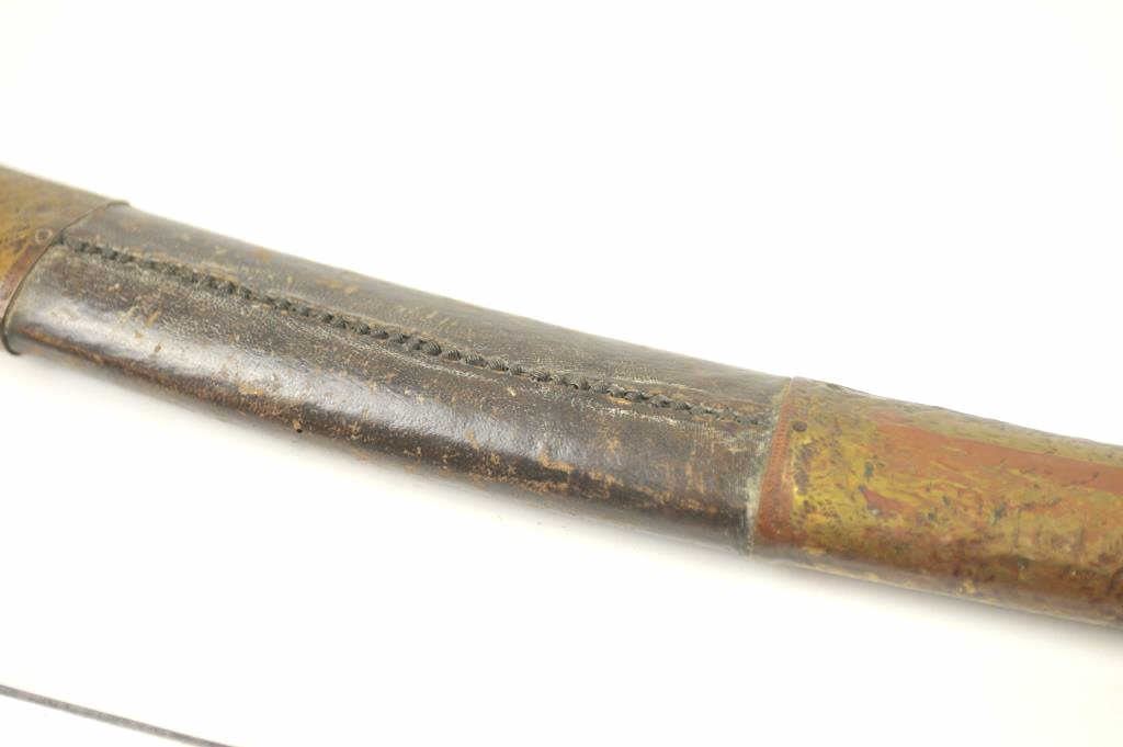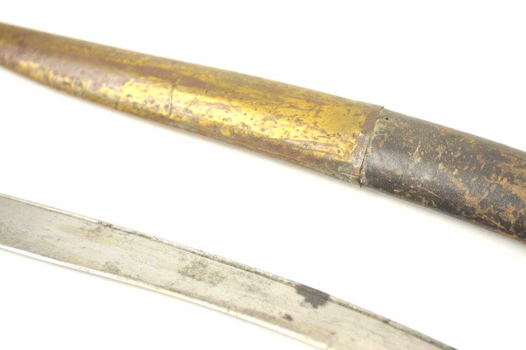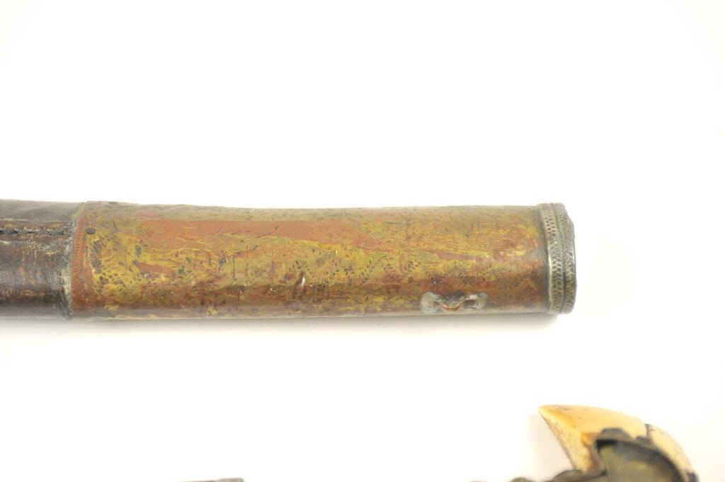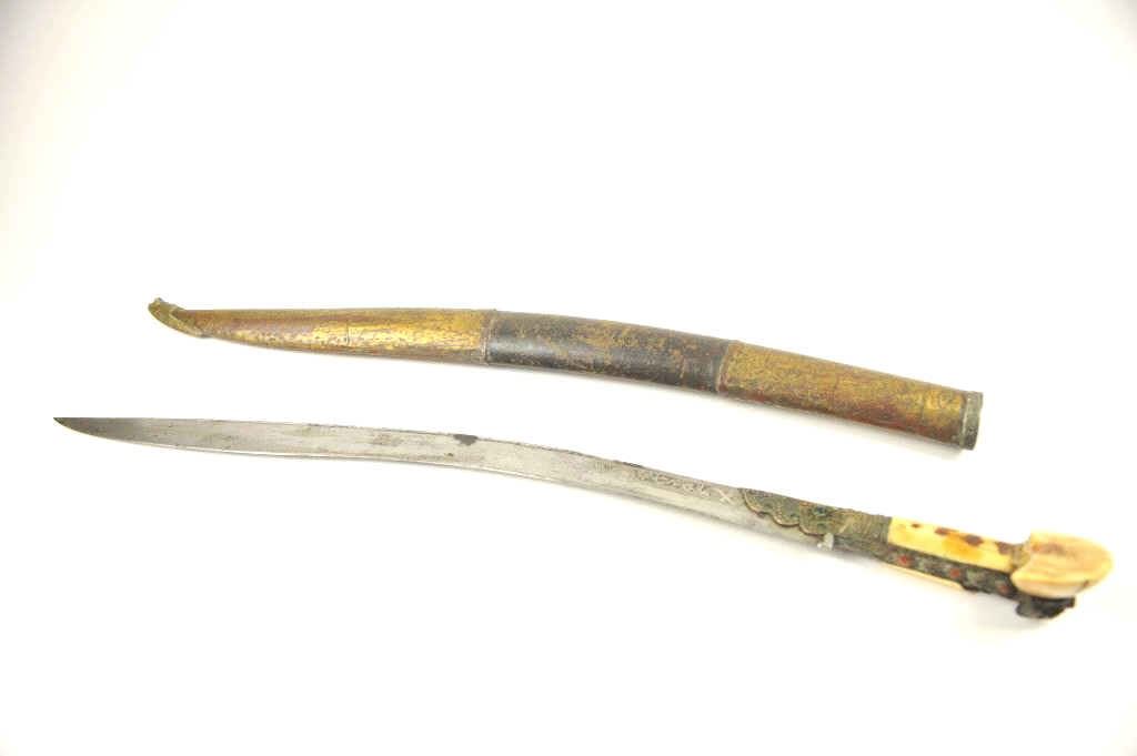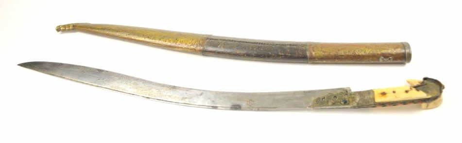 Mid-Eastern Yatagan with silver inlay in blade, showing prayer or signature with coral and faux jewels. The grip is broken and 1 ear is missing. The scabbard is copper and leather over wood. The piece is 19th century or earlier and 28 ½” in overall length. Est.: $175-$350.