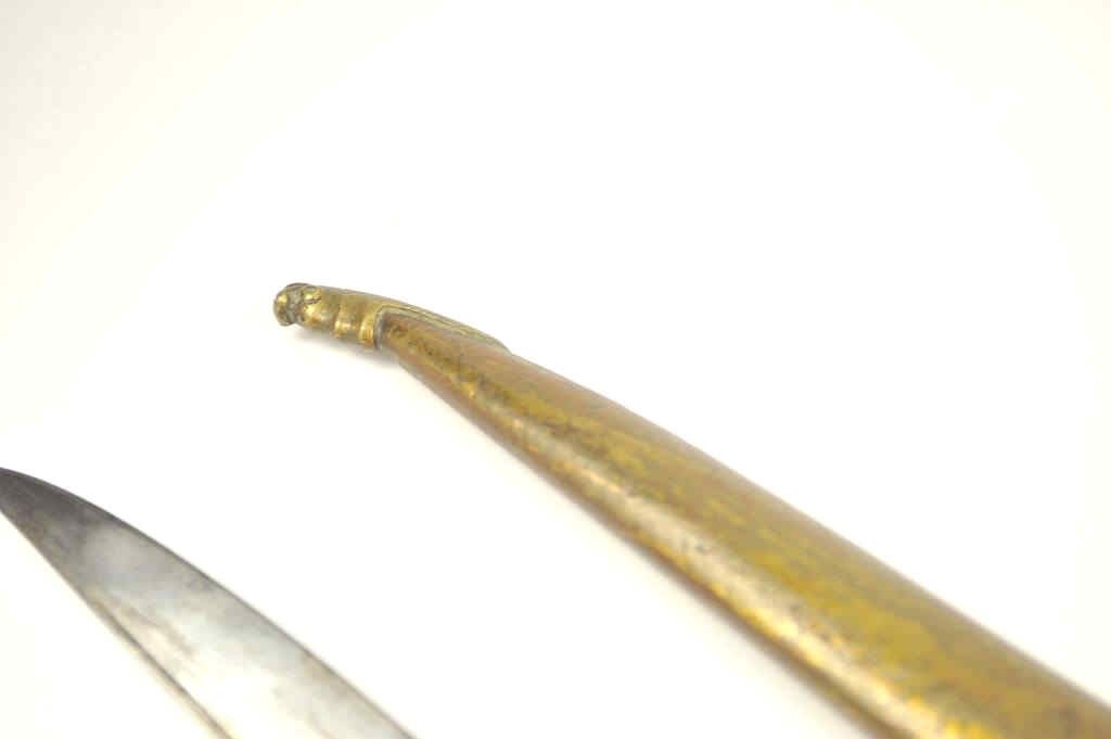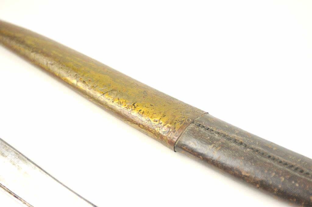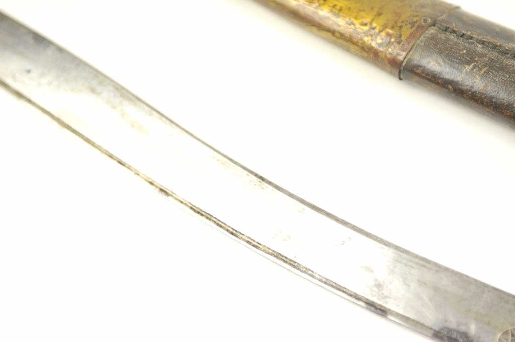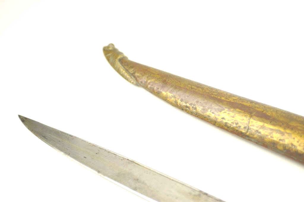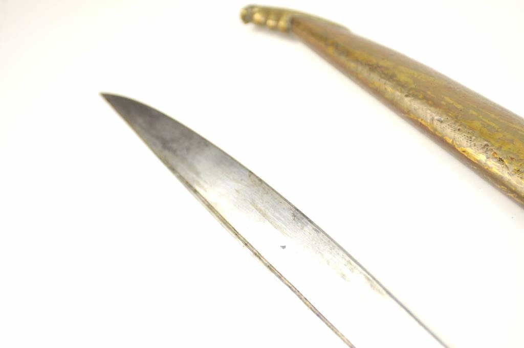Mid-Eastern Yatagan with silver inlay in blade, showing prayer or signature with coral and faux jewels. The grip is broken and 1 ear is missing. The scabbard is copper and leather over wood. The piece is 19th century or earlier and 28 ½” in overall length. Est.: $175-$350.