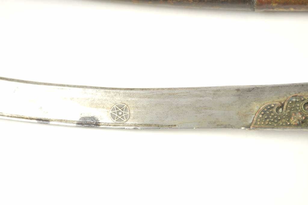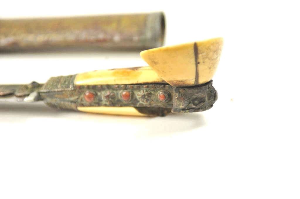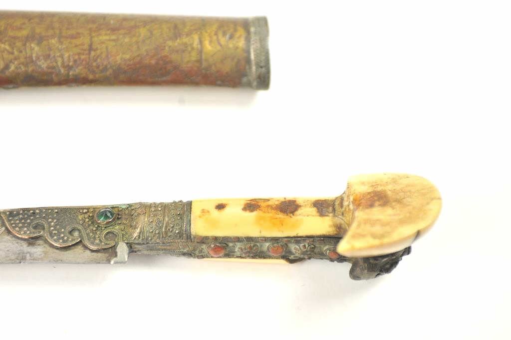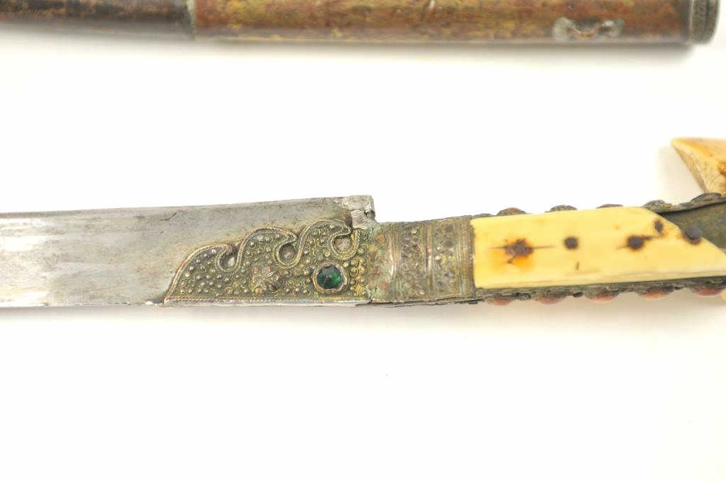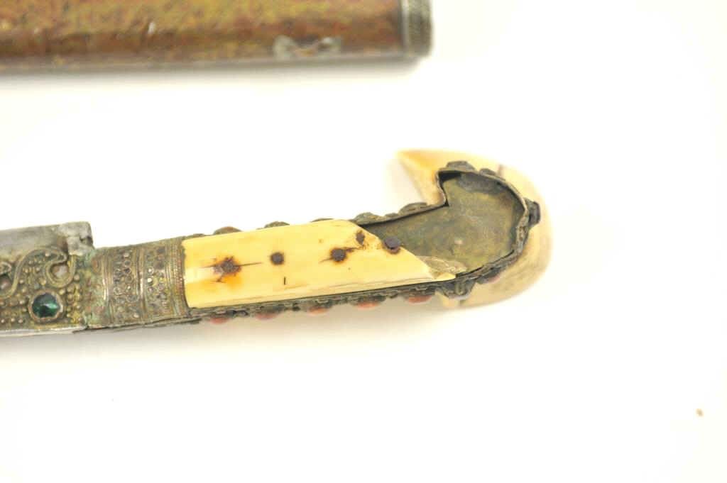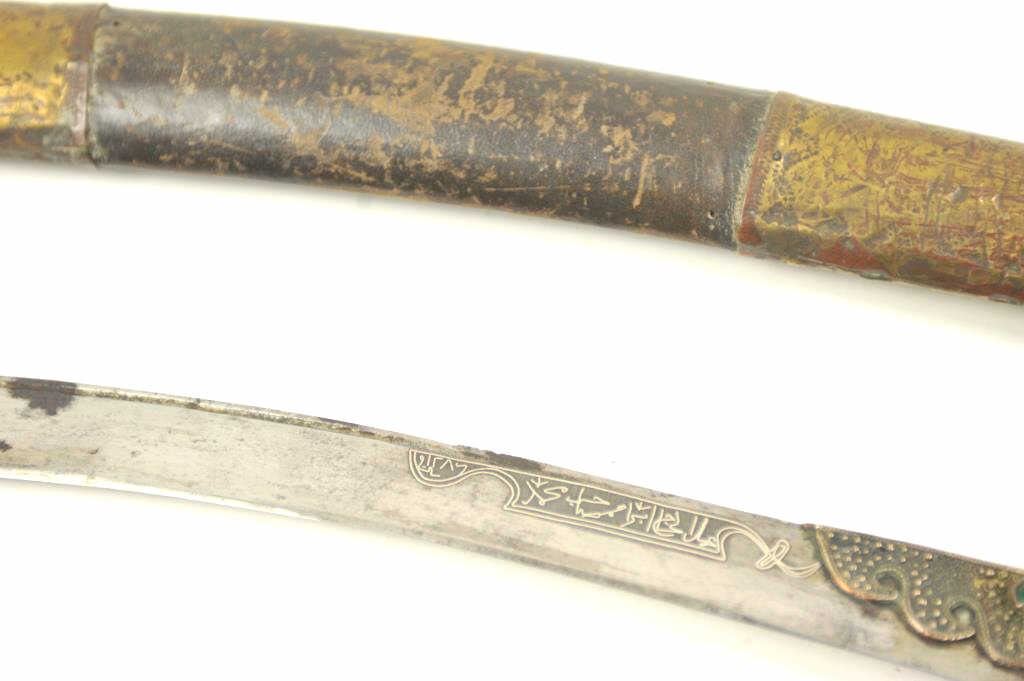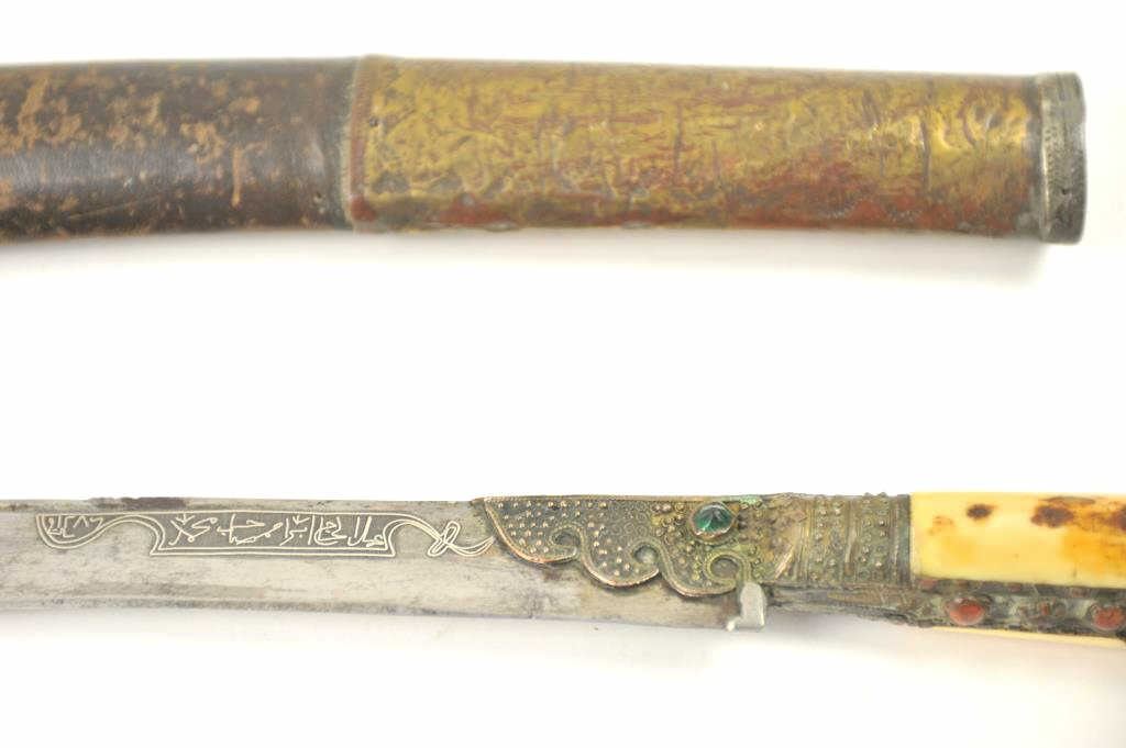 Lot 12a Mid-Eastern Yatagan with silver inlay in blade, showing prayer or signature with coral and faux je