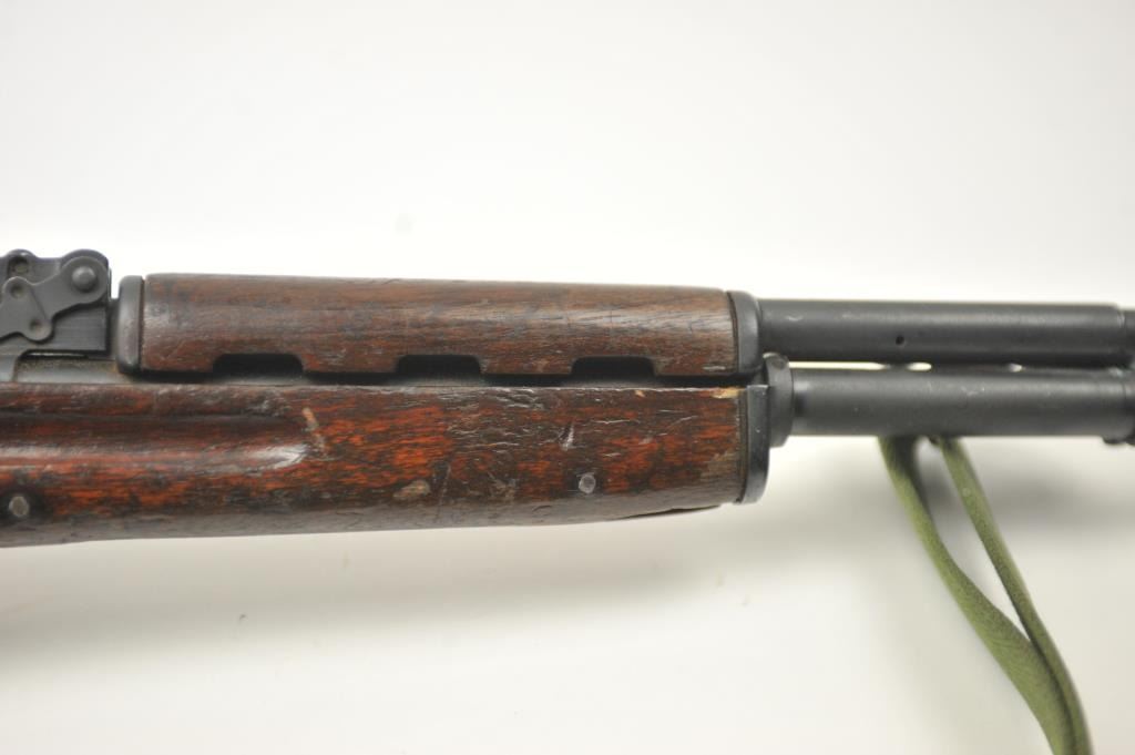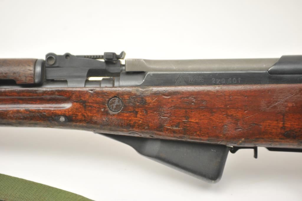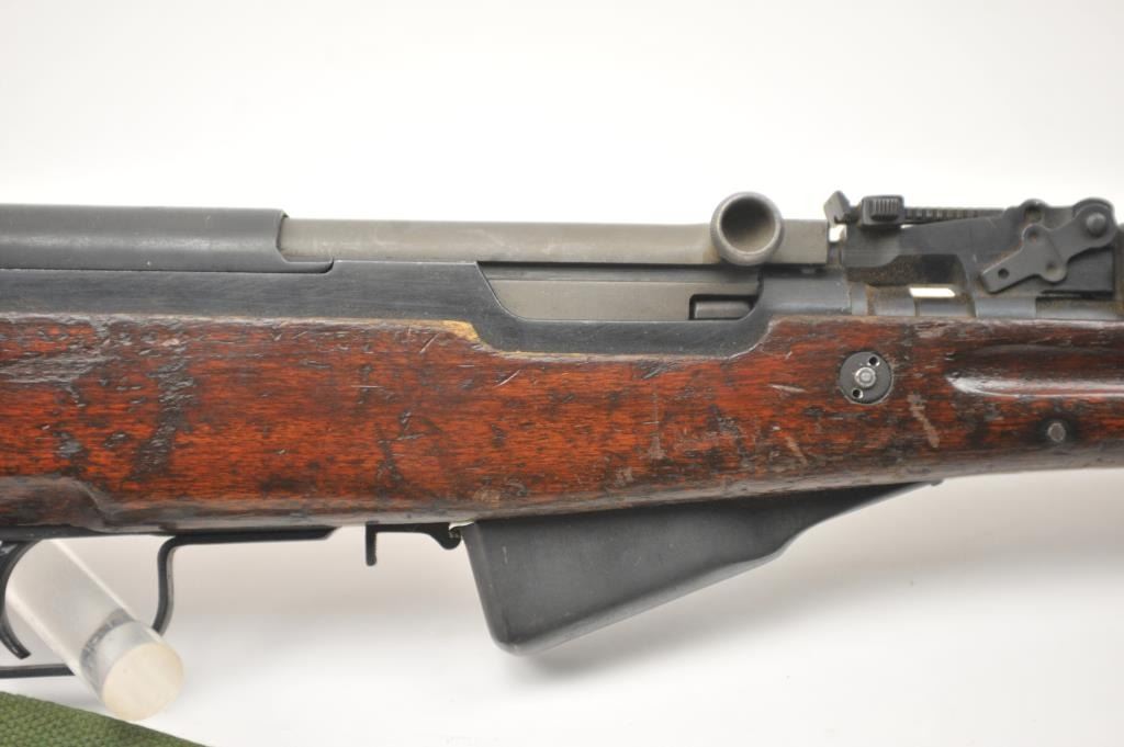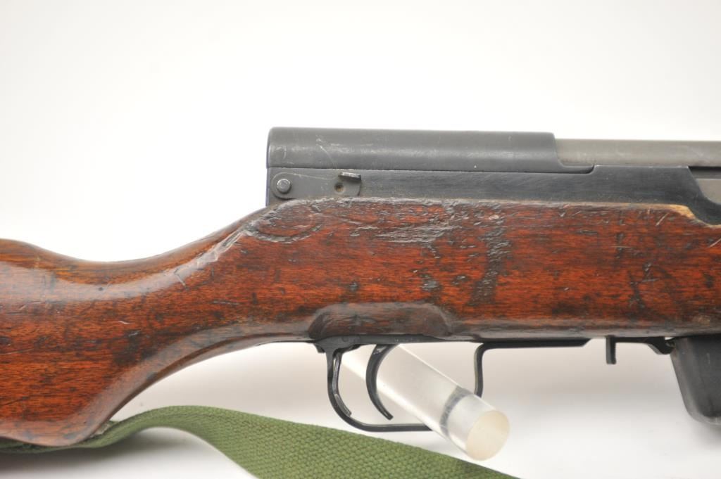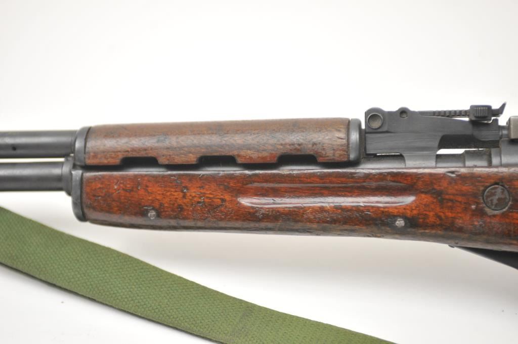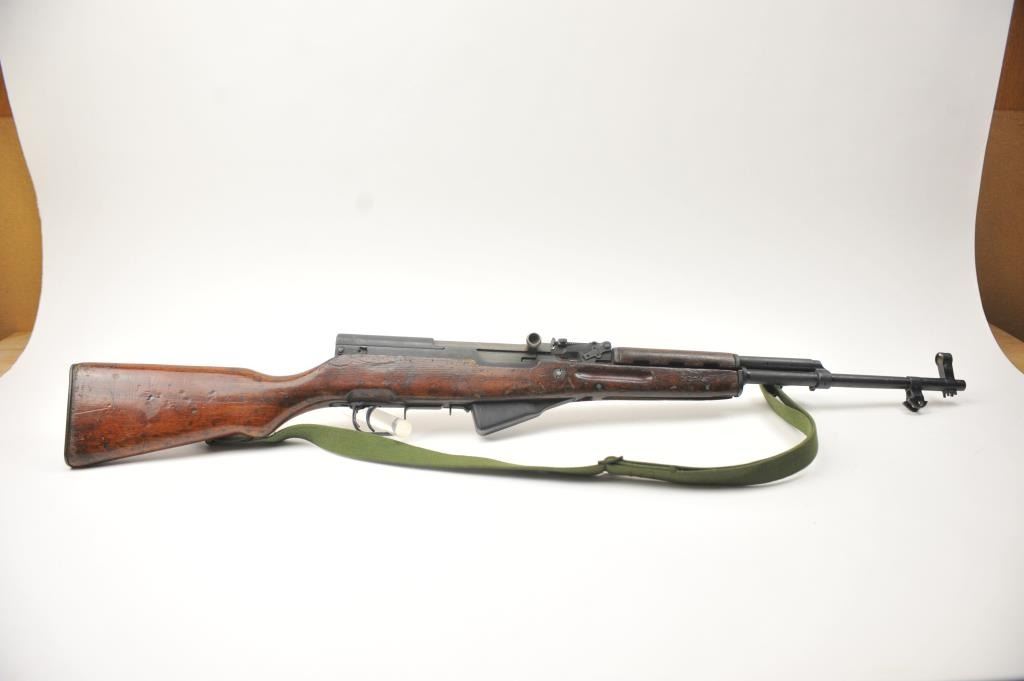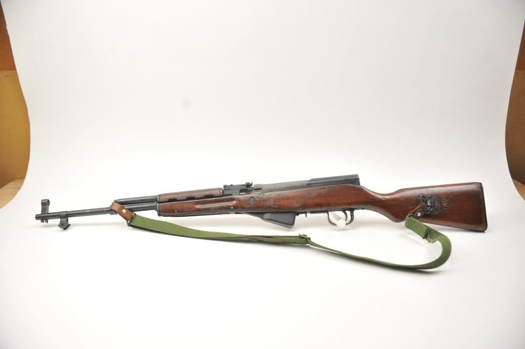 Norinco SKS semi-automatic rifle, 7.62 x 39 caliber, Serial #2X0401. The rifle is in good to nearly very good overall condition with a 20” barrel with a hooded front and military tangent style rear sights. Therifle is import marked on the left side of the action with all matching visible serial numbers. The smooth wood stock shows moderate to heavy use with the serial number on the left side of the butt stock, slingswivels and a period canvas military style sling. The bayonet has been removed. The bore is fair, the action functions and the markings are legible. The lot includes the original instruction manual. Est.:$300-$600. (Modern).