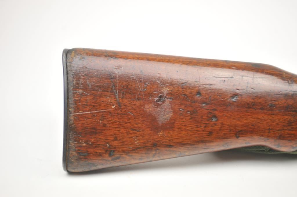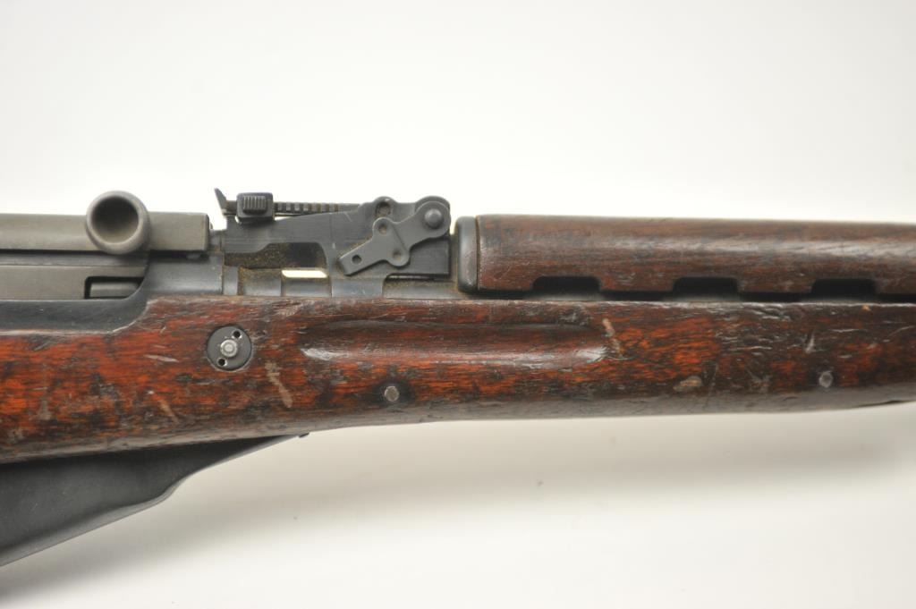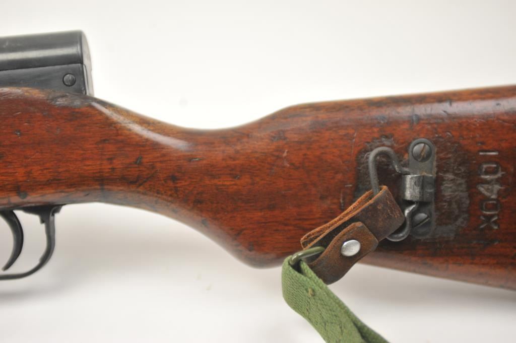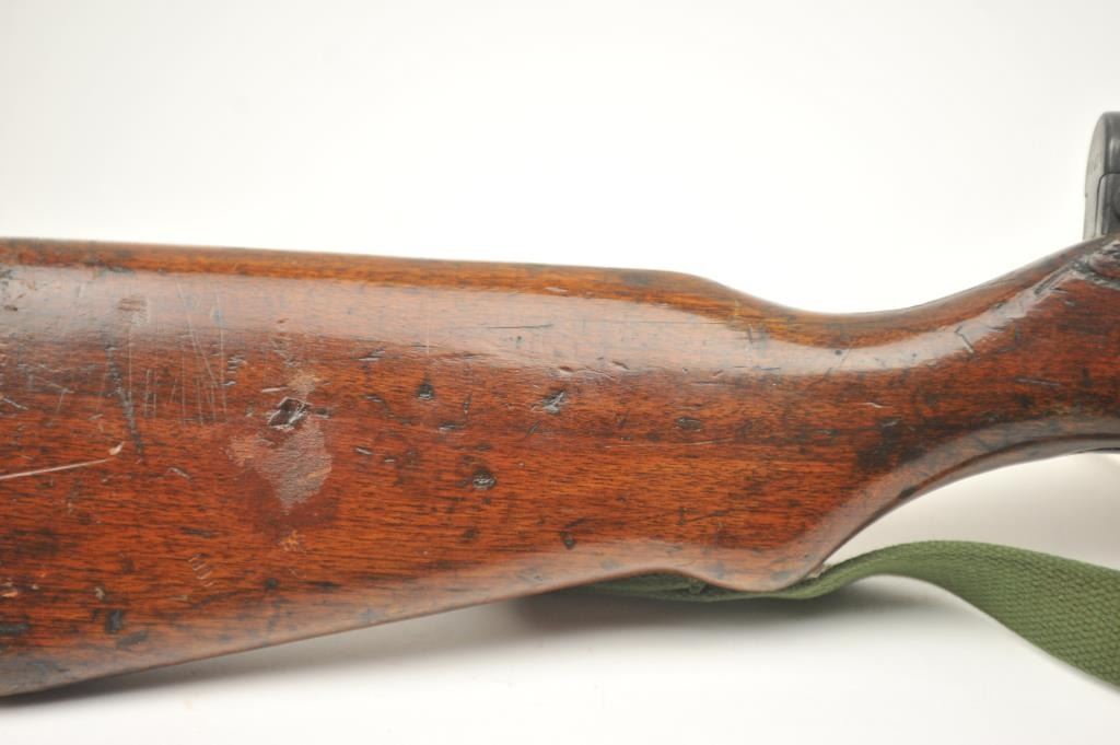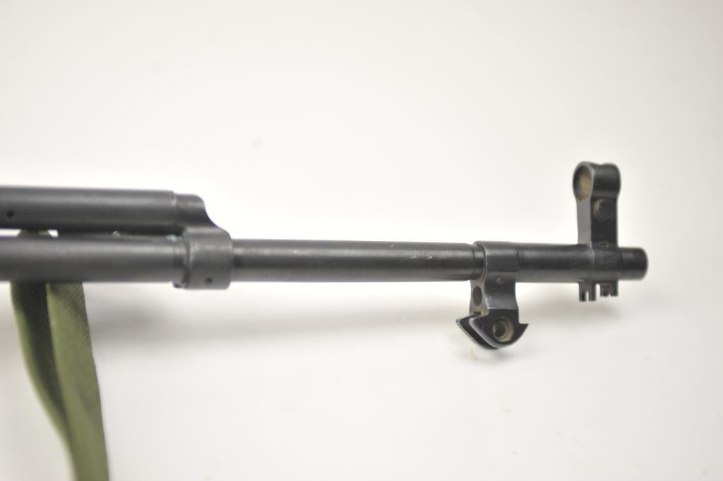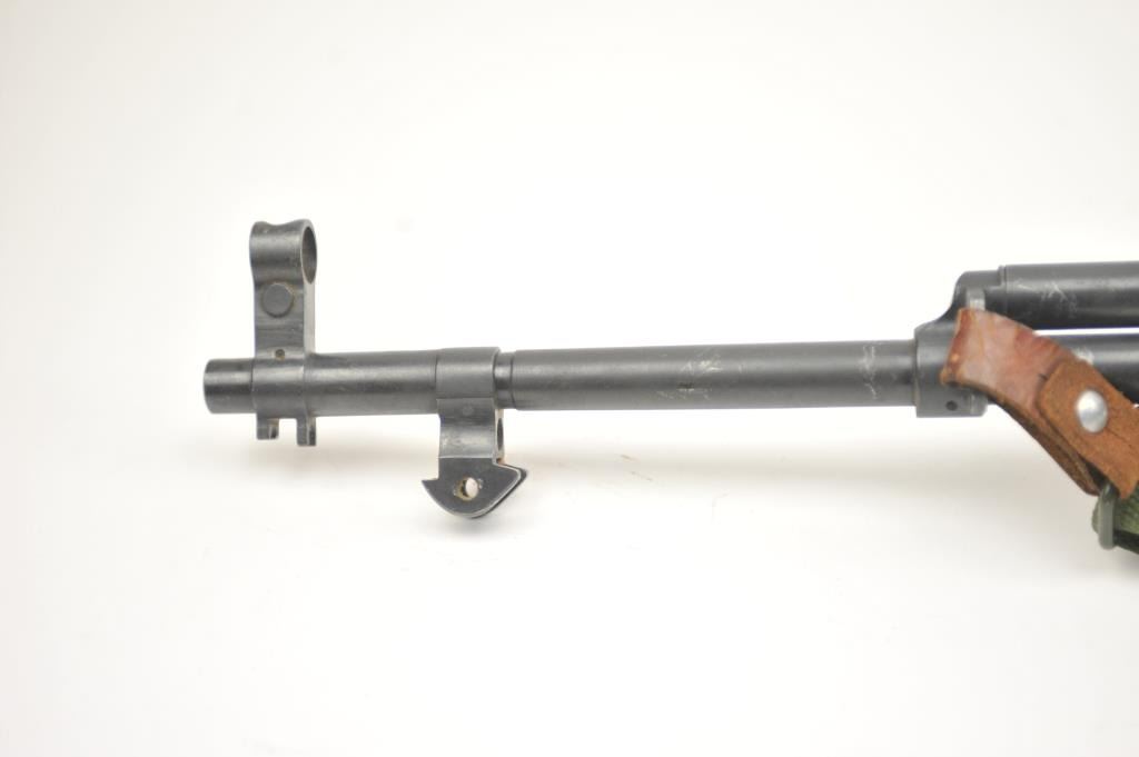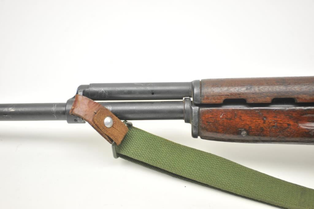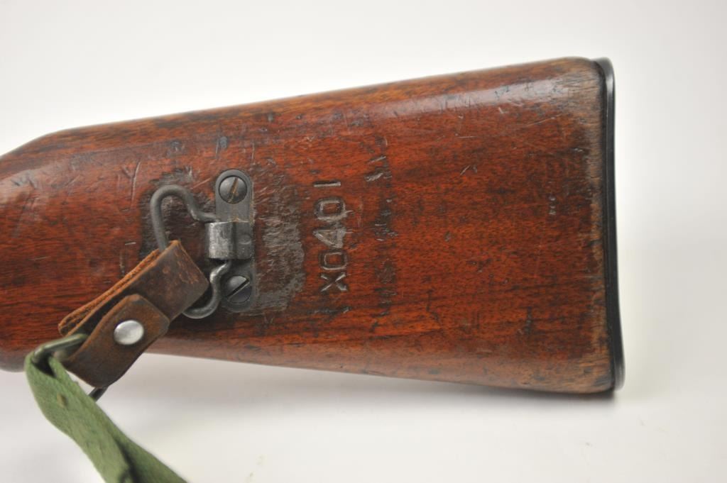 Norinco SKS semi-automatic rifle, 7.62 x 39 caliber, Serial #2X0401. The rifle is in good to nearly very good overall condition with a 20” barrel with a hooded front and military tangent style rear sights. Therifle is import marked on the left side of the action with all matching visible serial numbers. The smooth wood stock shows moderate to heavy use with the serial number on the left side of the butt stock, slingswivels and a period canvas military style sling. The bayonet has been removed. The bore is fair, the action functions and the markings are legible. The lot includes the original instruction manual. Est.:$300-$600. (Modern).