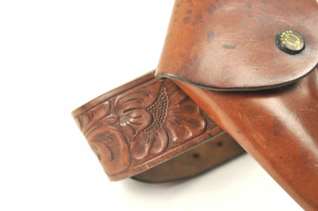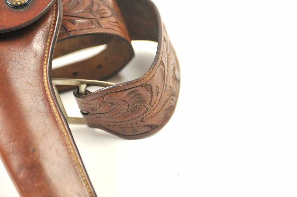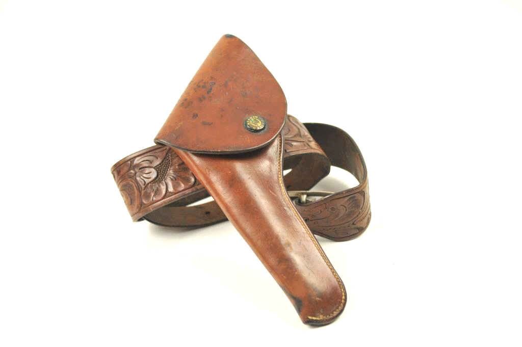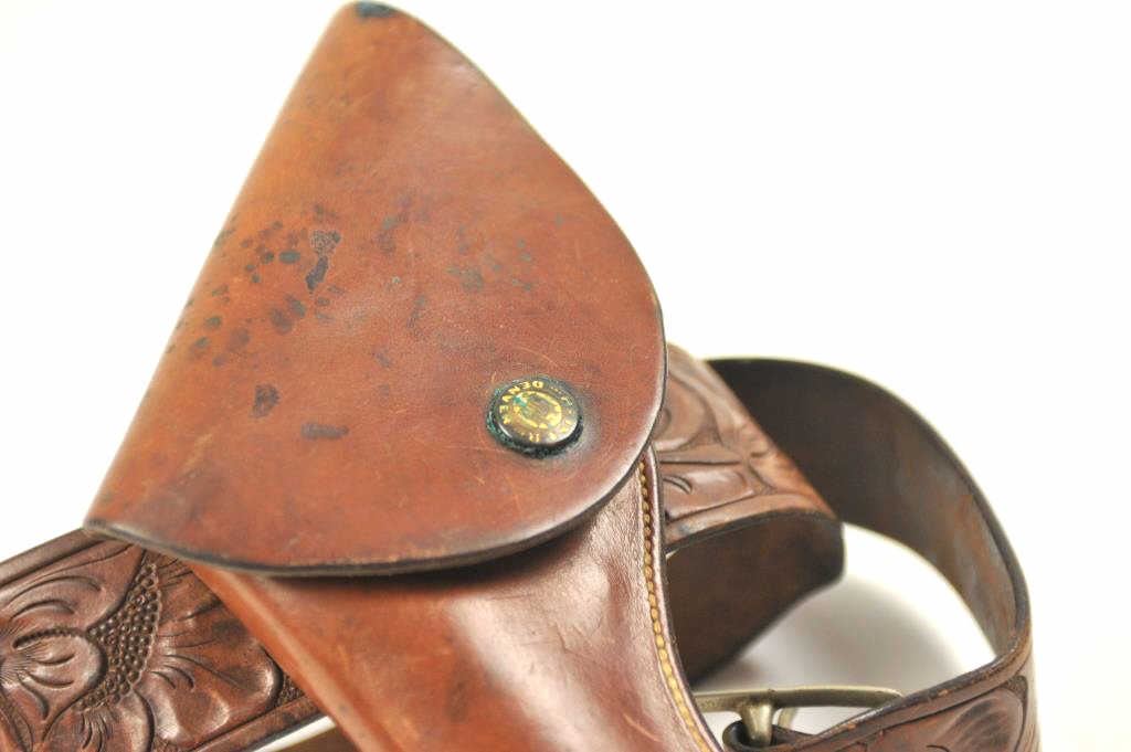 “Heiser Denver” marked 6” flap holster for medium frame double action revolver, #1435. Along with “Heiser Denver” marked tooled leather belt #16. Measures 2 ½” wide at the widest point. 28”-32” waist. Not a match butpossibly mated at the time of use circa 1930s-50s. Est.: $175-$350