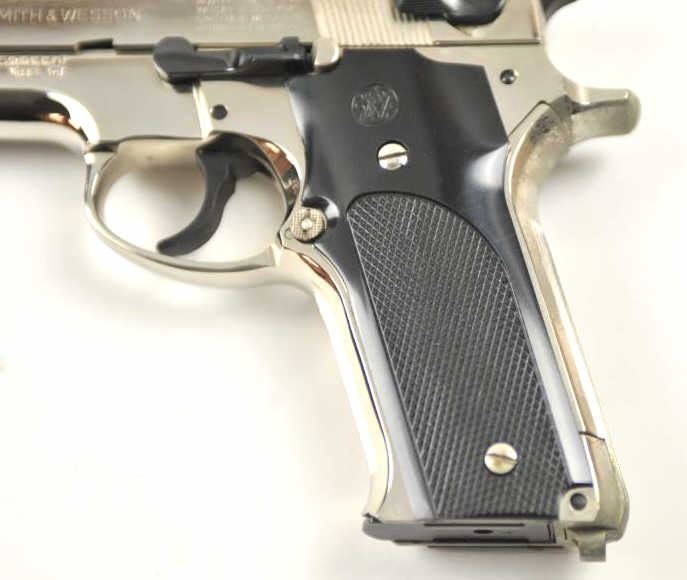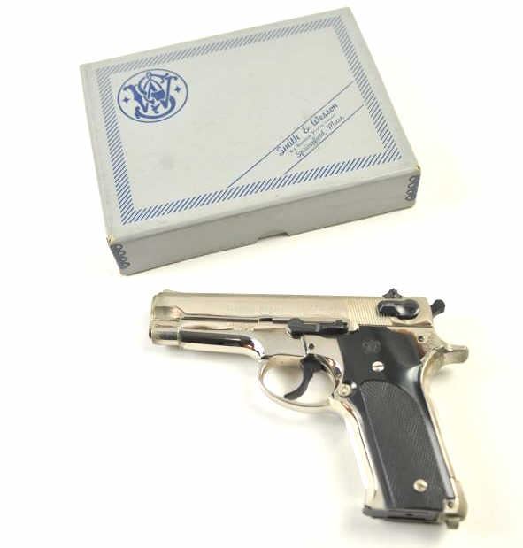 Smith & Wesson DA Model 59 semi-automatic pistol, 9mm caliber, Serial #A368338. The pistol is in fine overall condition with a 4” barrel with an adjustable rear sight. The pistol retains nearly all of the nickelfinish with some areas of light frosting. The checkered plastic grips are in excellent condition with sharp checkering. The pistol comes with the grey and blue factory Smith & Wesson cardboard box with a cleaning rod, all associated packaging materials, two correct magazines and a matching end label. The bore is good, the action is crisp and the markings are sharp. Est.: $400-$800. (Modern/PPT).