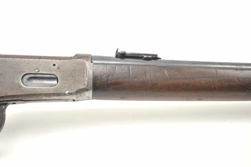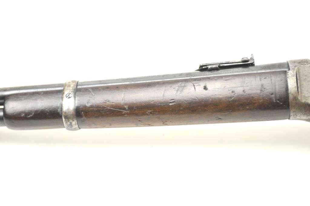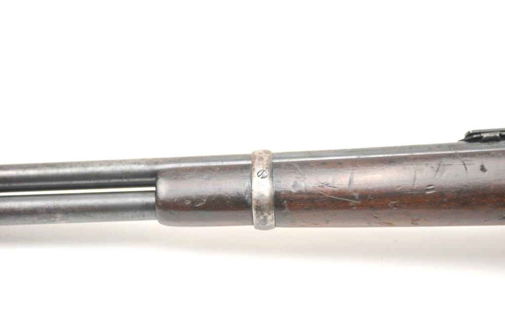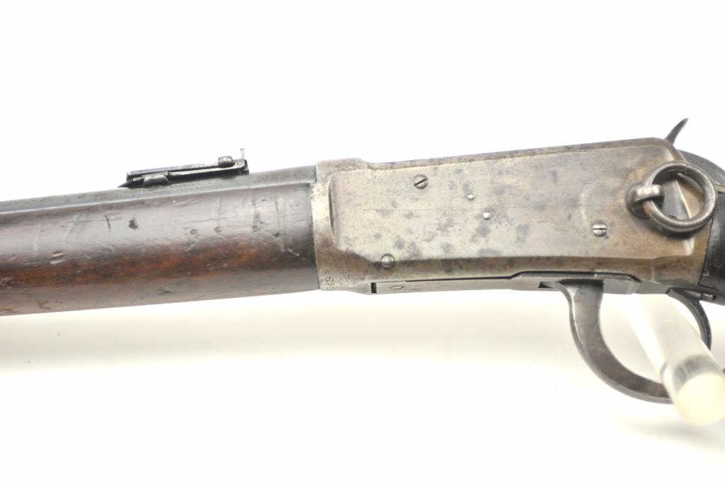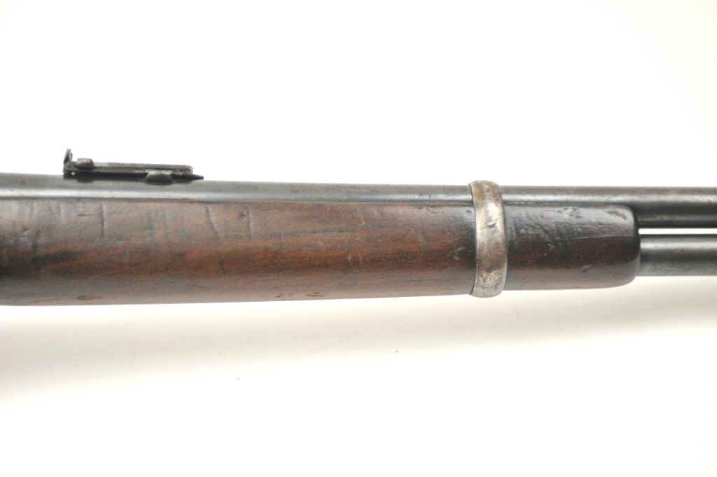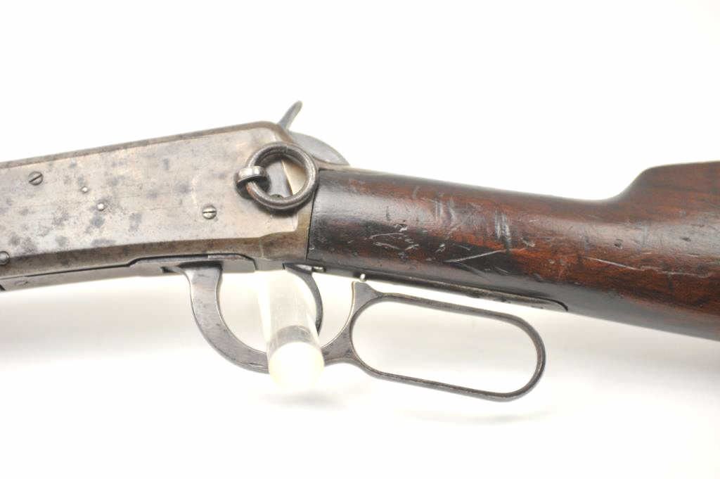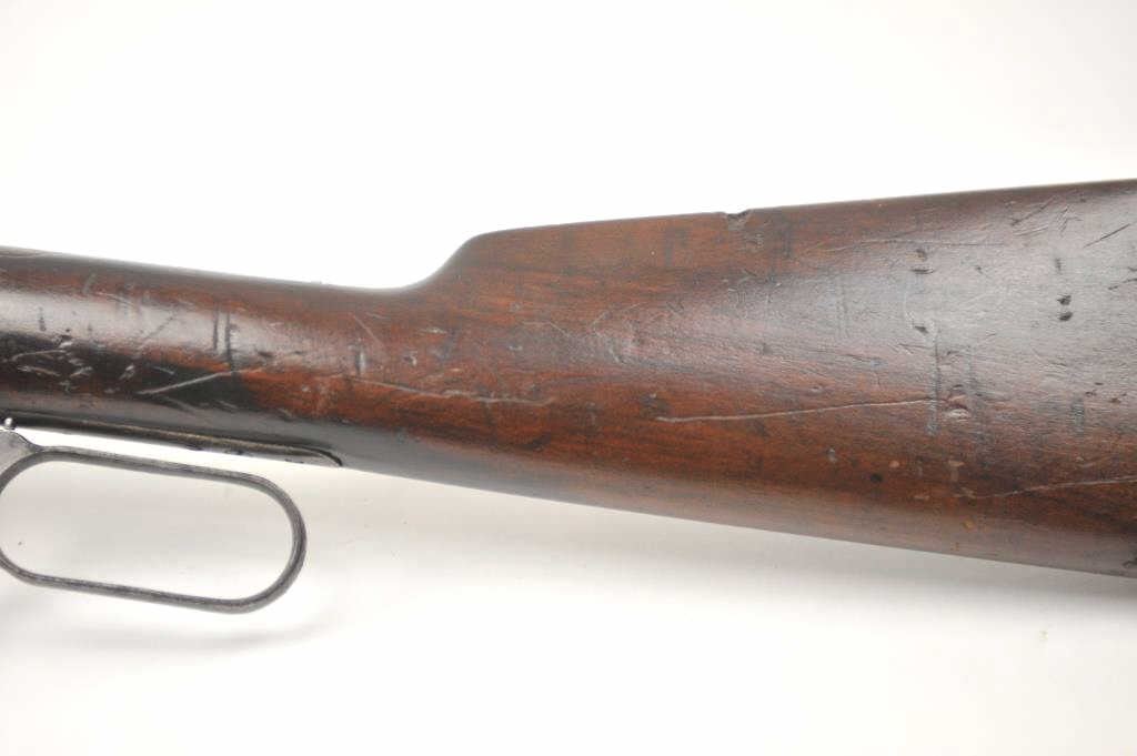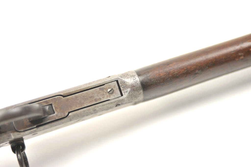 Winchester Model 1894 lever action saddle ring carbine, .30 WCF caliber, Serial #809348. The carbine is in very good to nearly fine overall condition with a 20” barrel with a full-length magazine. A Kingsight has been added at the front with a ladder style rear sight. The barrel and magazine retain a significant amount of thinning blue finish drifting to a dark patina. The receiver has gone to a mottledpatina with original blue still evident in the protected areas and on the loading gate. The saddle ring is retained with “E.B.S.” stamped on the underside of the action, possibly indicating issue to a lawenforcement agency. The smooth wood gumwood stock shows moderate to heavy use with dents, bruising and an extra coat of varnish added during the period of use. The smooth steel crescent butt plate is proud at the toe. The bore is bright, the action functions well and the markings are sharp on this saddle ring carbine circa 1917. Est.: $400-$800. (C+R).