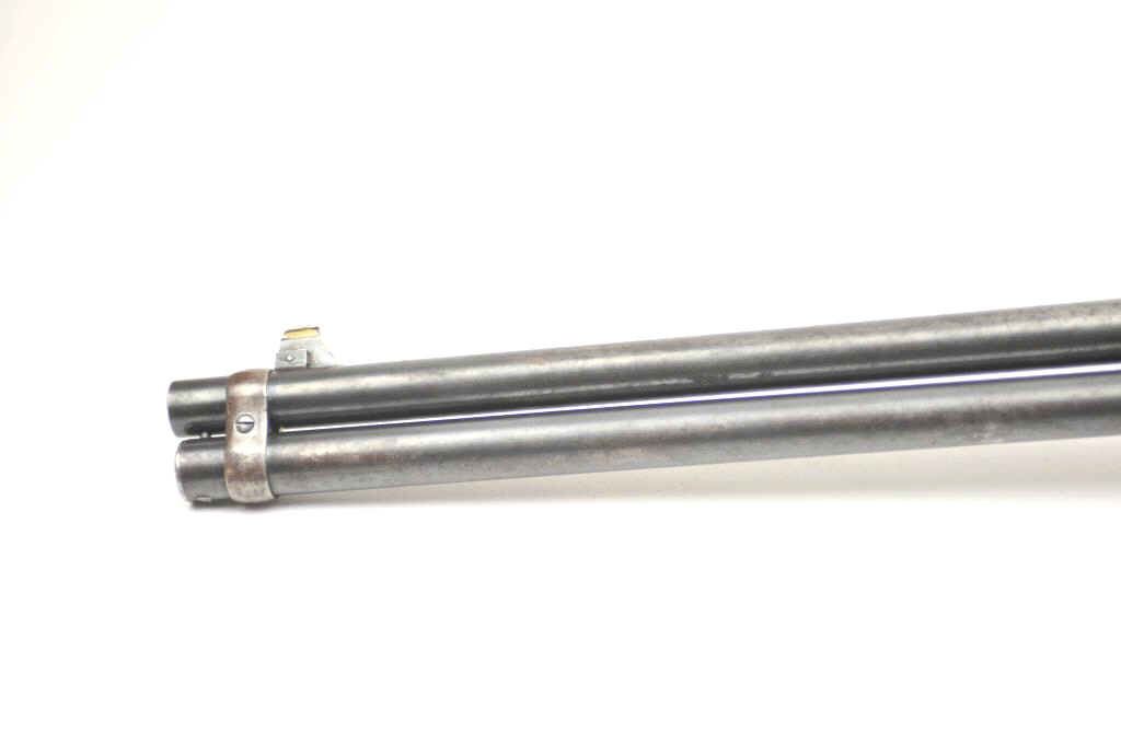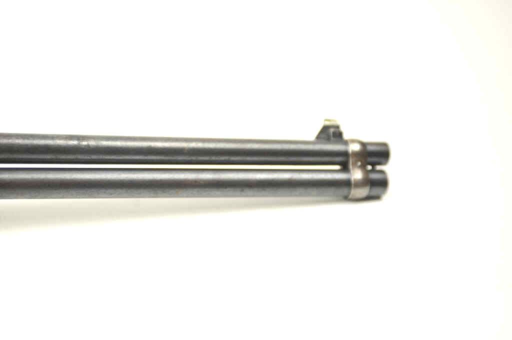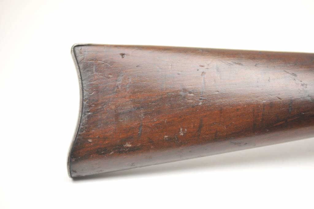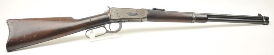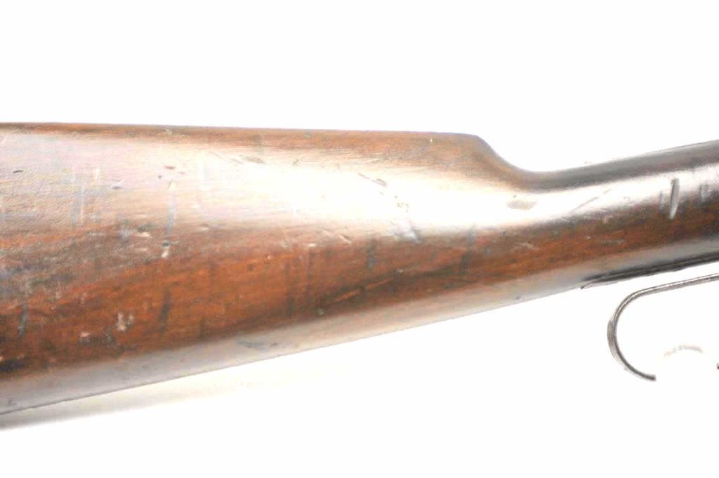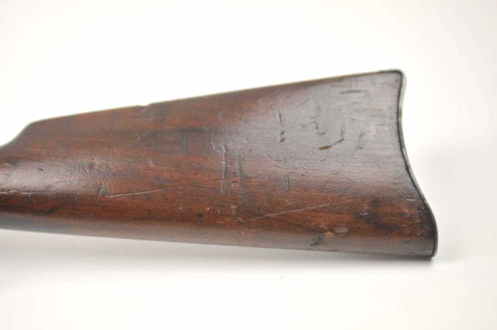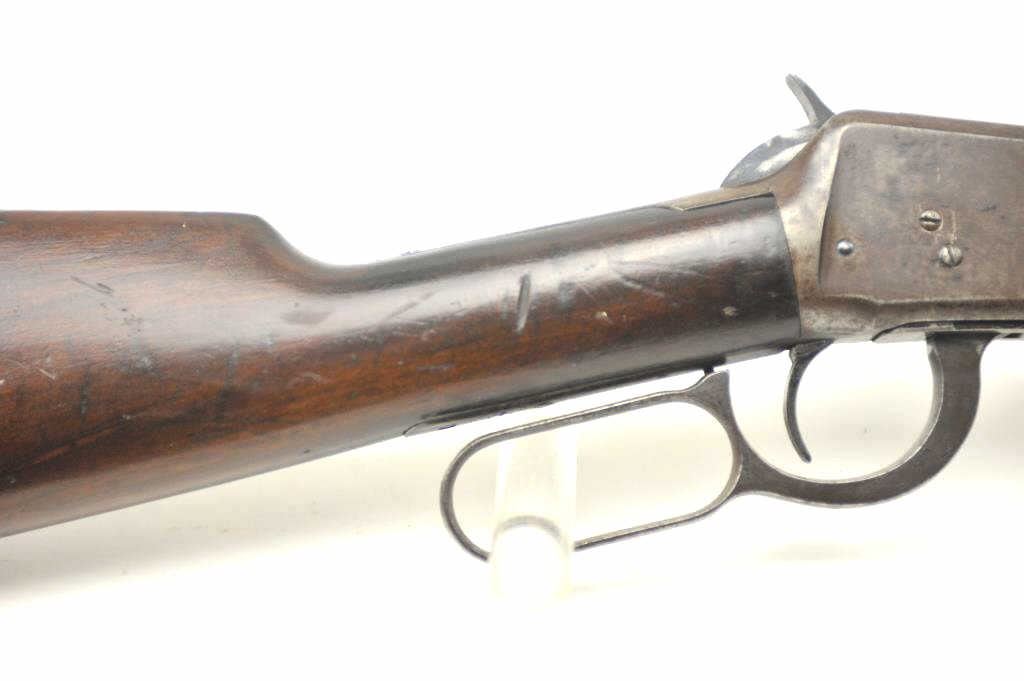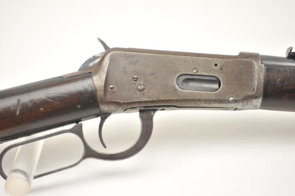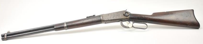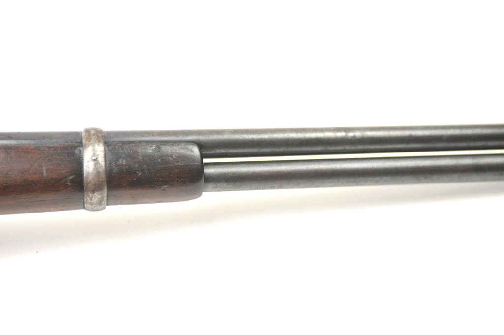 Winchester Model 1894 lever action saddle ring carbine, .30 WCF caliber, Serial #809348. The carbine is in very good to nearly fine overall condition with a 20” barrel with a full-length magazine. A Kingsight has been added at the front with a ladder style rear sight. The barrel and magazine retain a significant amount of thinning blue finish drifting to a dark patina. The receiver has gone to a mottledpatina with original blue still evident in the protected areas and on the loading gate. The saddle ring is retained with “E.B.S.” stamped on the underside of the action, possibly indicating issue to a lawenforcement agency. The smooth wood gumwood stock shows moderate to heavy use with dents, bruising and an extra coat of varnish added during the period of use. The smooth steel crescent butt plate is proud at the toe. The bore is bright, the action functions well and the markings are sharp on this saddle ring carbine circa 1917. Est.: $400-$800. (C+R).