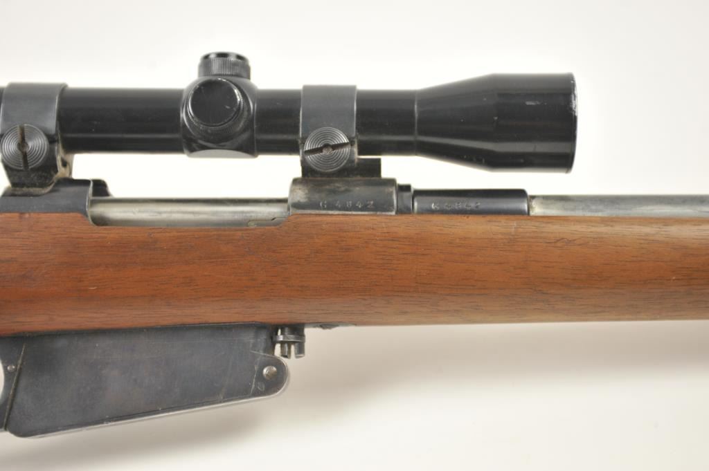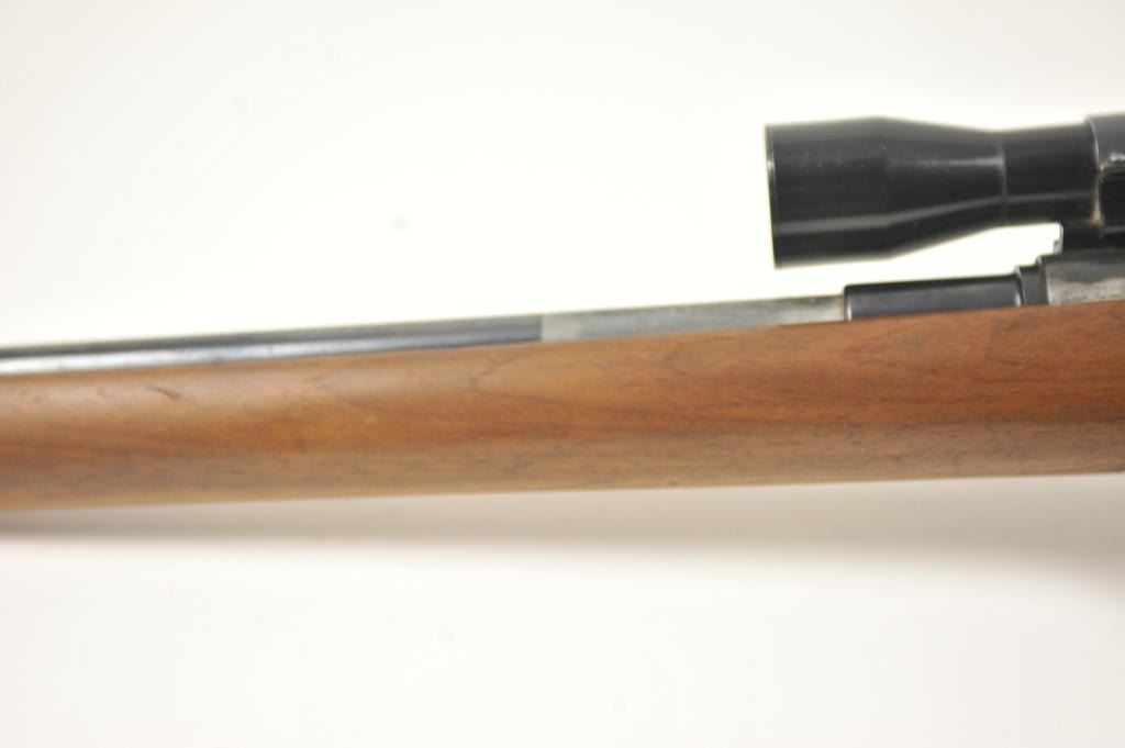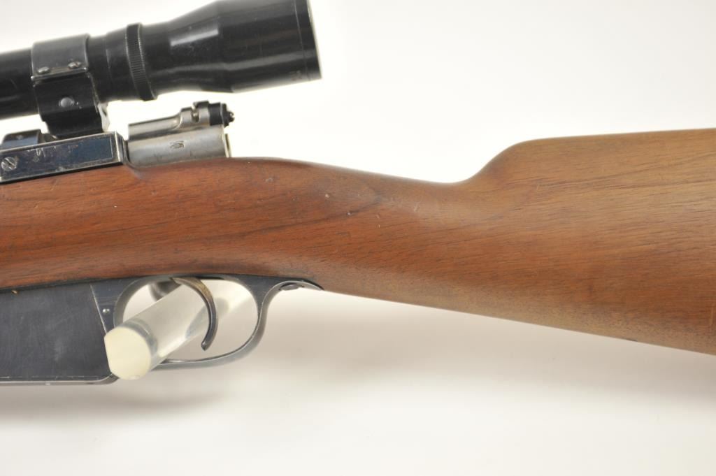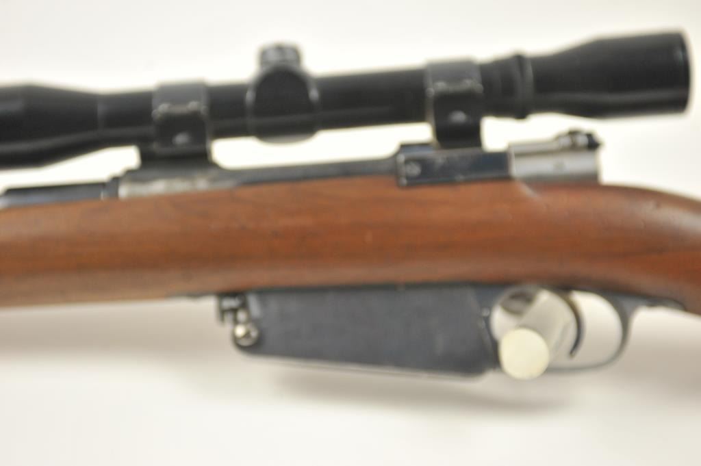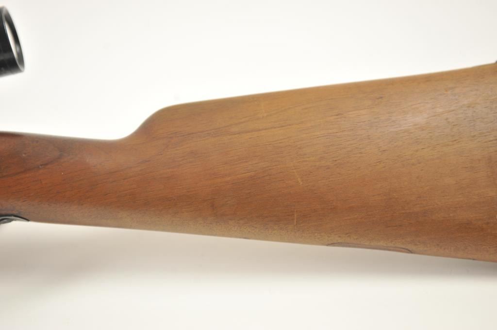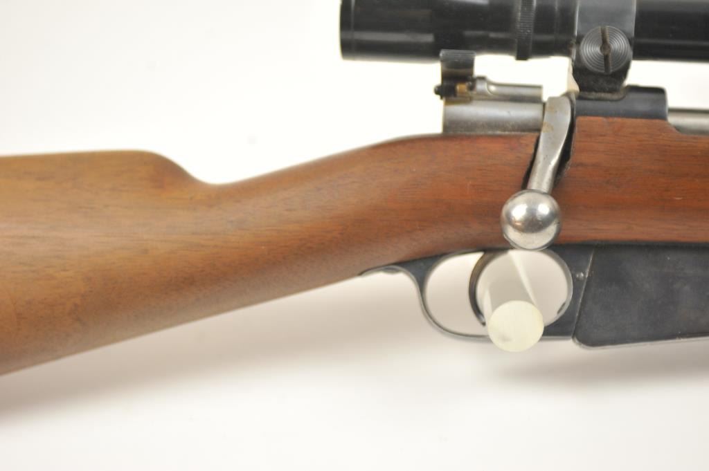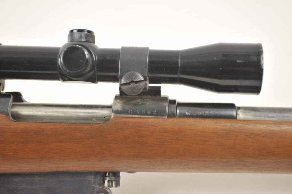 Sporterized Argentine Mauser Model 1891, #G4842, 7.65 cal., 22” barrel, sights have been removed, blued finish, smooth sporter stock with rubber recoil pad, mounted with a Tasco 4x32 scope. The rifle is in good tovery good condition as sporterized, approximately 80-90% finish remains, with the losses mainly under where the sights were mounted and the forward portion of the receiver. The bore is very good, action isgood, stock is good with a small inlaid repair of a swivel mount in the butt. The barrel, receiver and magazine are matching numbers, the bolt is unmarked. (Antique) Est. $200-400