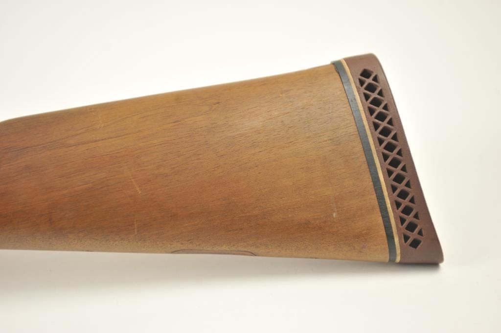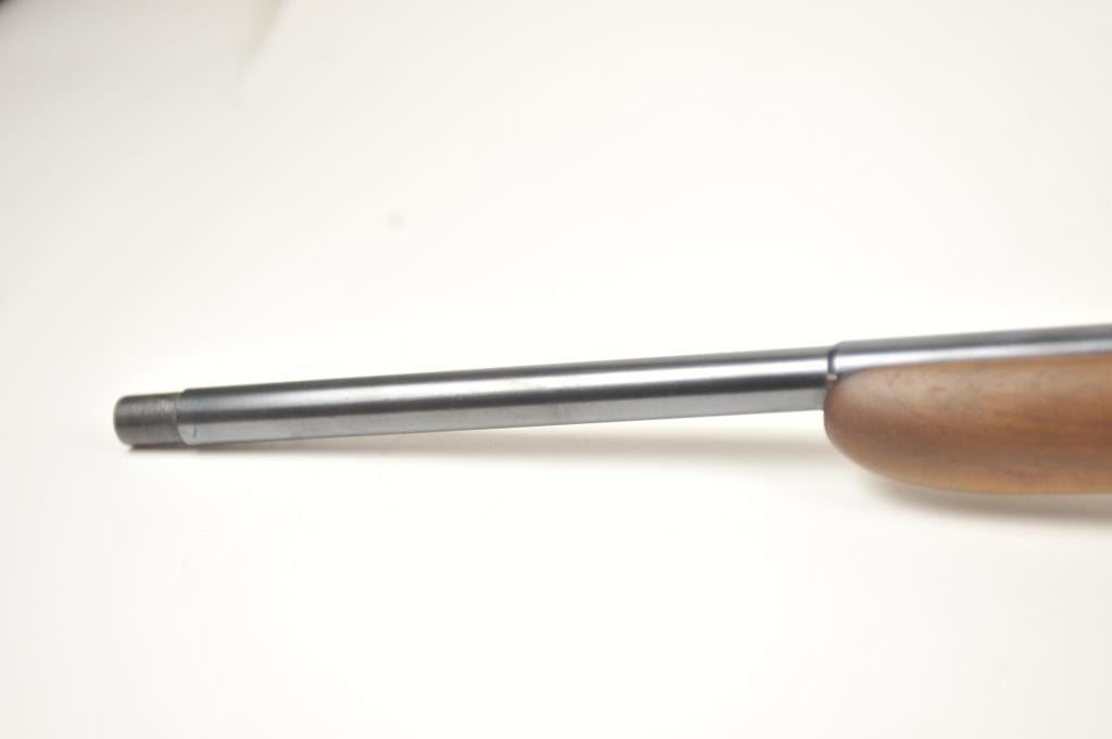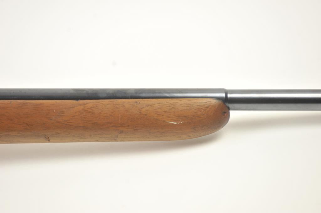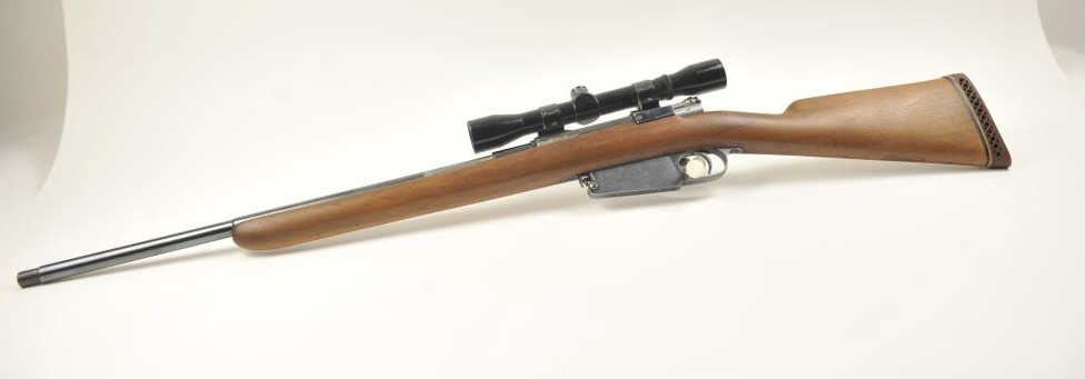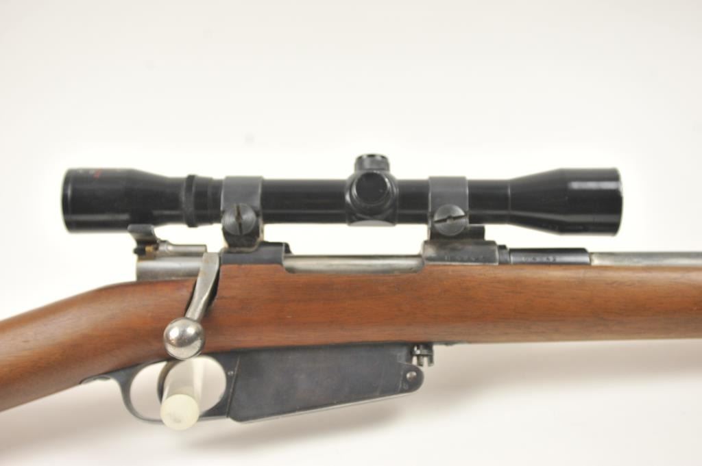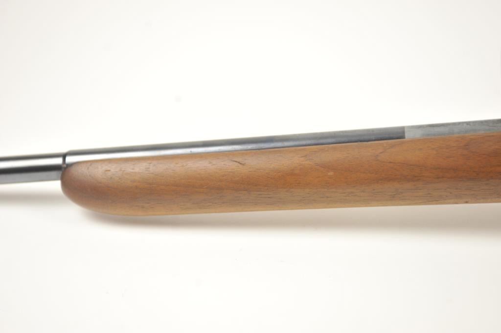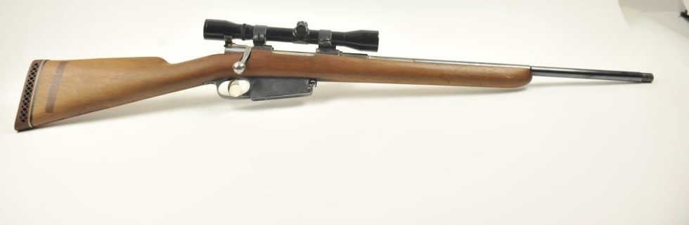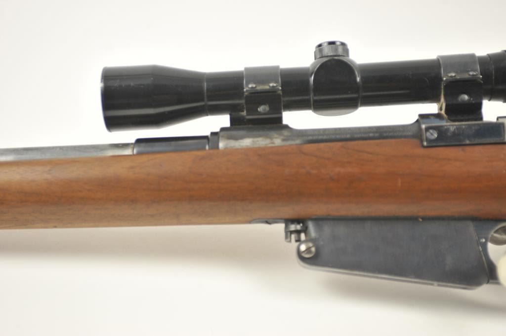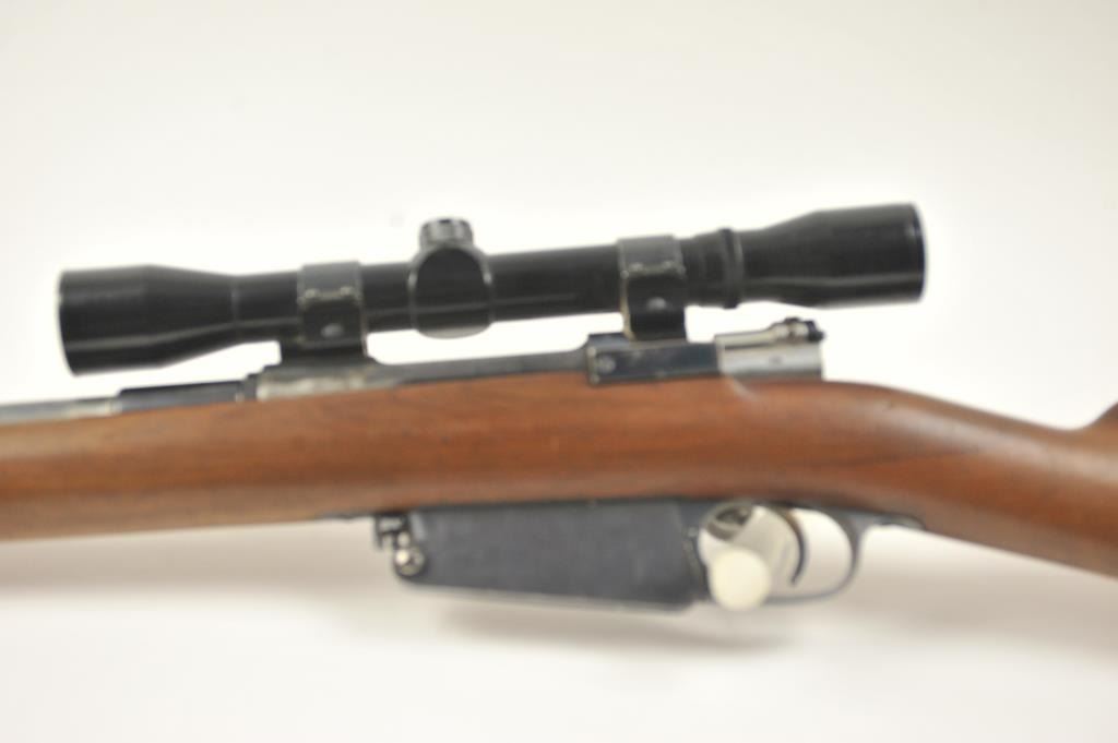 Sporterized Argentine Mauser Model 1891, #G4842, 7.65 cal., 22” barrel, sights have been removed, blued finish, smooth sporter stock with rubber recoil pad, mounted with a Tasco 4x32 scope. The rifle is in good tovery good condition as sporterized, approximately 80-90% finish remains, with the losses mainly under where the sights were mounted and the forward portion of the receiver. The bore is very good, action isgood, stock is good with a small inlaid repair of a swivel mount in the butt. The barrel, receiver and magazine are matching numbers, the bolt is unmarked. (Antique) Est. $200-400