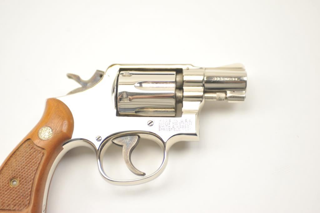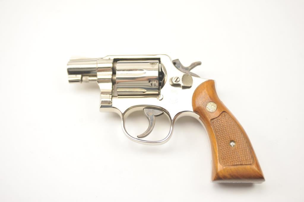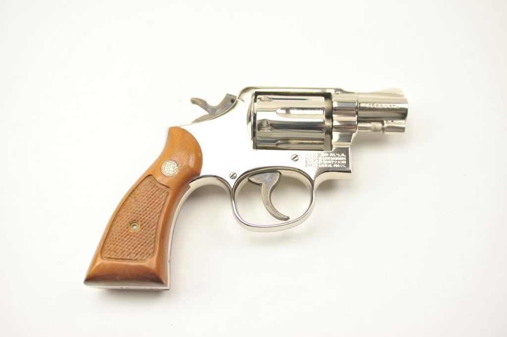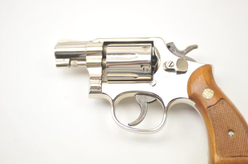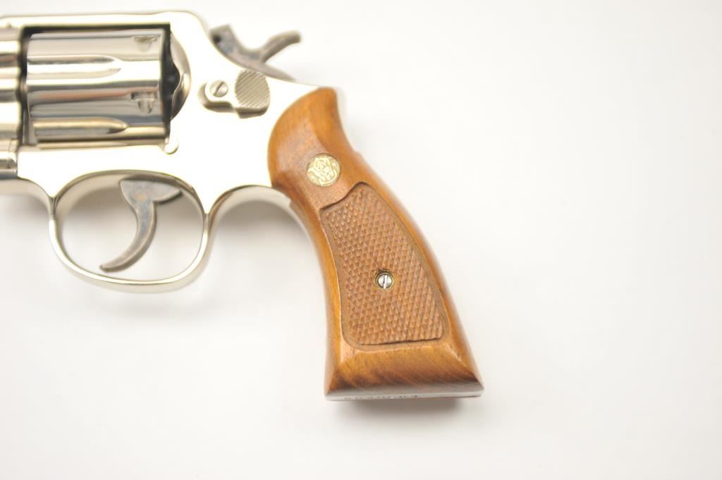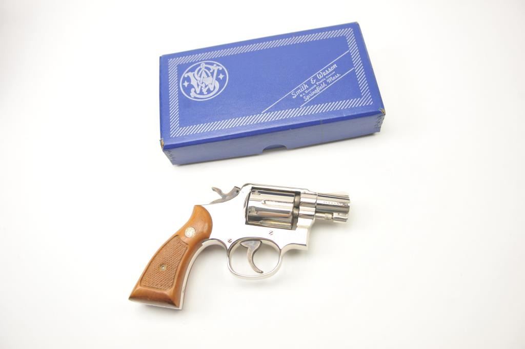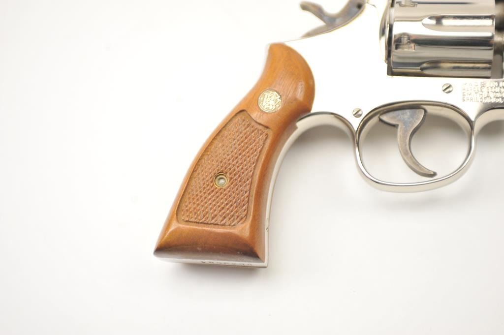Smith & Wesson Model 10-7 DA revolver, .38 S&W Special caliber, Serial #8D49584. The pistol is in nearly excellent overall condition with a 2” pinned barrel. The pistol retains approximately 98-99% of thepolished nickel finish with only light scratches. The checkered wood medallion grips arte excellent with sharp checkering. The hammer and trigger show vivid case colors. The bore is very good and the action is crisp. The lot includes the original factory card board box with matching end label and all associated packaging materials. Est.: $700-$1,400. (C+R/PPT).