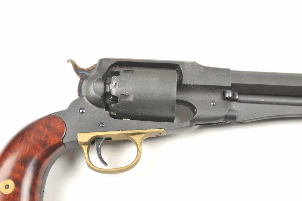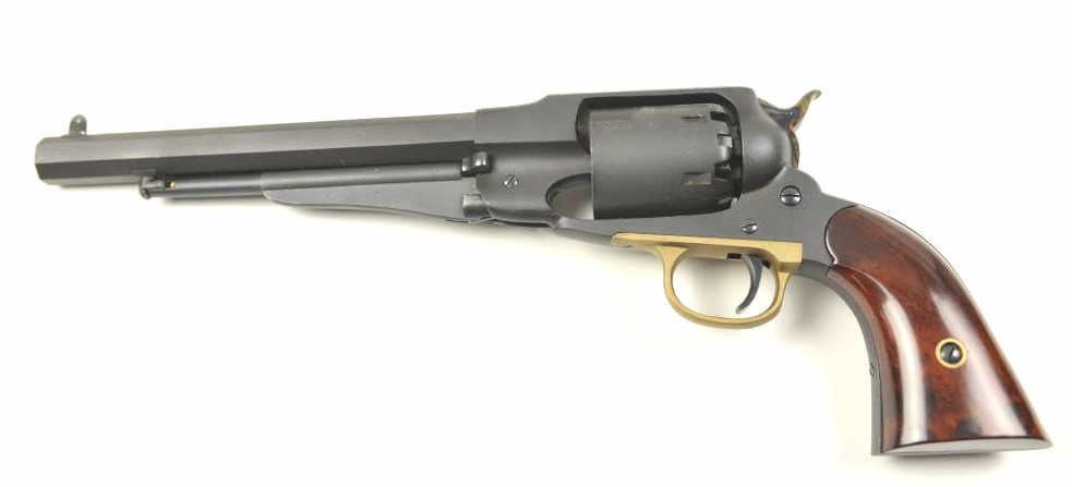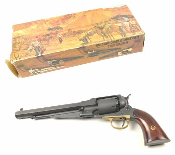 Pietta 1858 Remington reproduction black powder revolver, #A19966, matte black finish with brass trigger guard, color case hardened hammer, and walnut grips. The revolver is in fine condition overall, retaining themajority of it’s matte finish. The action is very good, grips are great, bore is bright and the revolver appears unfired. Includes the original box. (Exempt) Est. $175-350