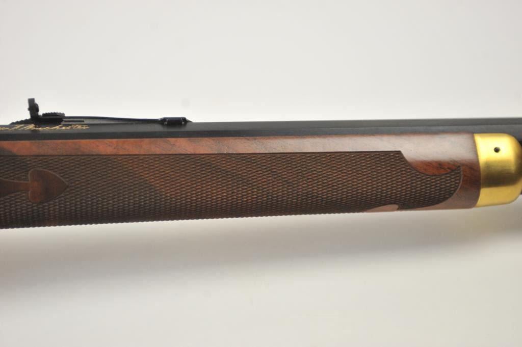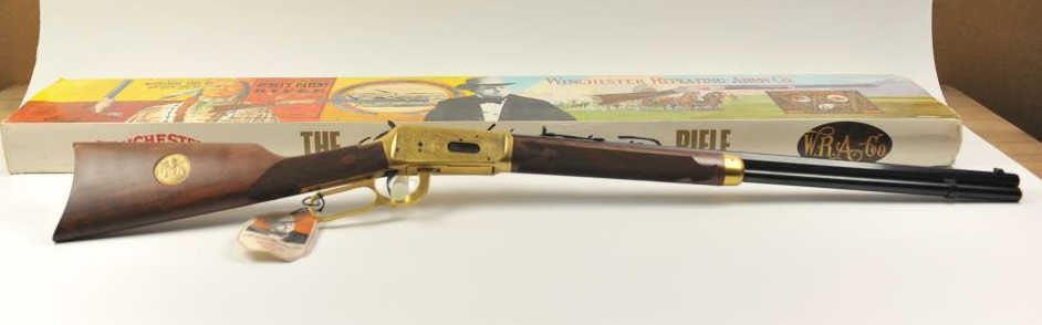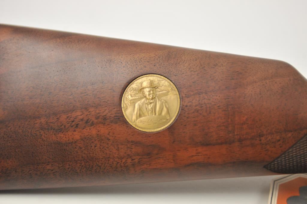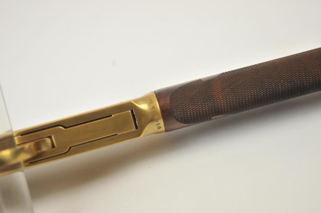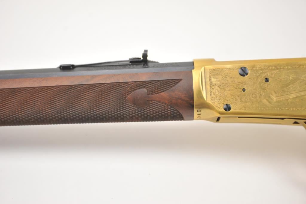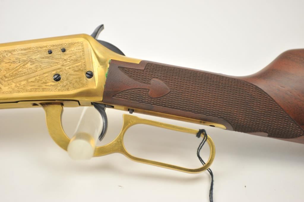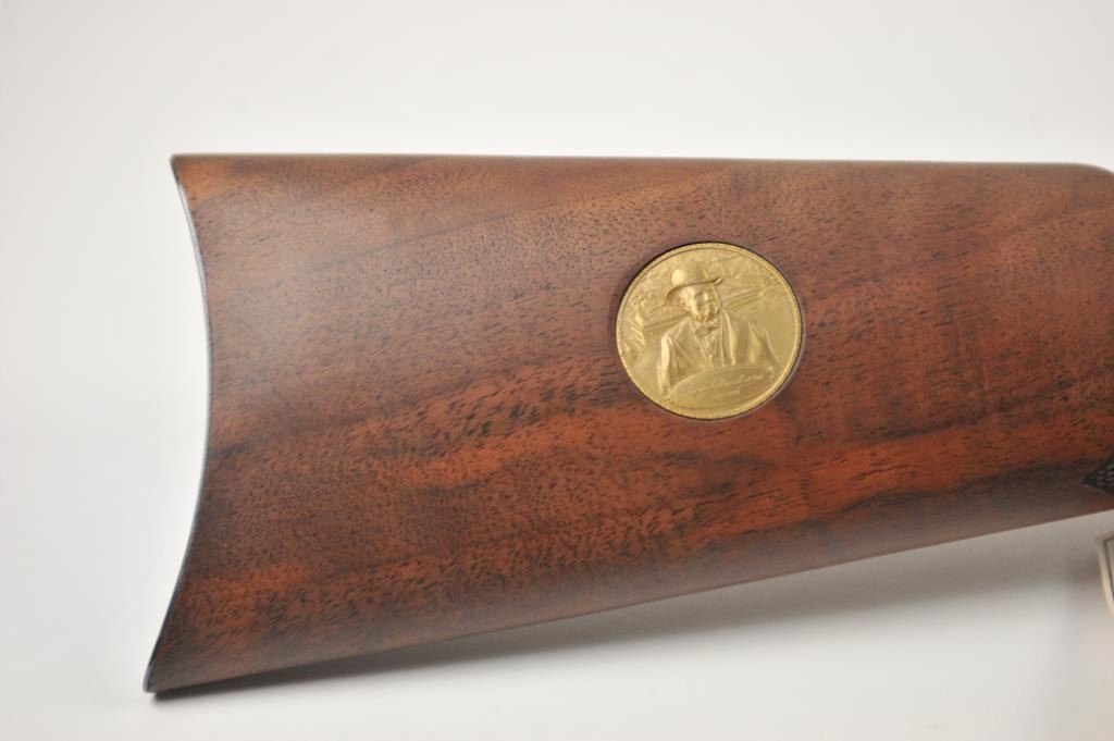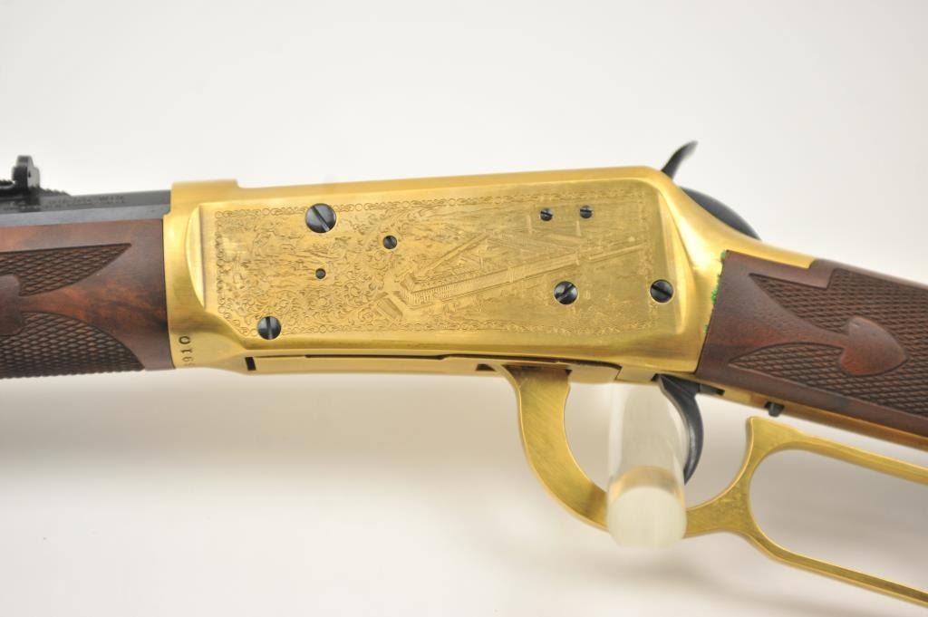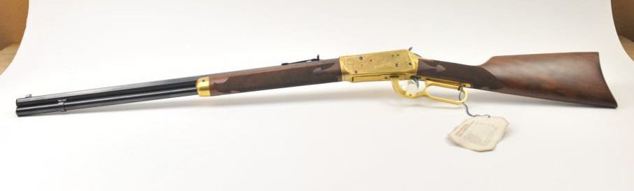 Oliver F. Winchester Commemorative lever action rifle, .38-55 caliber, Serial #OFW16910. The rifle is as new in the factory box with a 24” octagon barrel and a full-length magazine. The rifle is finishedin gold tone and blue with a beautifully engraved receiver and gold tone lever. The deluxe checkered Walnut stock has a gold tone medallion on the right side of the butt stock. The rifle comes in the factorycardboard box with matching end label and all associated packaging materials. This commemorative was released in 1980 with a total of 19,999 produced. Est.: $600-$1,200. (Modern).