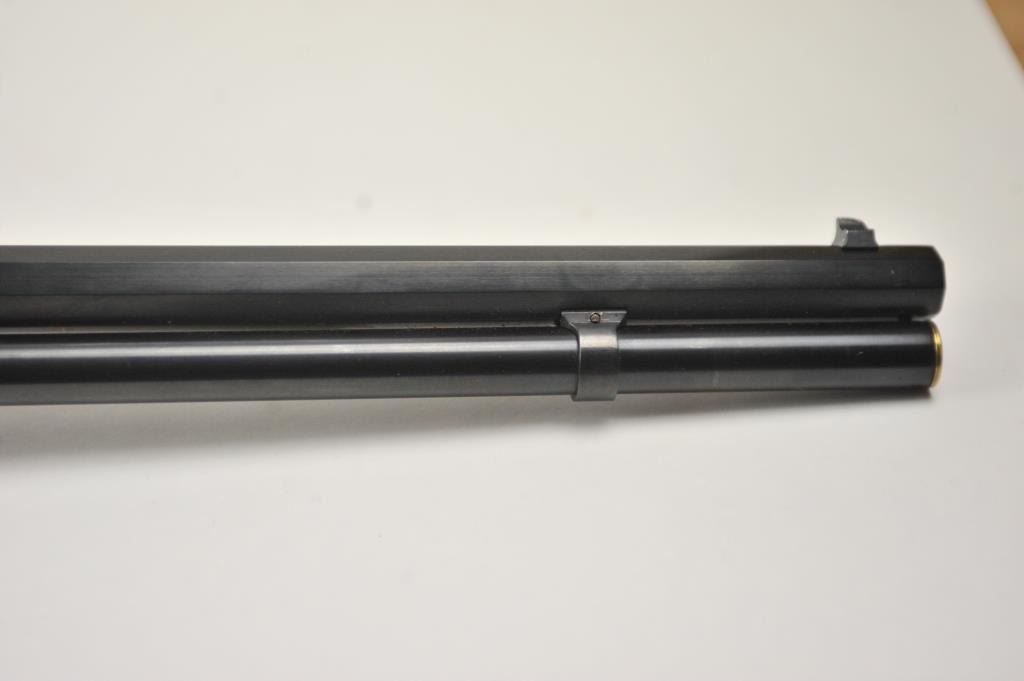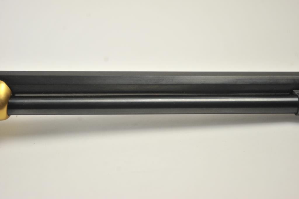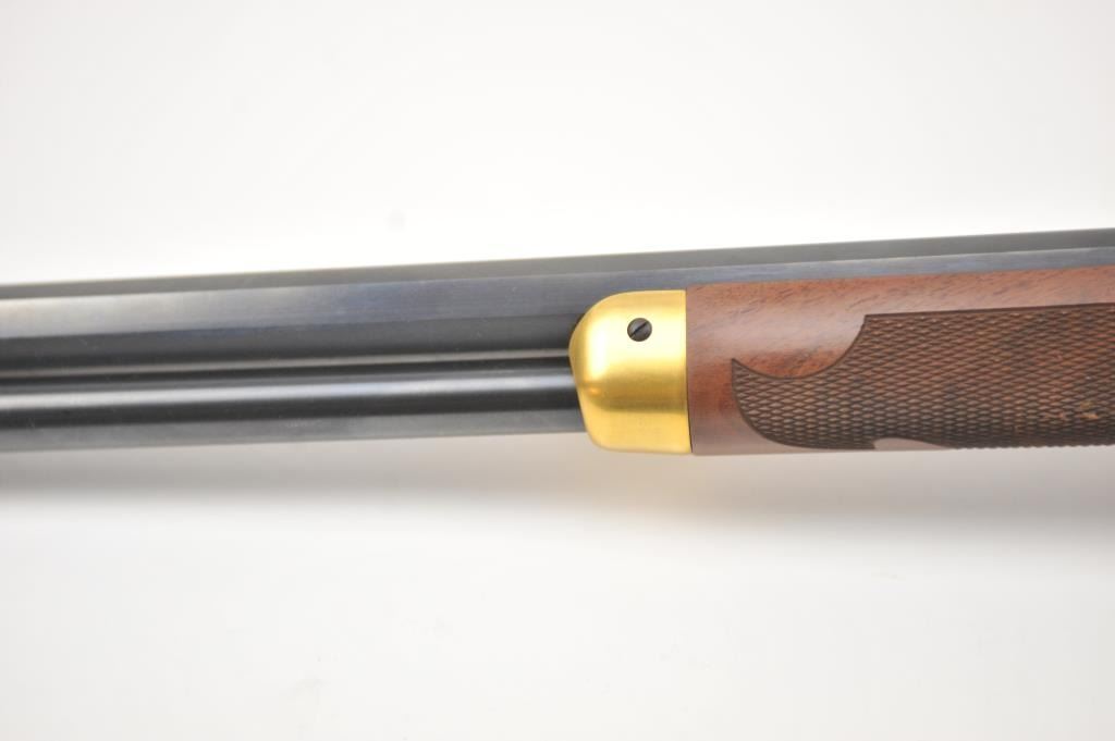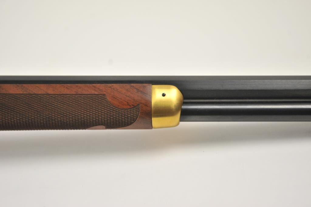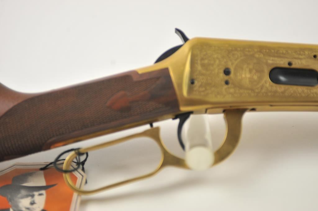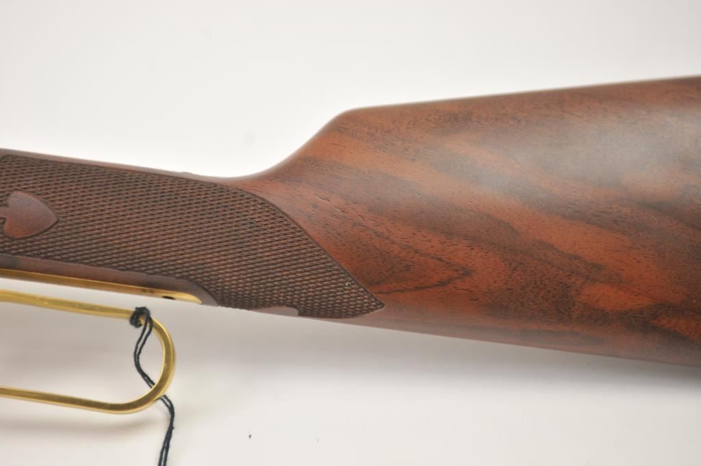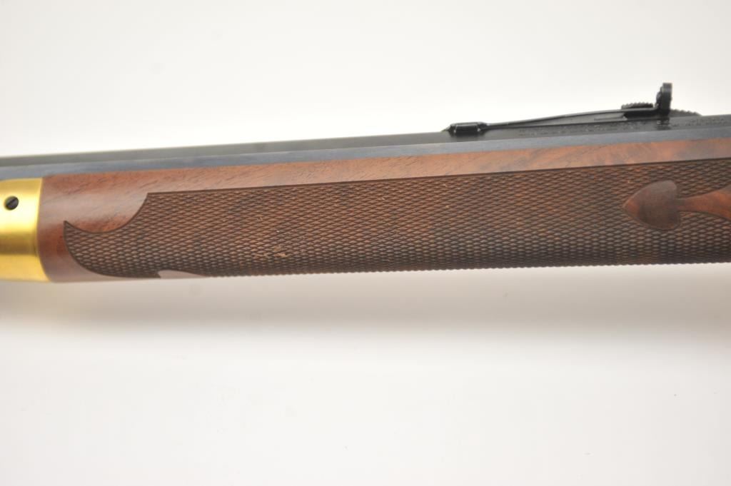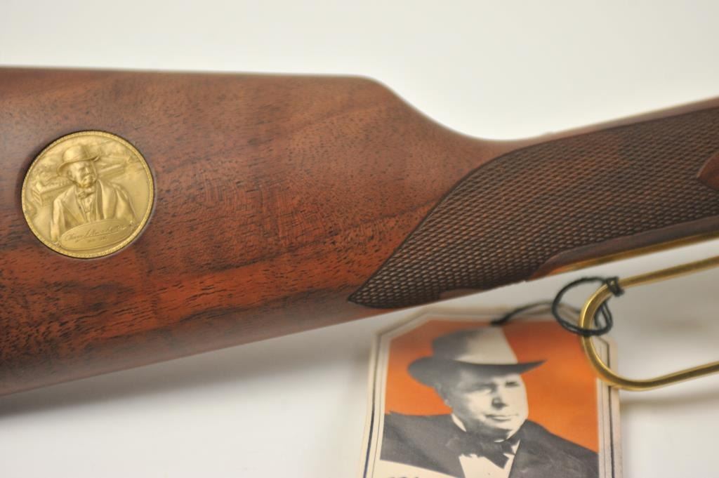 Oliver F. Winchester Commemorative lever action rifle, .38-55 caliber, Serial #OFW16910. The rifle is as new in the factory box with a 24” octagon barrel and a full-length magazine. The rifle is finishedin gold tone and blue with a beautifully engraved receiver and gold tone lever. The deluxe checkered Walnut stock has a gold tone medallion on the right side of the butt stock. The rifle comes in the factorycardboard box with matching end label and all associated packaging materials. This commemorative was released in 1980 with a total of 19,999 produced. Est.: $600-$1,200. (Modern).