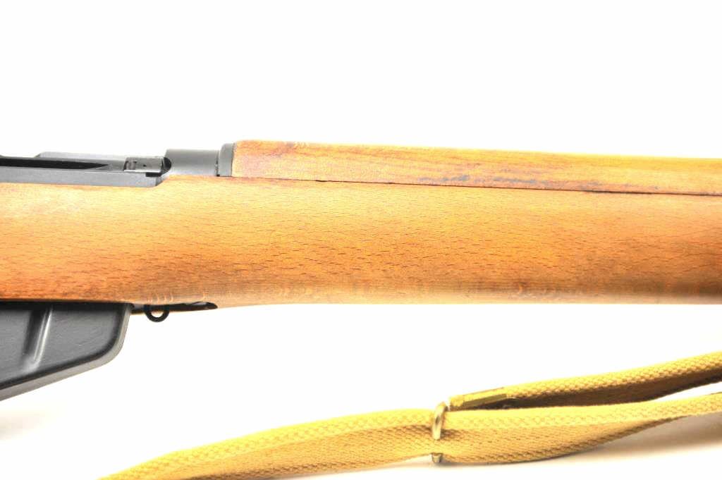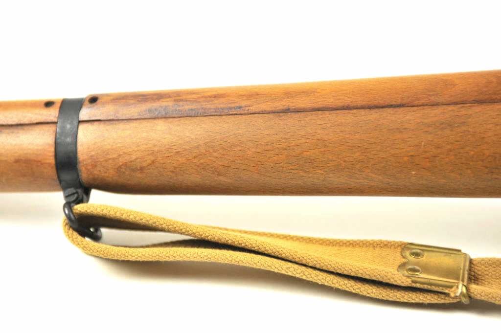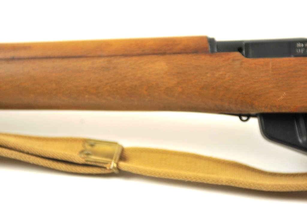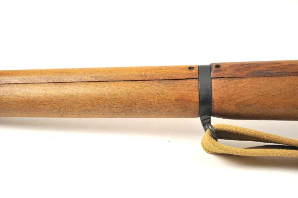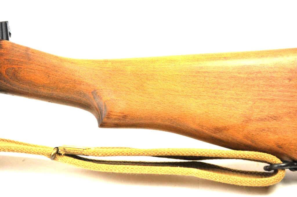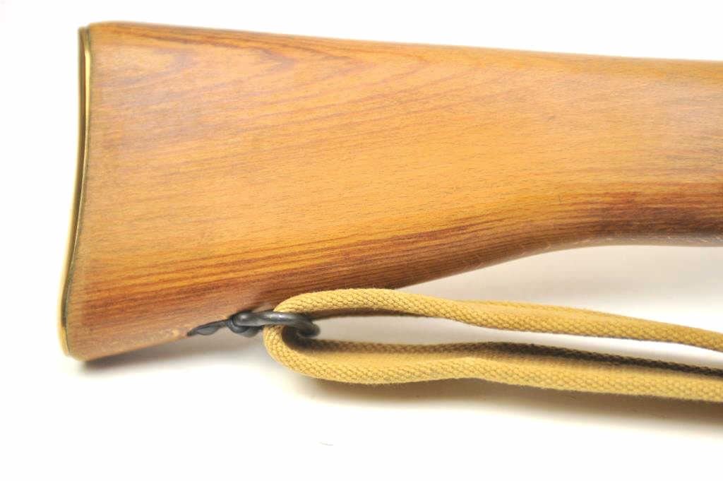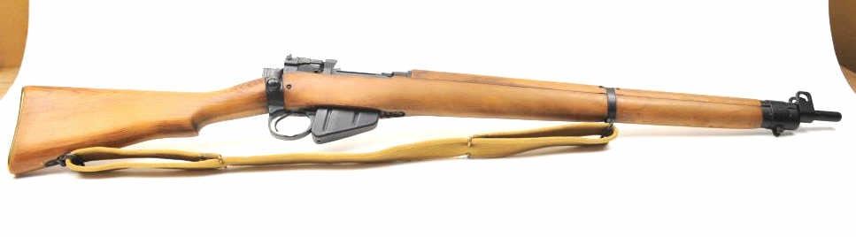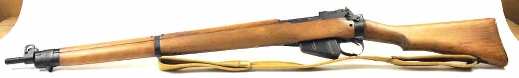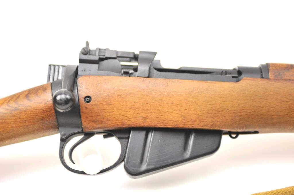 British Enfield No. 4 Mk. II bolt action rifle, .303 British caliber, Serial #UF55A10693. The rifle is in excellent overall condition with a 25” barrel with a protected blade front and folding militarytanget style rear sights. The rifle was one of approximately 168,807 built by ROF Fazakerley for the Irish contract beginning November 1954. This particular gun is dated 1955. The rifle has all matching visibleserial numbers including the stock. The Irish Republic ordered 50,000 of the later Enfield with the MK I Singer sight, two-stage trigger and smooth Beech wood stock with brass hardware. The bore is bright withtraces of the original cosmoline, the action works well and the markings are sharp on this as new unissued Enfield. The lot includes a correct. Period gold canvas sling with brass hardware. Est.: $600-$1,200. (C+R).