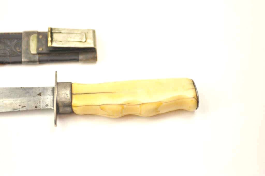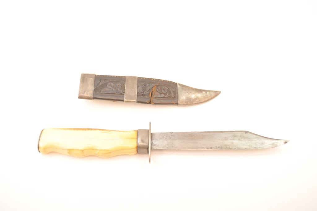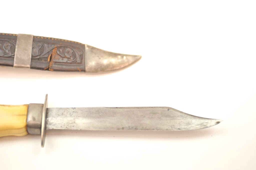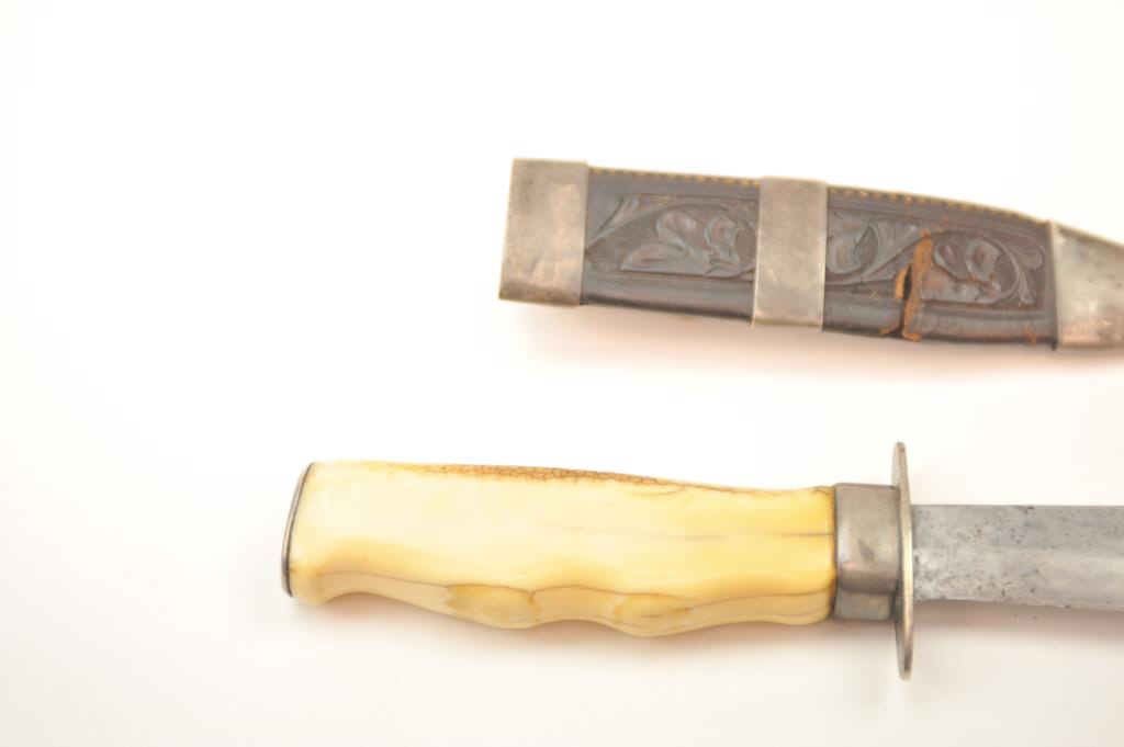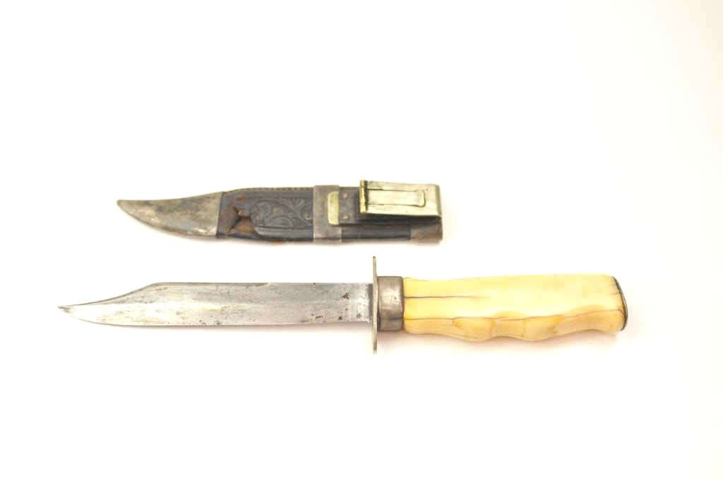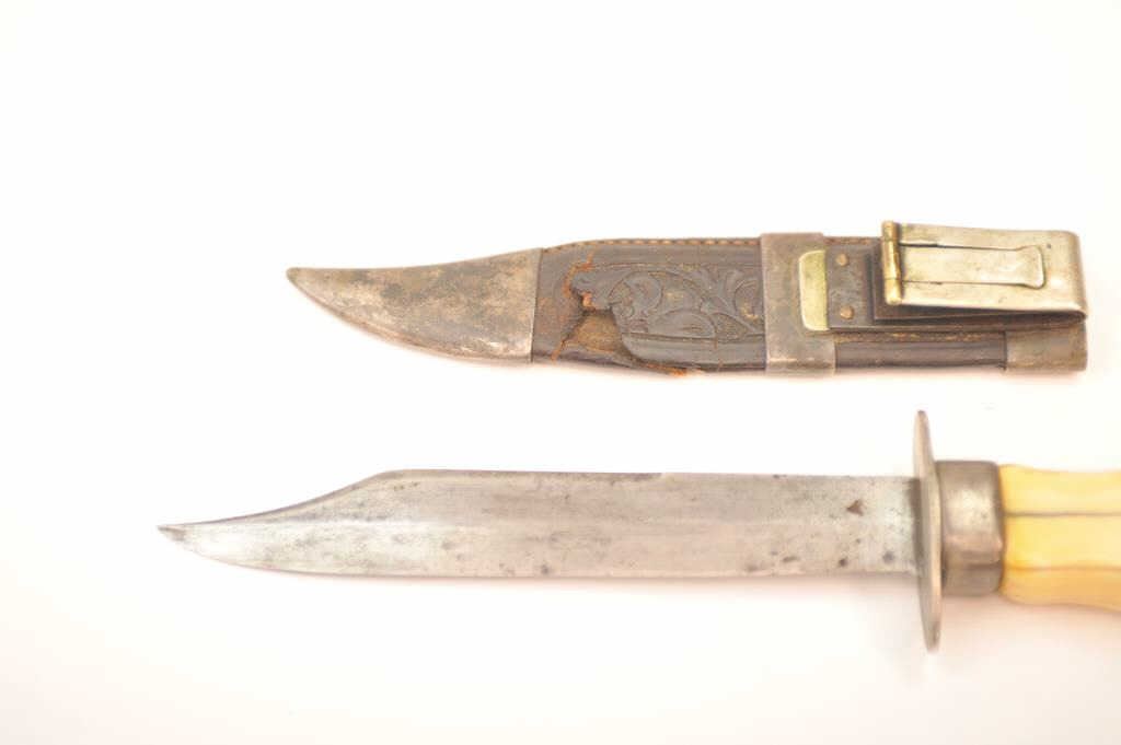 Silver mounted California belt knife with characteristic belt hook on scabbard and finger grooved marine ivory grip circa 1850-1880’s in the classic gold rush style. The knife measures 10 ¾” in overall lengthwith a 6” clipped point thin steel blade with a point measuring ¾” from edge to back. The blade shows minor pitting and erosion. The grip shows deep patina with age cracks. The leather scabbard shows California stylecarving and is fair with some tears and small losses. This knife is just the type worn by successful gentlemen and thugs on the Barbary Coast as male jewelry. Est.: $750-$1,500.