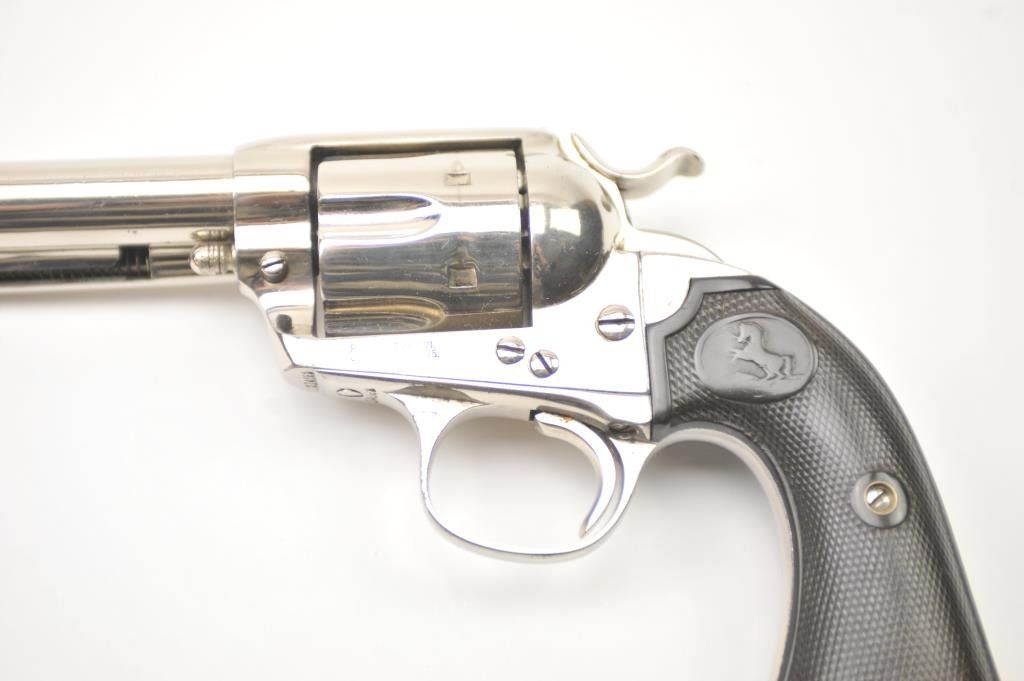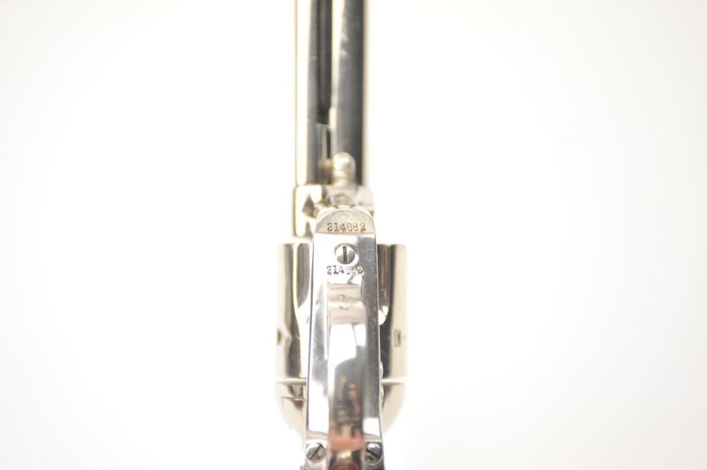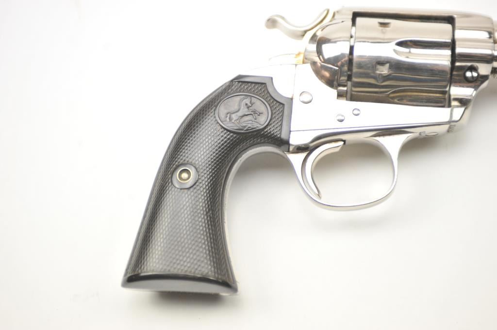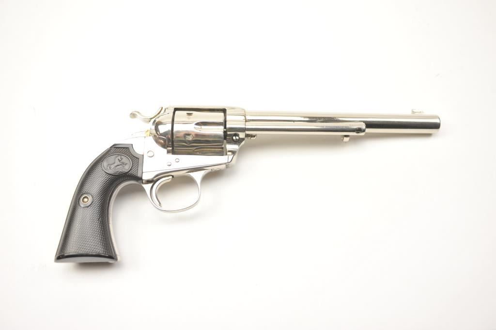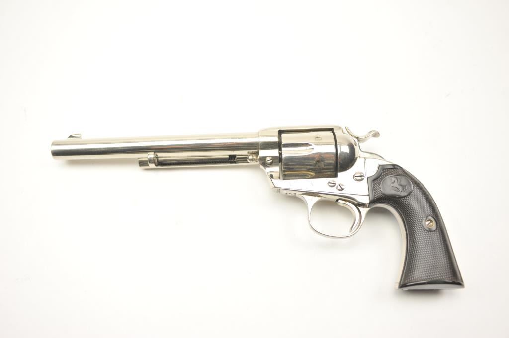 Colt Bisley Model SAA revolver, .32 WCF caliber, Serial #314682. The pistol is in fine overall condition as re-finished with a 7 ½” barrel. The pistol retains approximately 95-96% of an old, qualityre-nickeled finish with the front sight reduced slightly. All matching visible serial numbers. The checkered hard rubber grips are in very good condition, fit well and appear original to the gun. The bore isfair and the action works well with good timing. A nice Bisley circa 1910. Est.: $700-$1,400. (C+R).