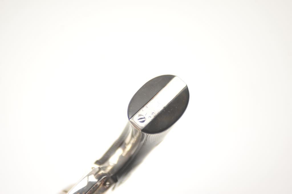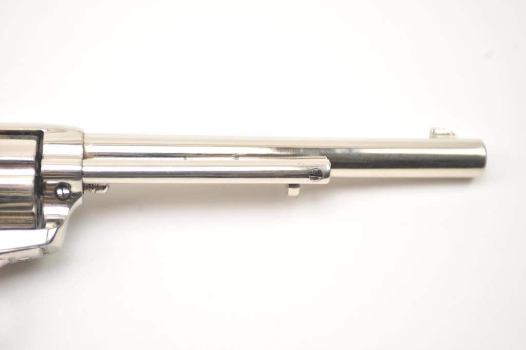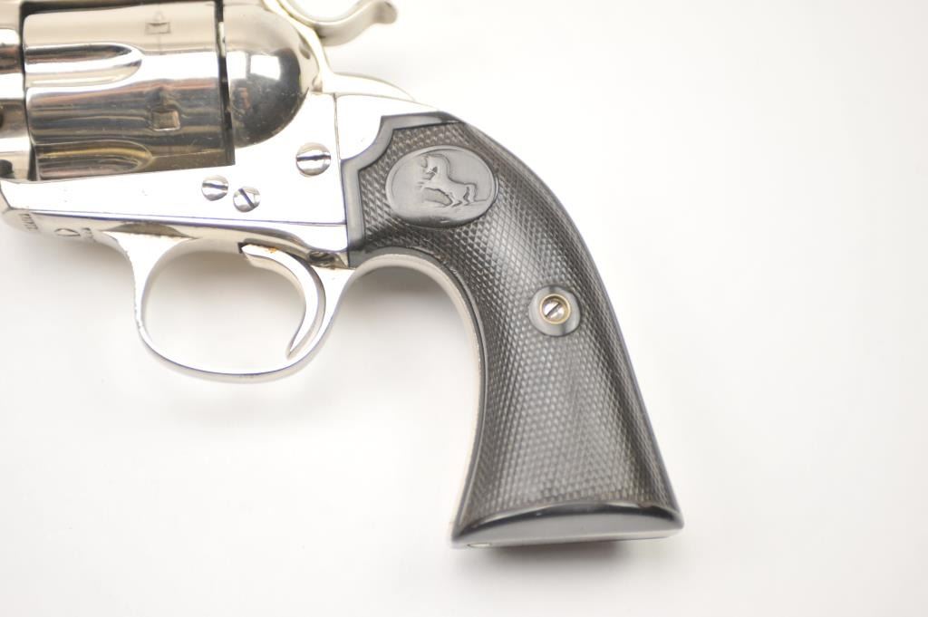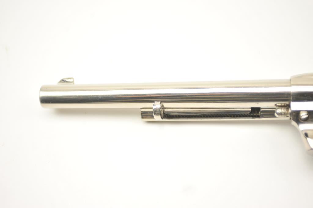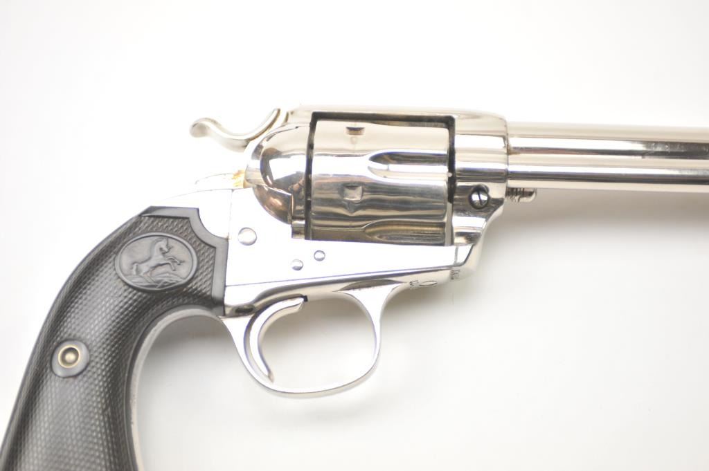 Colt Bisley Model SAA revolver, .32 WCF caliber, Serial #314682. The pistol is in fine overall condition as re-finished with a 7 ½” barrel. The pistol retains approximately 95-96% of an old, qualityre-nickeled finish with the front sight reduced slightly. All matching visible serial numbers. The checkered hard rubber grips are in very good condition, fit well and appear original to the gun. The bore isfair and the action works well with good timing. A nice Bisley circa 1910. Est.: $700-$1,400. (C+R).