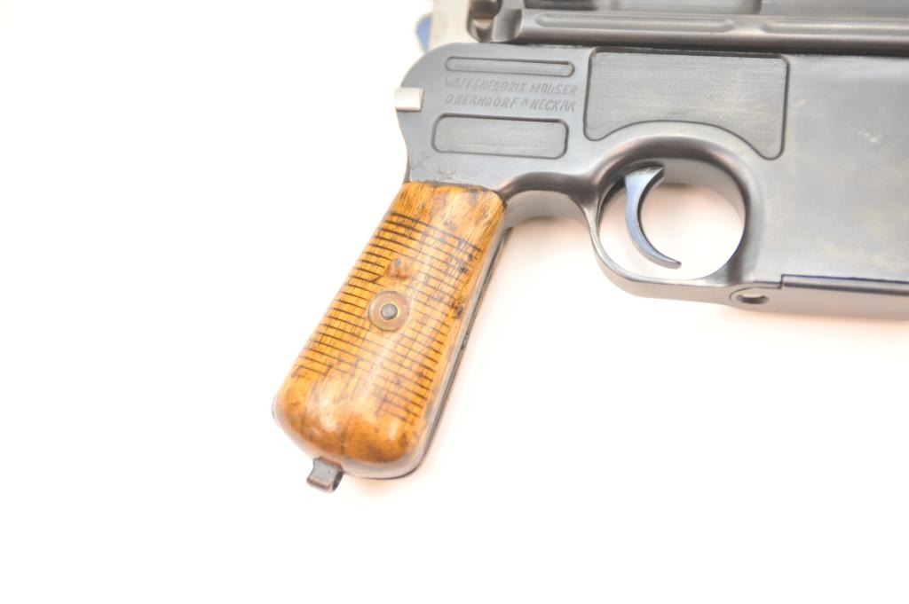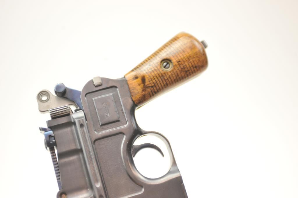 Mauser 1896 semi-automatic pistol, .30 Mauser caliber, Serial #519525. The pistol is in nearly excellent overall condition as professionally re-finished. The pistol retains nearly all of a quality re-blue withall matching serial numbers and bright niter blue on the small parts. The grips have been redone with an extra coat of lacquer added. The bore is good, the action it functions well and the markings are crisp on thisdesirable Bolo Mauser. Est.: $750-$1,500. (C+R/PPT).